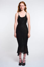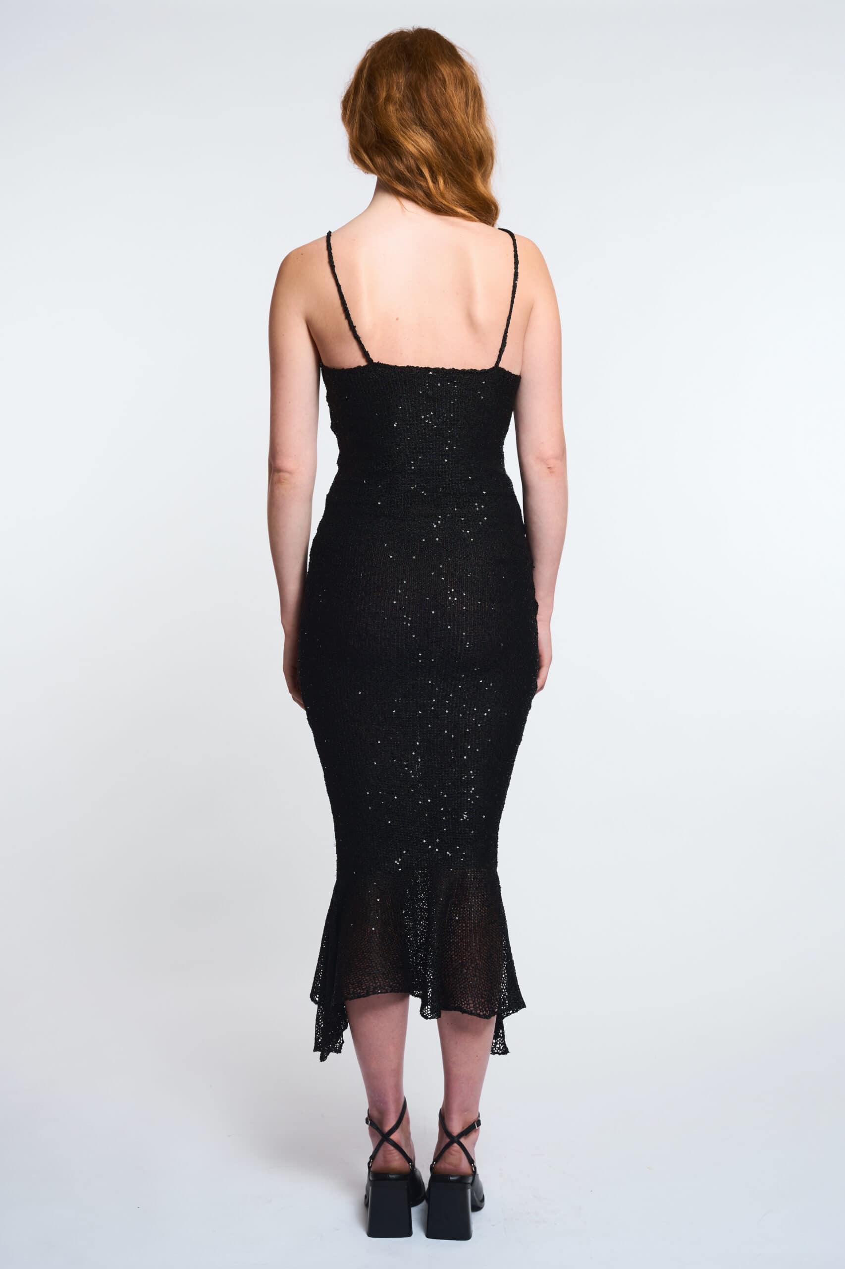 Robe longue sirène tricotée noire avec fil à sequins. Avec ses fines bretelles et son décolleté arrondi, sa forme sirène assure une coupe flatteuse pour s’ajuster naturellement sur vos courbes. Finitions inspiration queue de sirène, fente sur chaque côté.