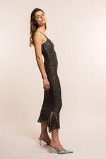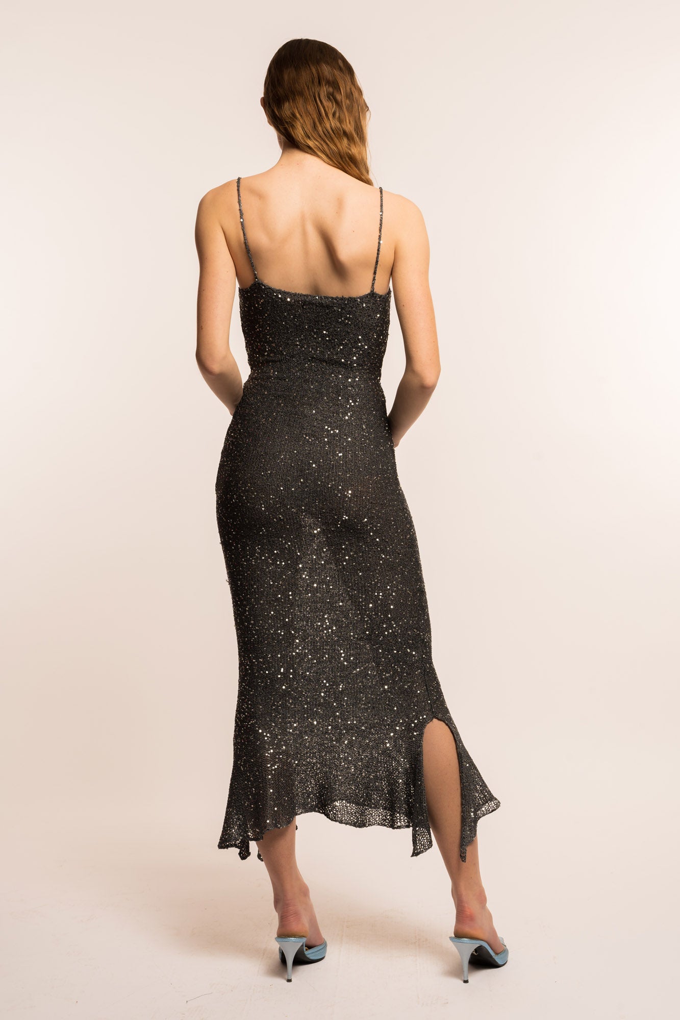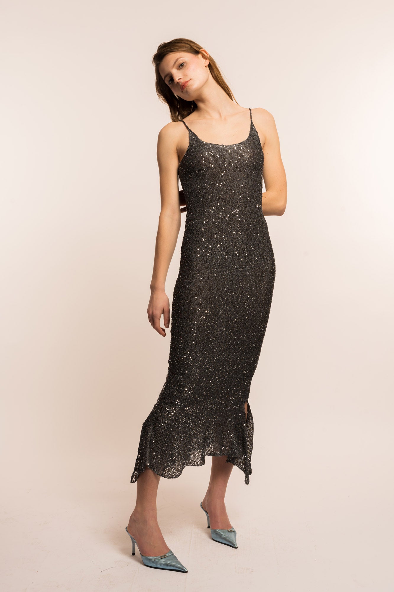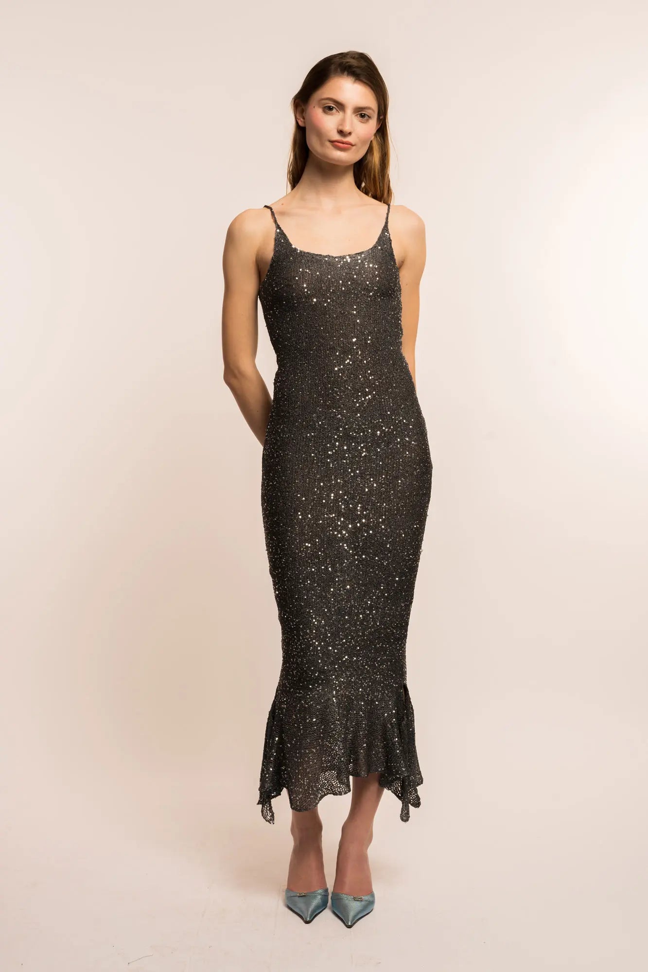 Notre longue robe sirène tricotée à sequins argentés de rêve.