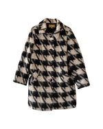 Manteau pied de poule en laine et mohair, fluffy, col claudine, forme droite, fabriqué en Italie, taille 38 et 40 porté ici sur une personne T40.