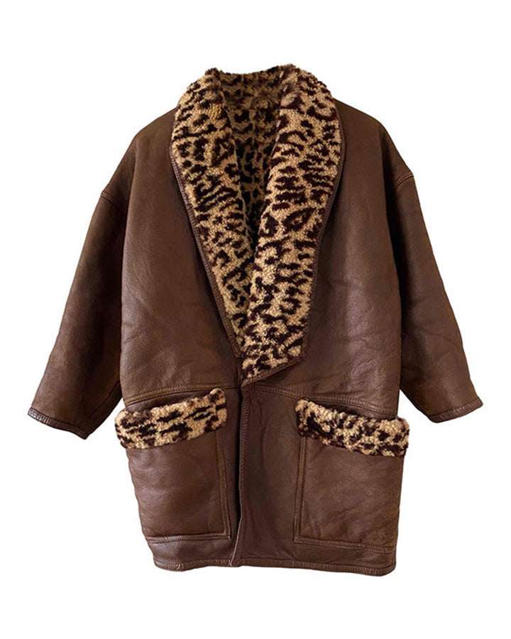 Peau lainée léopard, en mouton retourné extérieur cuir chocolat, intérieur mouton imprimée léopard camel et chocolat, grand col châle plongeant et poches en mouton léopard, fabriqué en Italie, taille 36 et 38 porté ici sur un mannequin T36 et une personne T40.