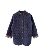 Veste matelassée bleu marine, bordures et col en velours côtelé, doublure à carreaux tartan en coton , matelassé ouatine croisillons, esprit barn-jacket, boutons dorés gravés oiseaux, fabriquée en France, convient aux tailles 38 et 40 portée ici sur une personne