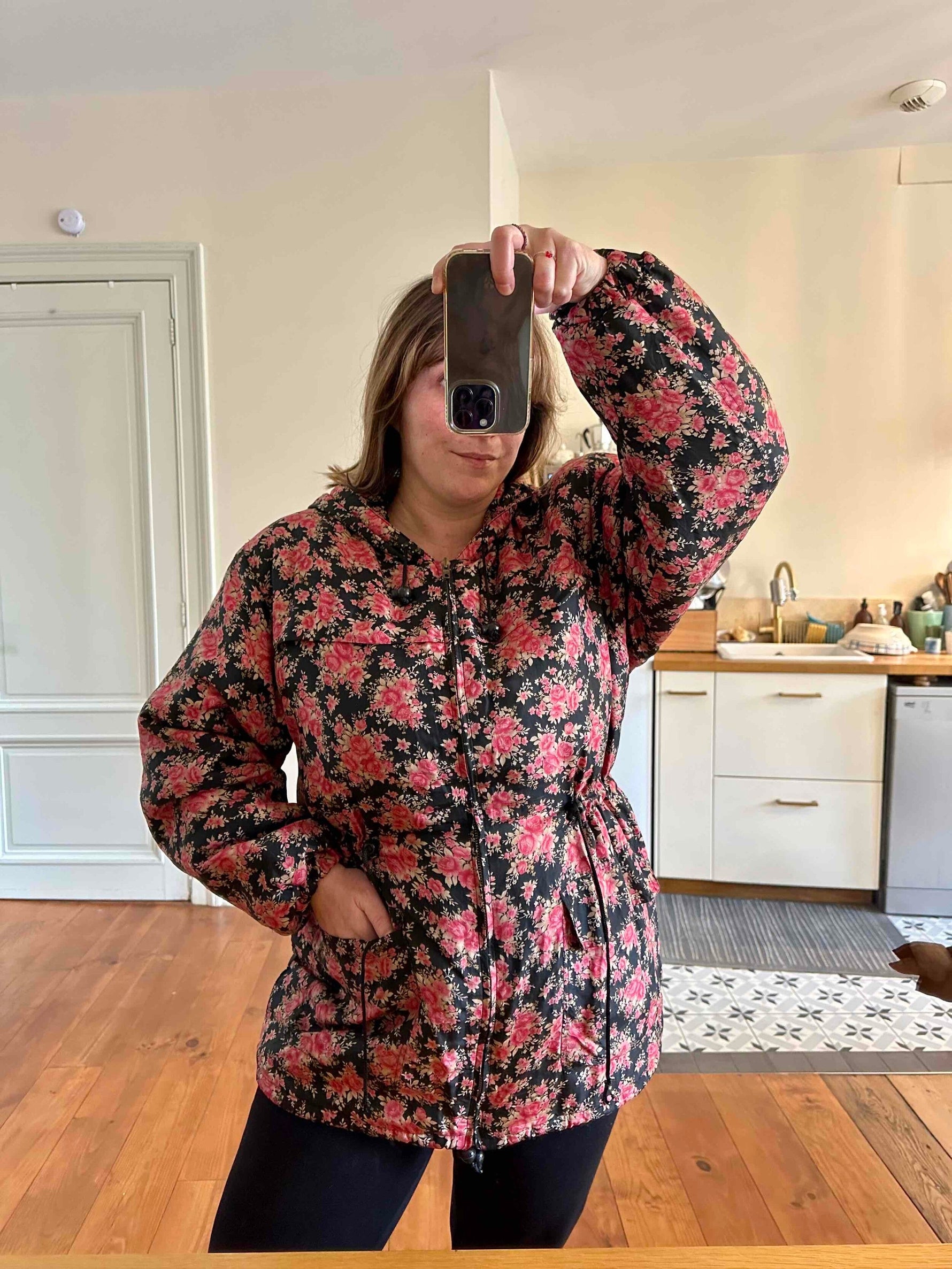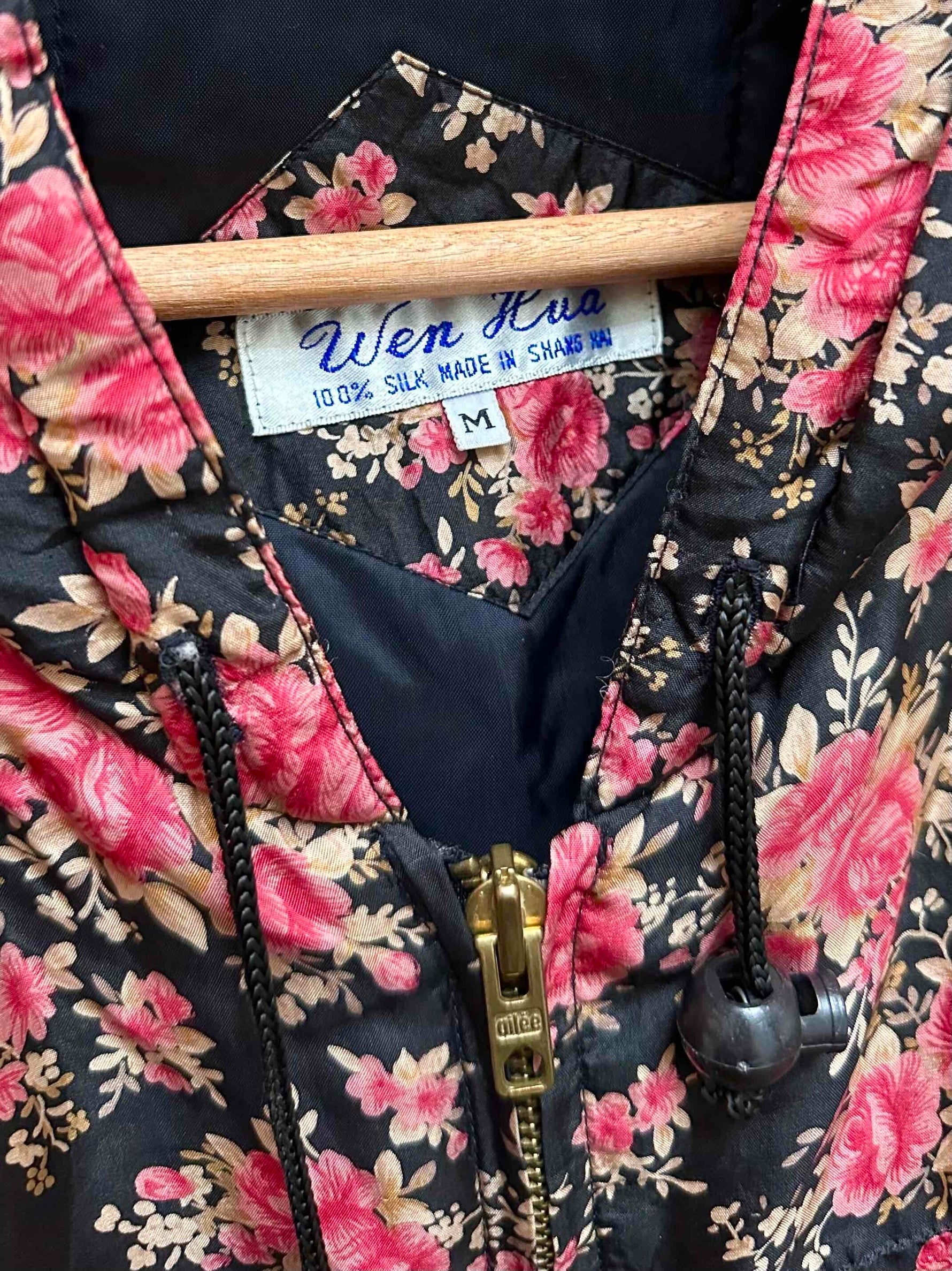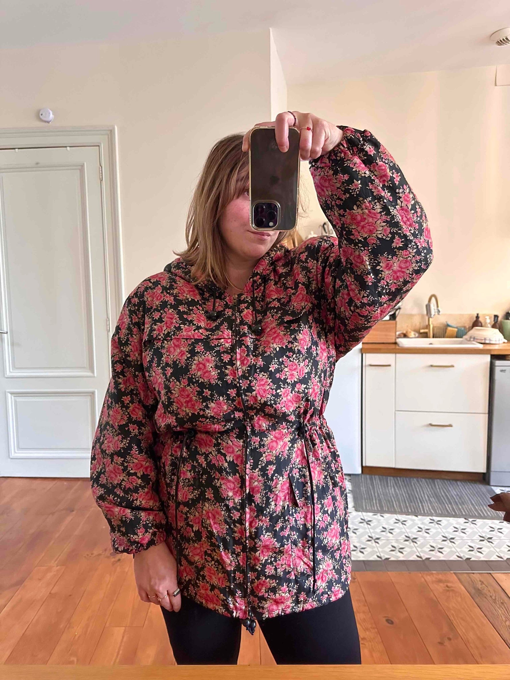 Prix unitaire parDoudoune en soie, imprimée fleurs roses fuschias, rouges et beiges, taille et bas à resserrer par cordons, capuche, rembourrée matelassée, années 80s, convient aux tailles 38 et 40 portée ici sur une personne T40.