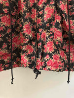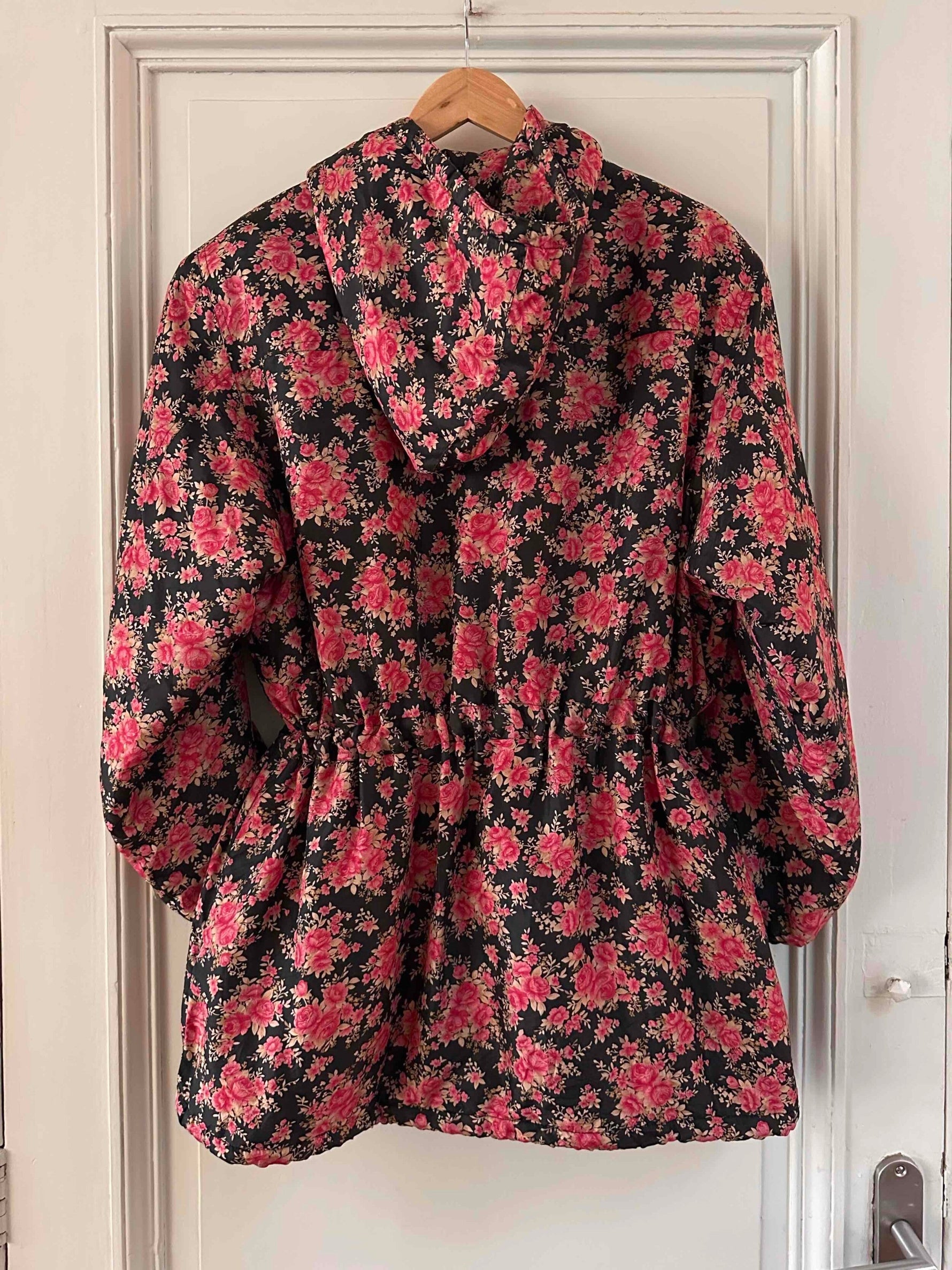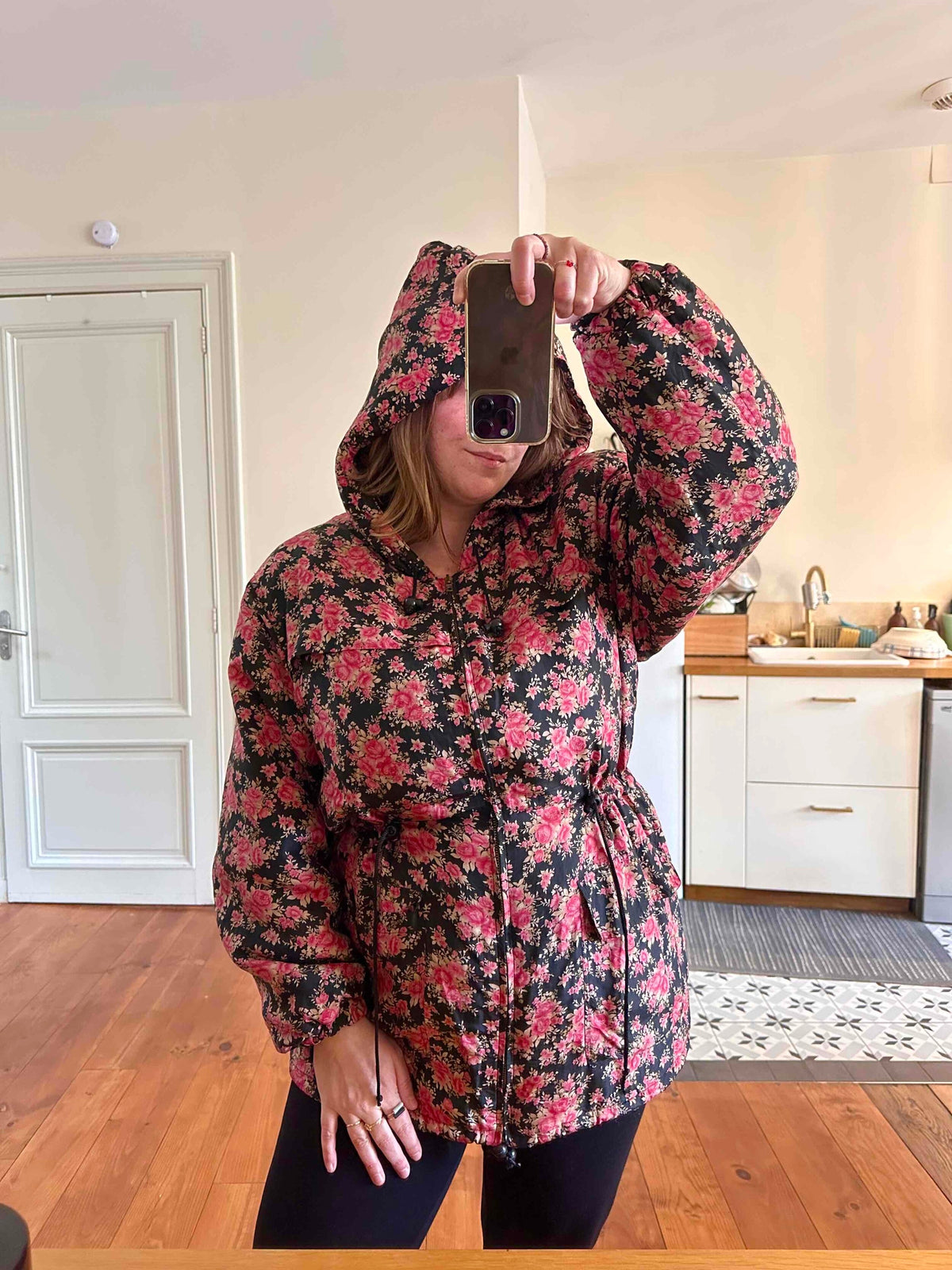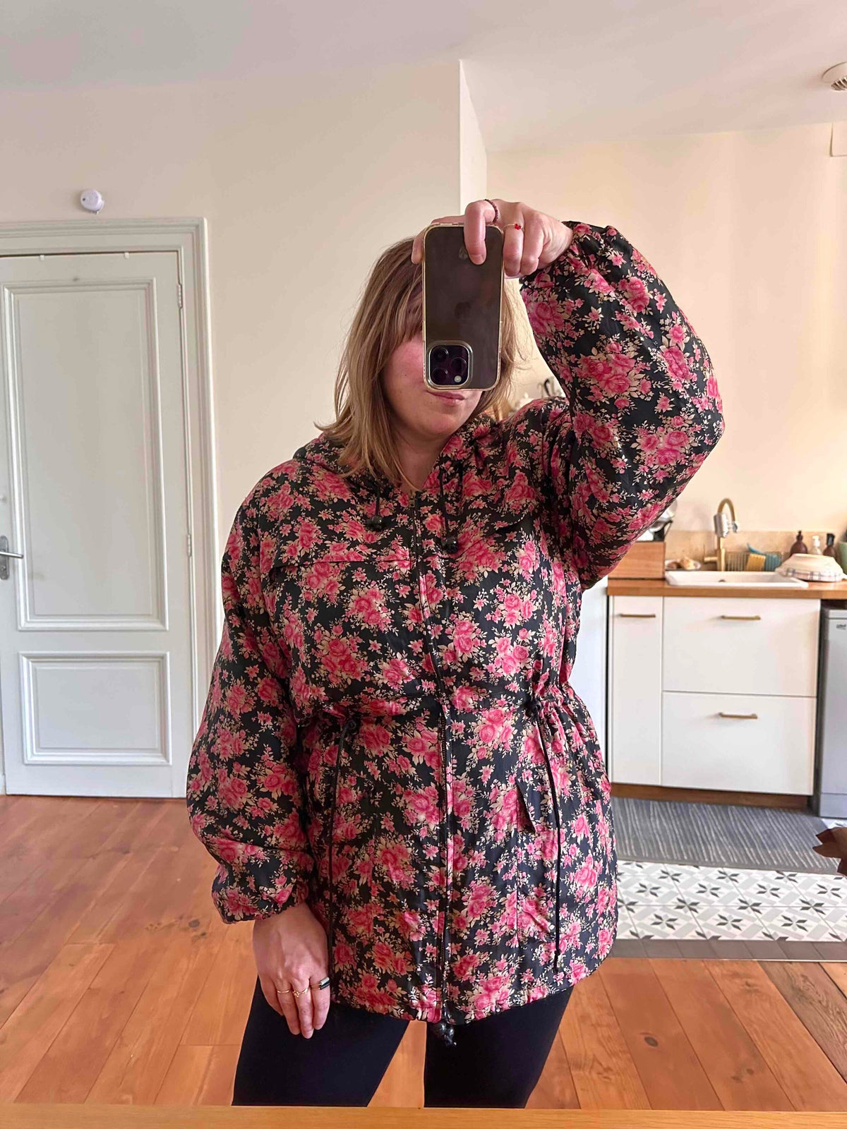 Prix unitaire parDoudoune en soie, imprimée fleurs roses fuschias, rouges et beiges, taille et bas à resserrer par cordons, capuche, rembourrée matelassée, années 80s, convient aux tailles 38 et 40 portée ici sur une personne T40.