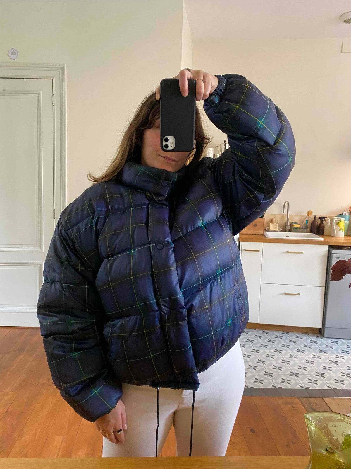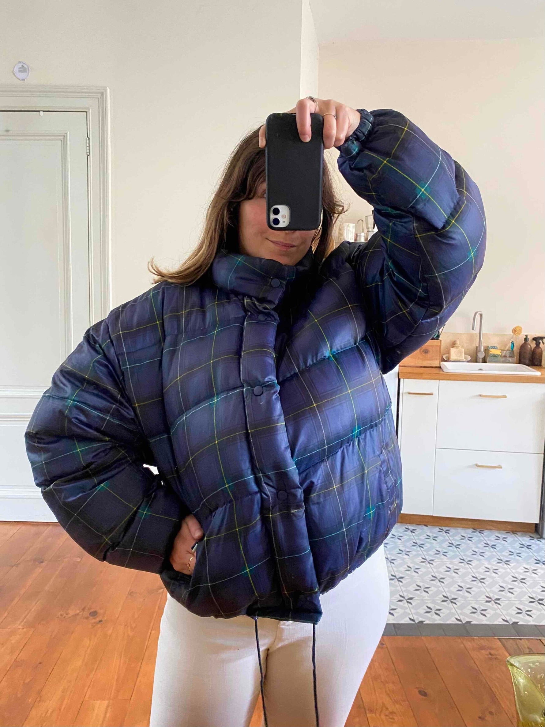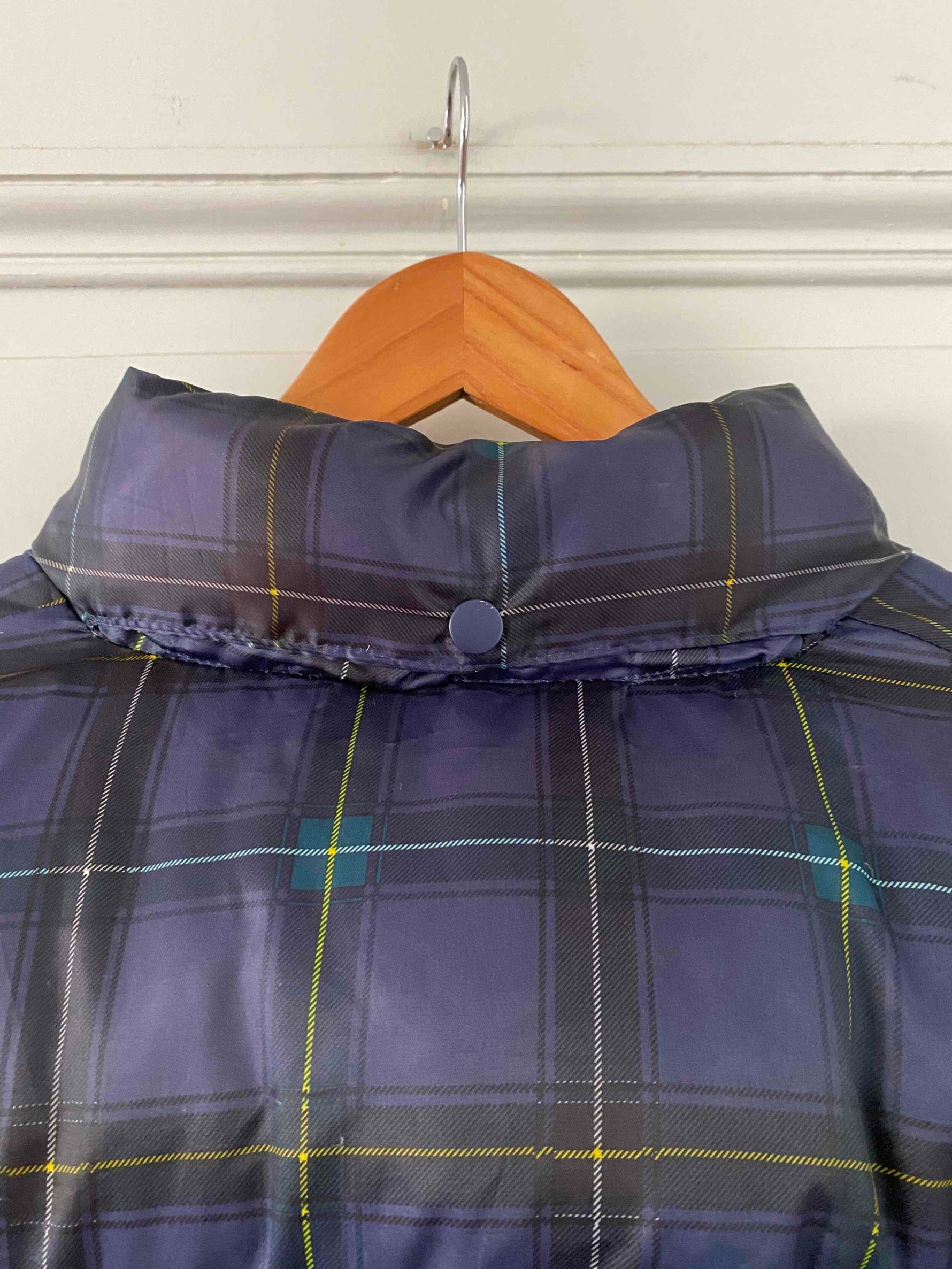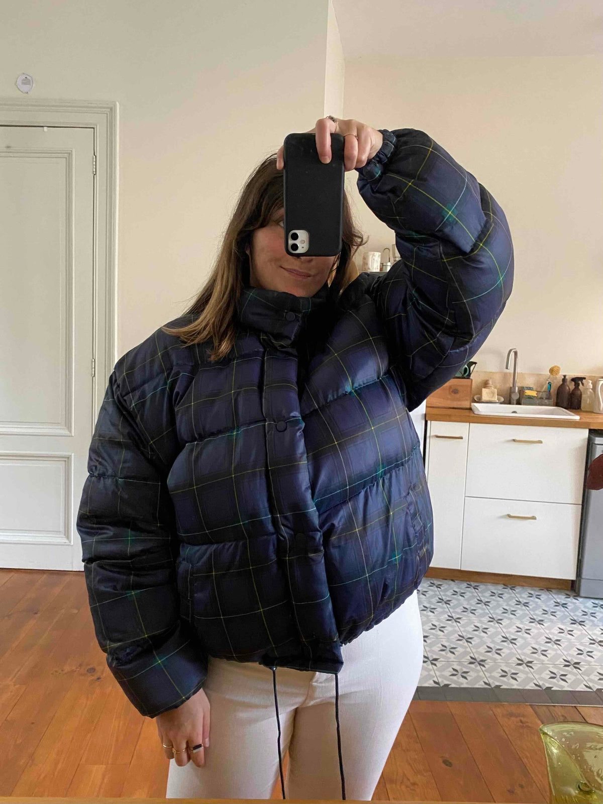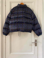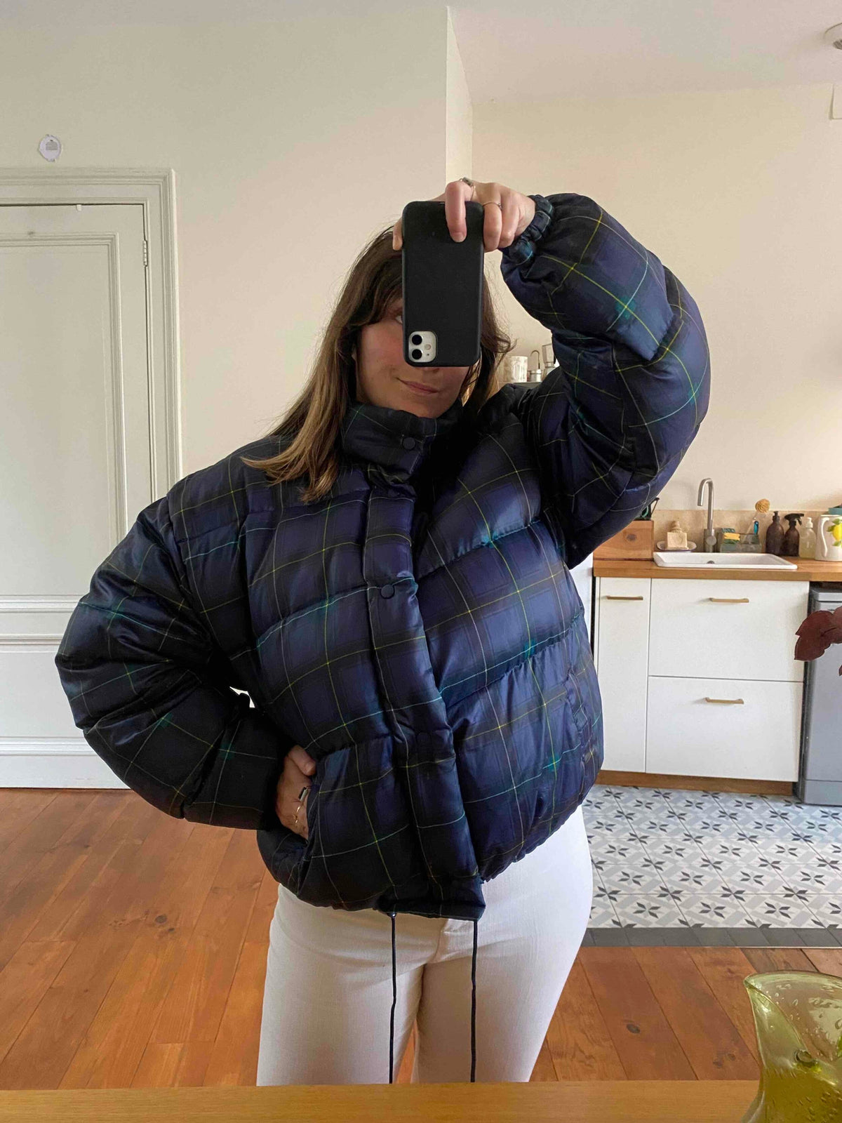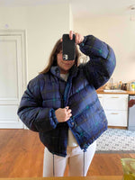 Prix unitaire parDoudoune écossaise 90's, rembourrée en duvet véritable, imprimée carreaux écossais bleu foncé, vert sapin et jaune, fermeture éclaire et boutons pressions, capuche intégrée dans le col à boutons pressions, bas à resserrer par deux liens, notée XL, convient aux taille 38/40/42, portée ici sur une personne T40.
