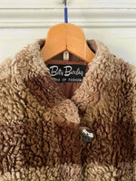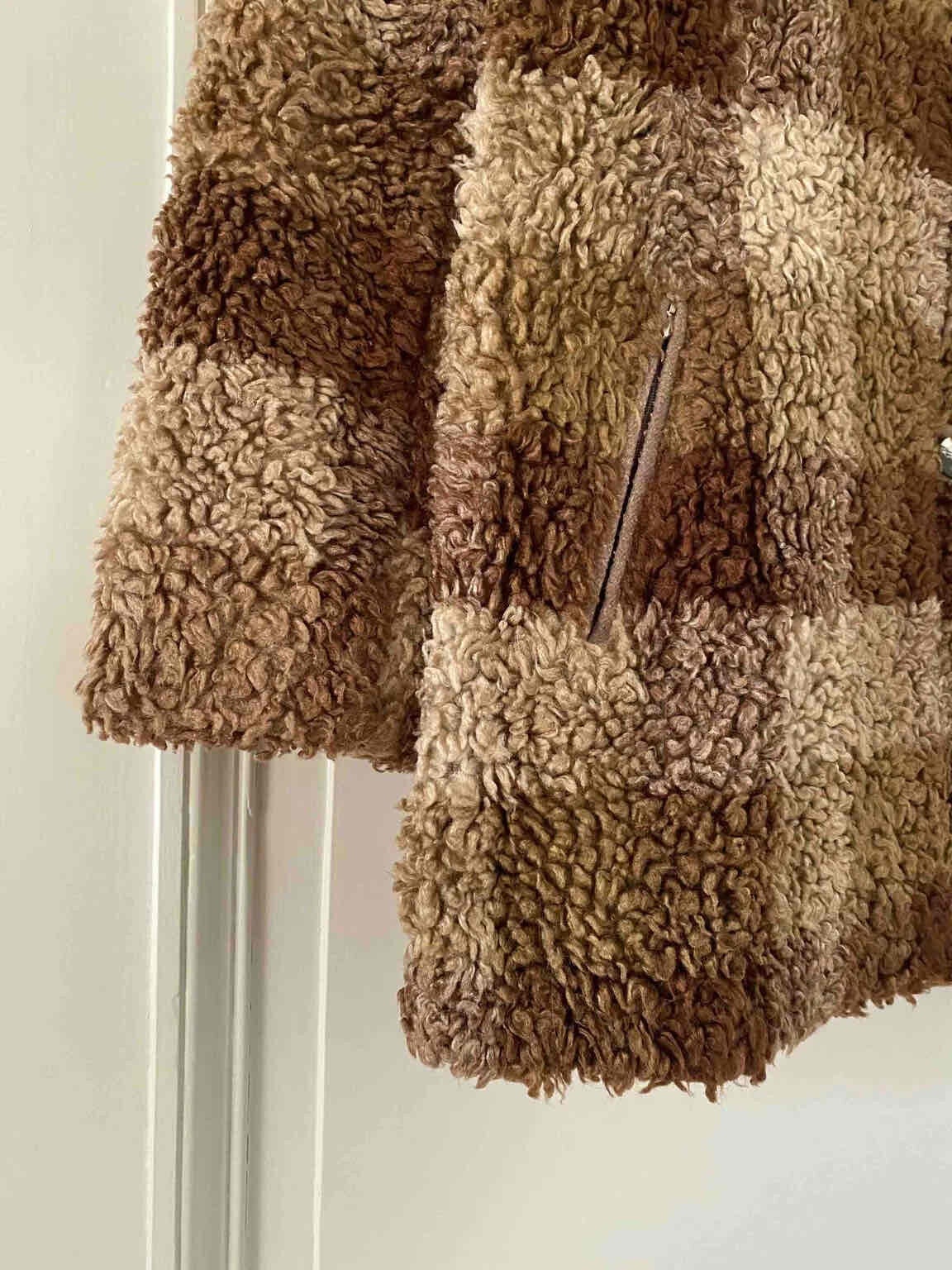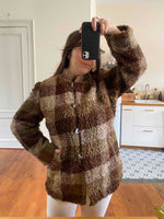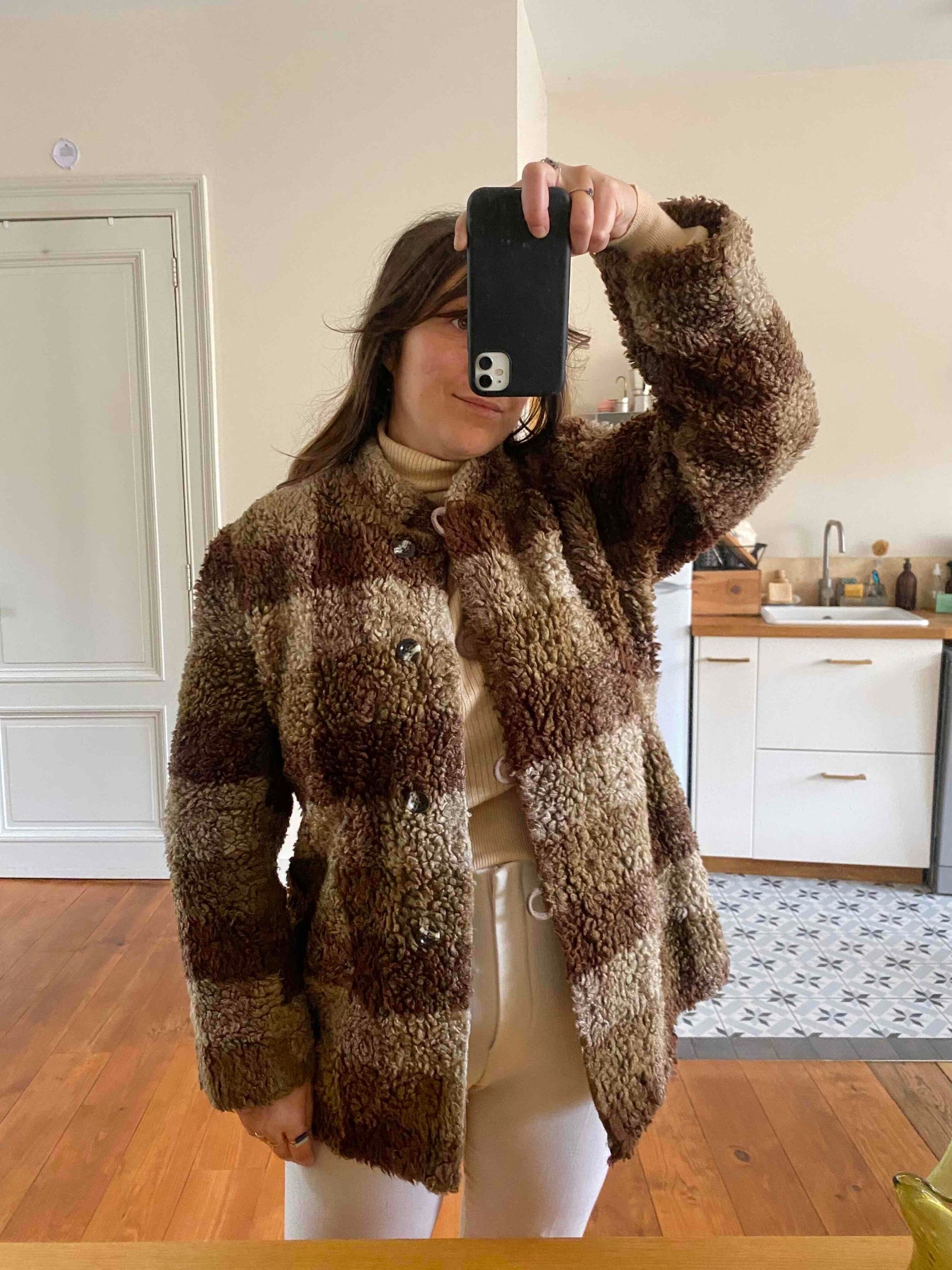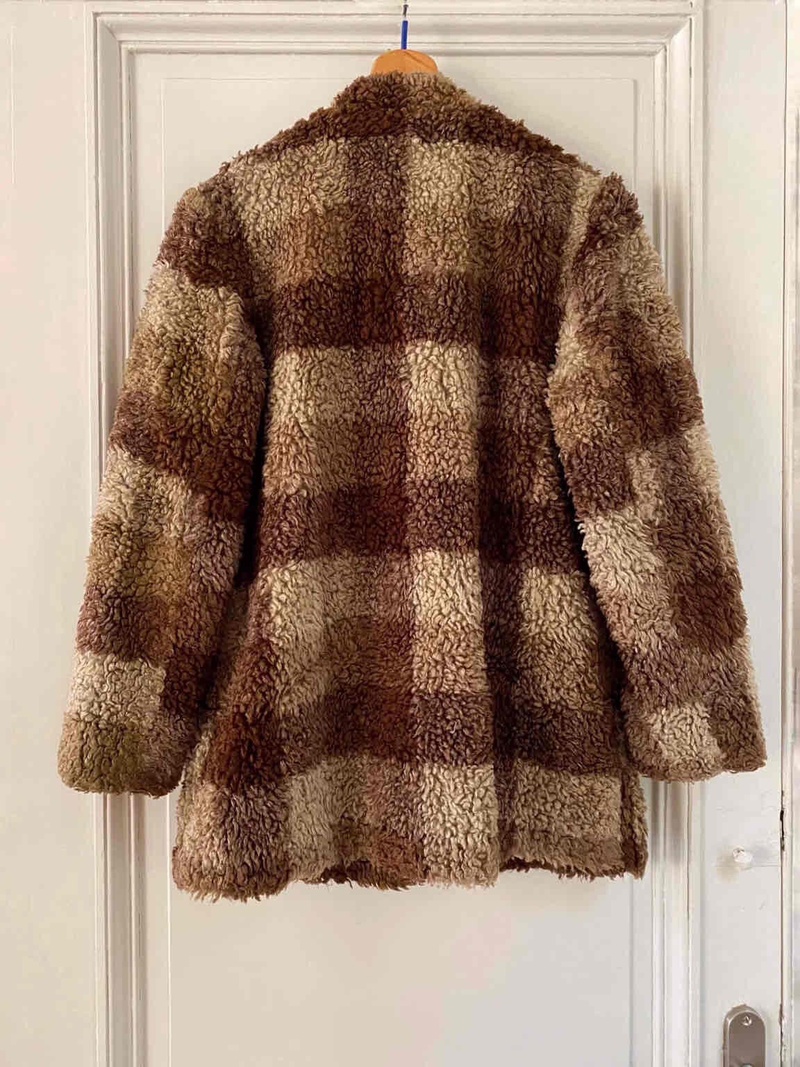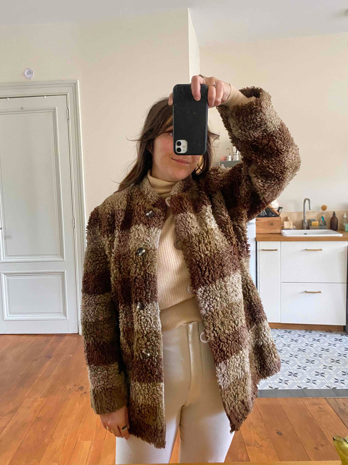 Prix unitaire parManteau imitation mouton, à carreaux, effet shearling mouton bouclé peau lainée, col montant, boutons à passants, dans les tons bruns chocolat, beige et camel, finitions en drap de laine, Betty Barclay, années 70’s, taille 38 et 40 porté ici sur une personne taille 40.