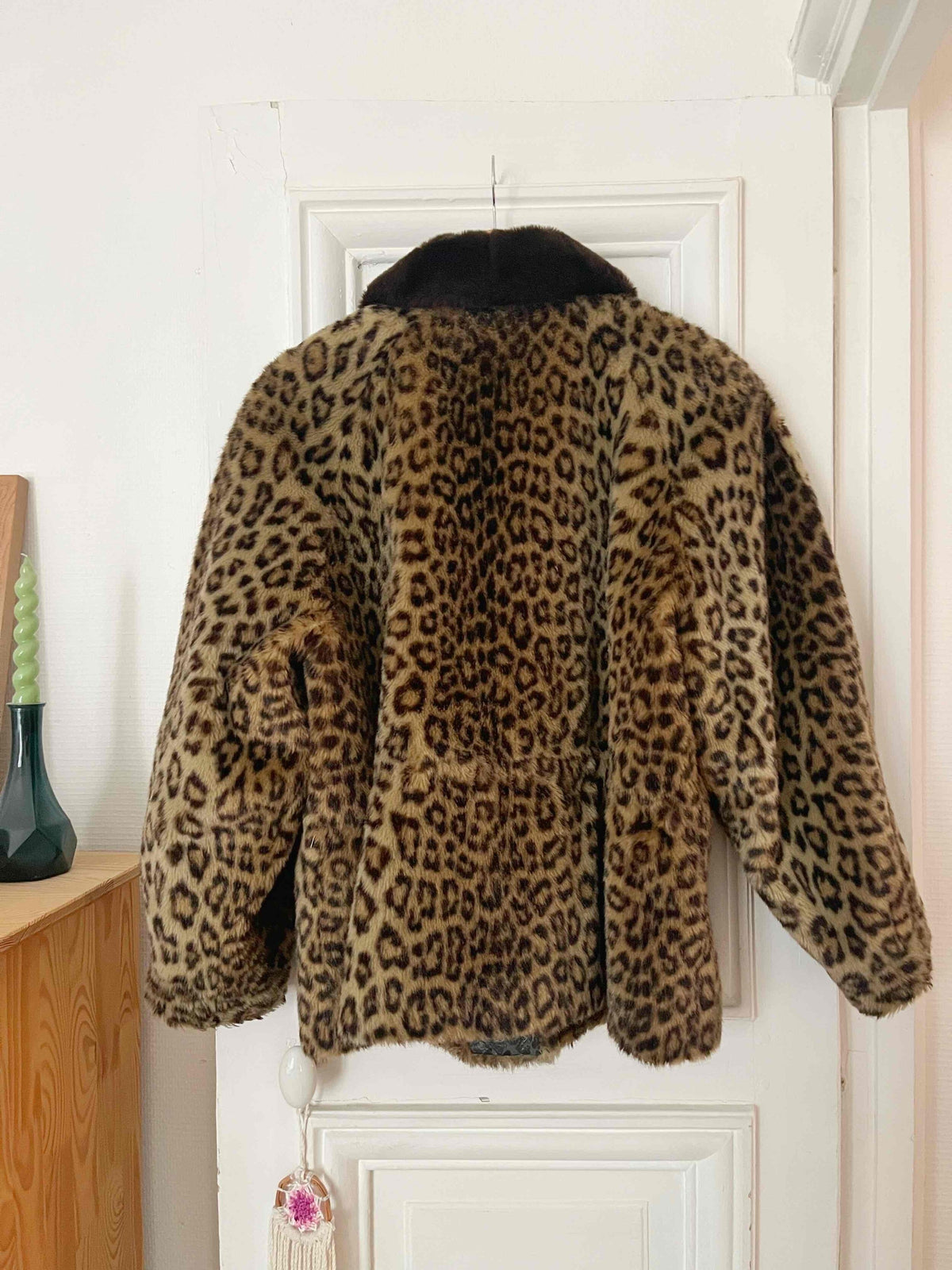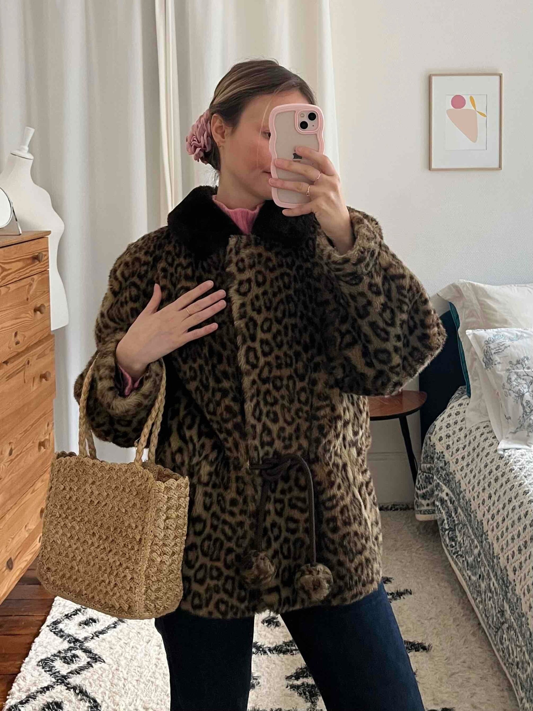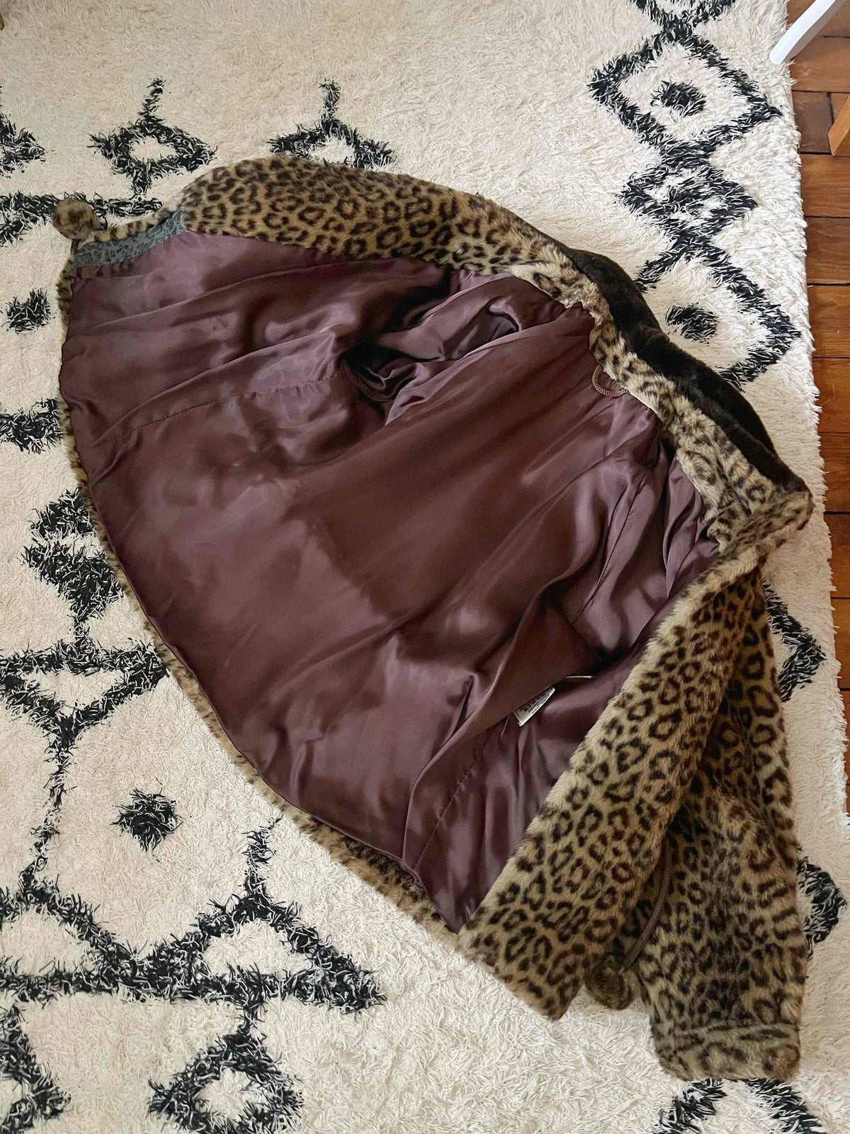 Prix unitaire parManteau en fasse fourrure, motif Leopard, col noir, made in France, lien à la taille à nouer avec pompons au bout, boutons crochets, deux poches, manches légèrement bouffantes, porté ici sur une T36 pour 1m64