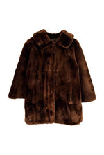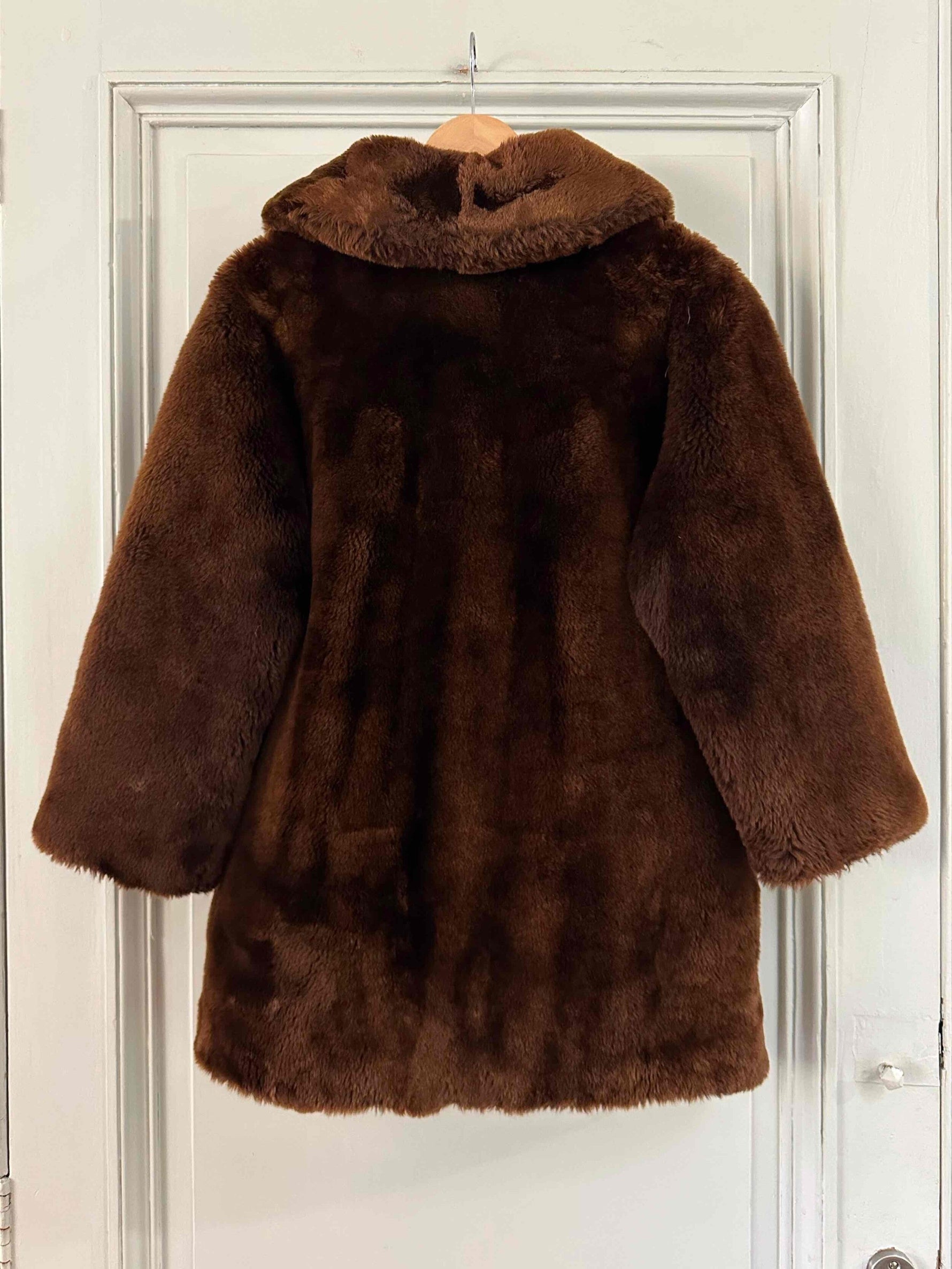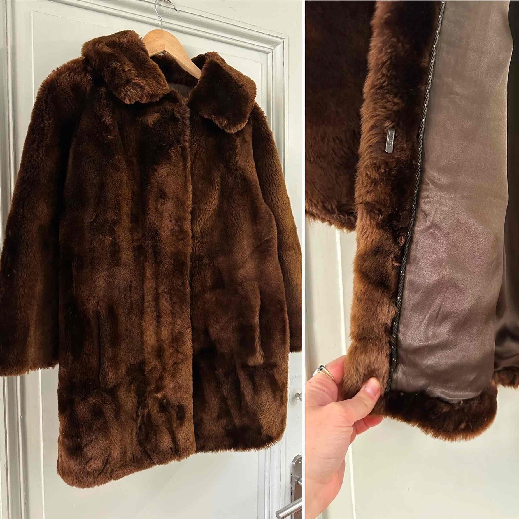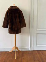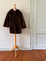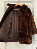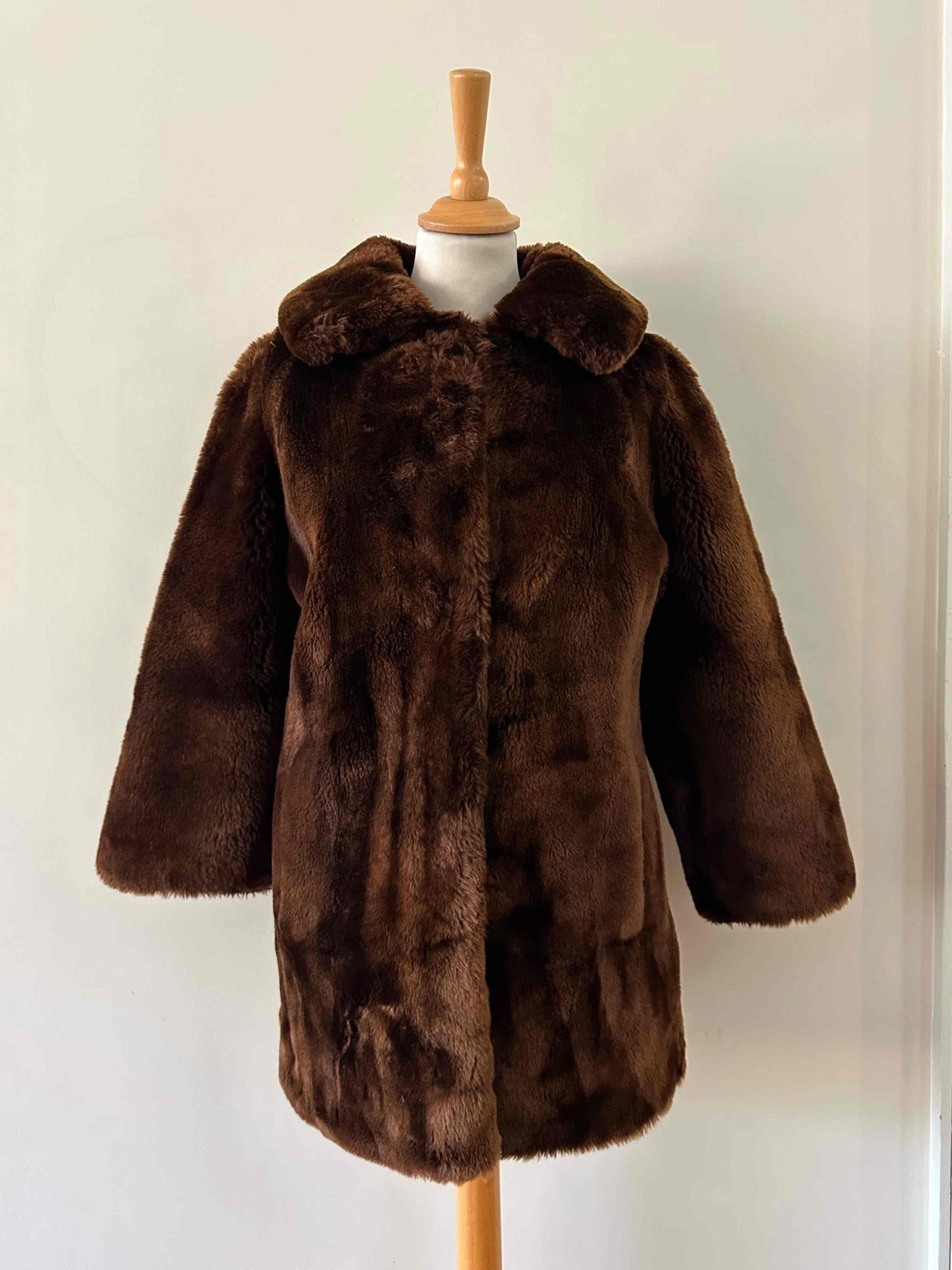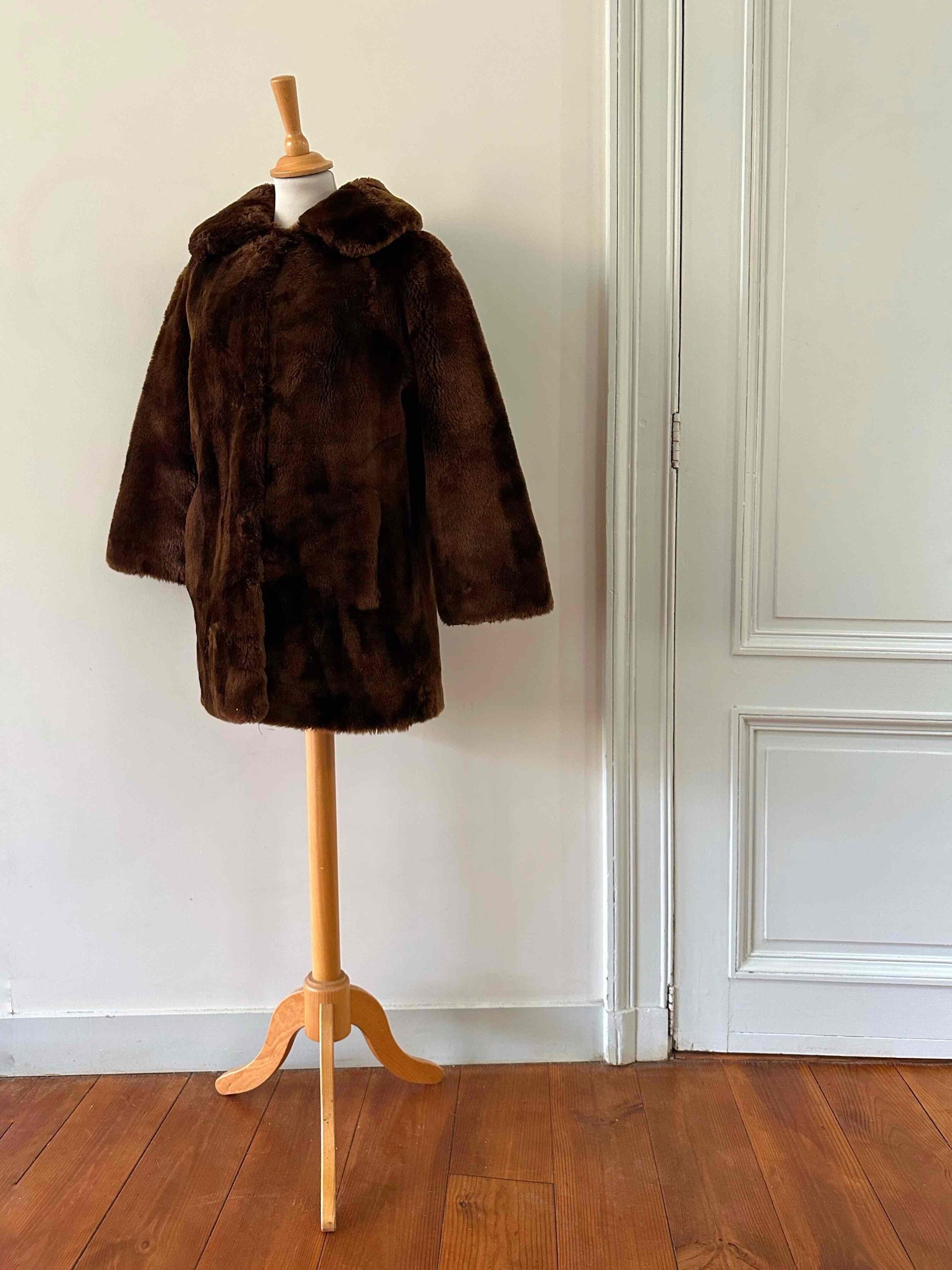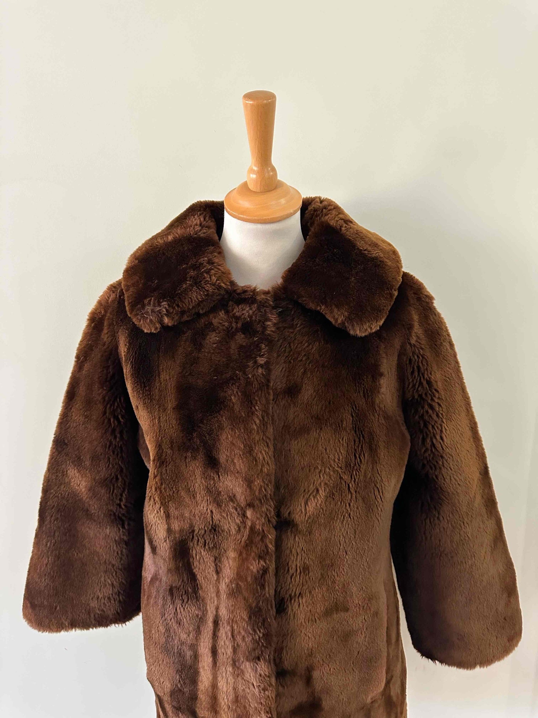 Prix unitaire parManteau en mouton doré, mouton doré peau retournée chocolat, col claudine, fermoirs à crochets, doublure satinée, taille 36 porté ici sur un mannequin T36.
