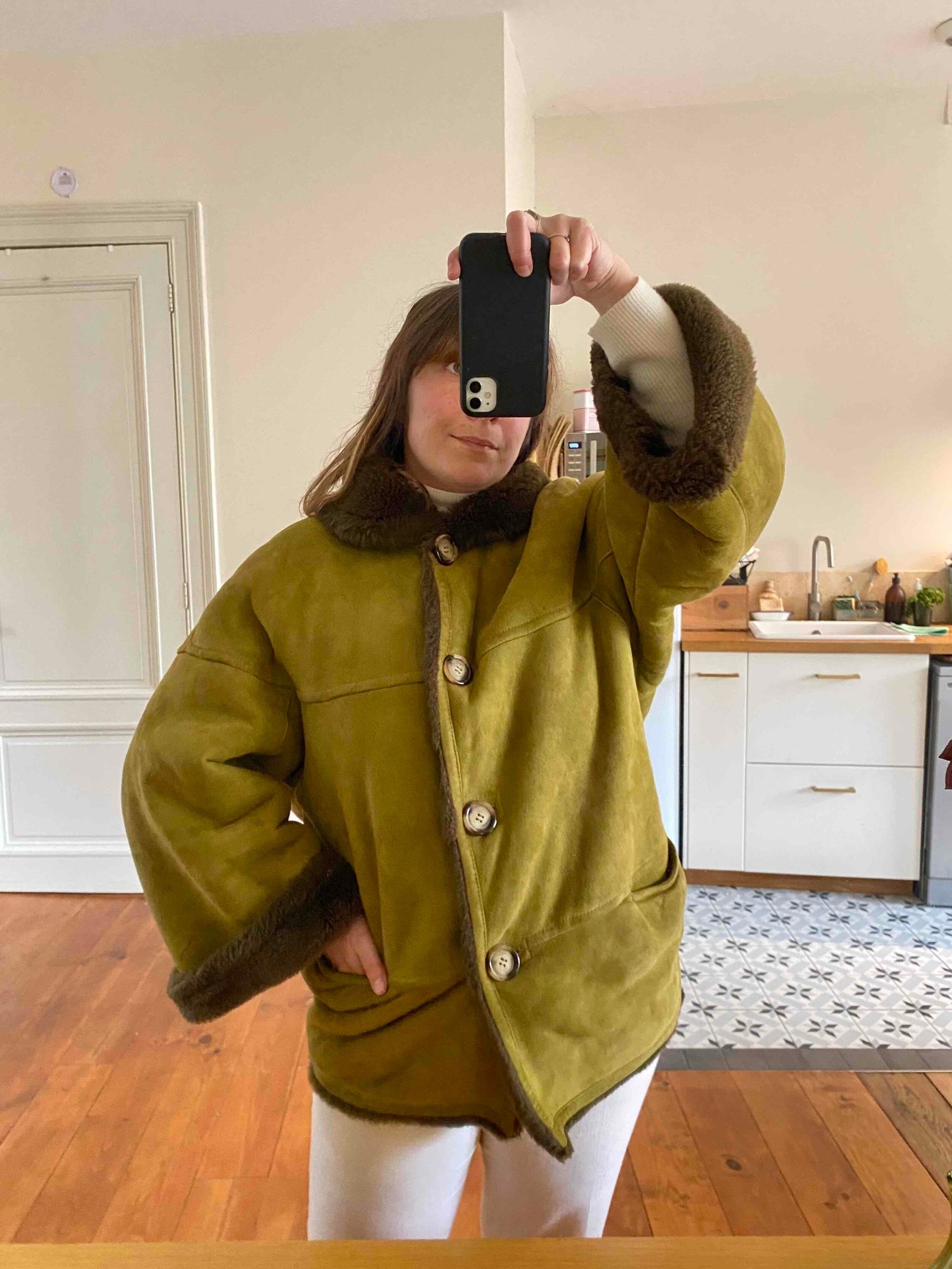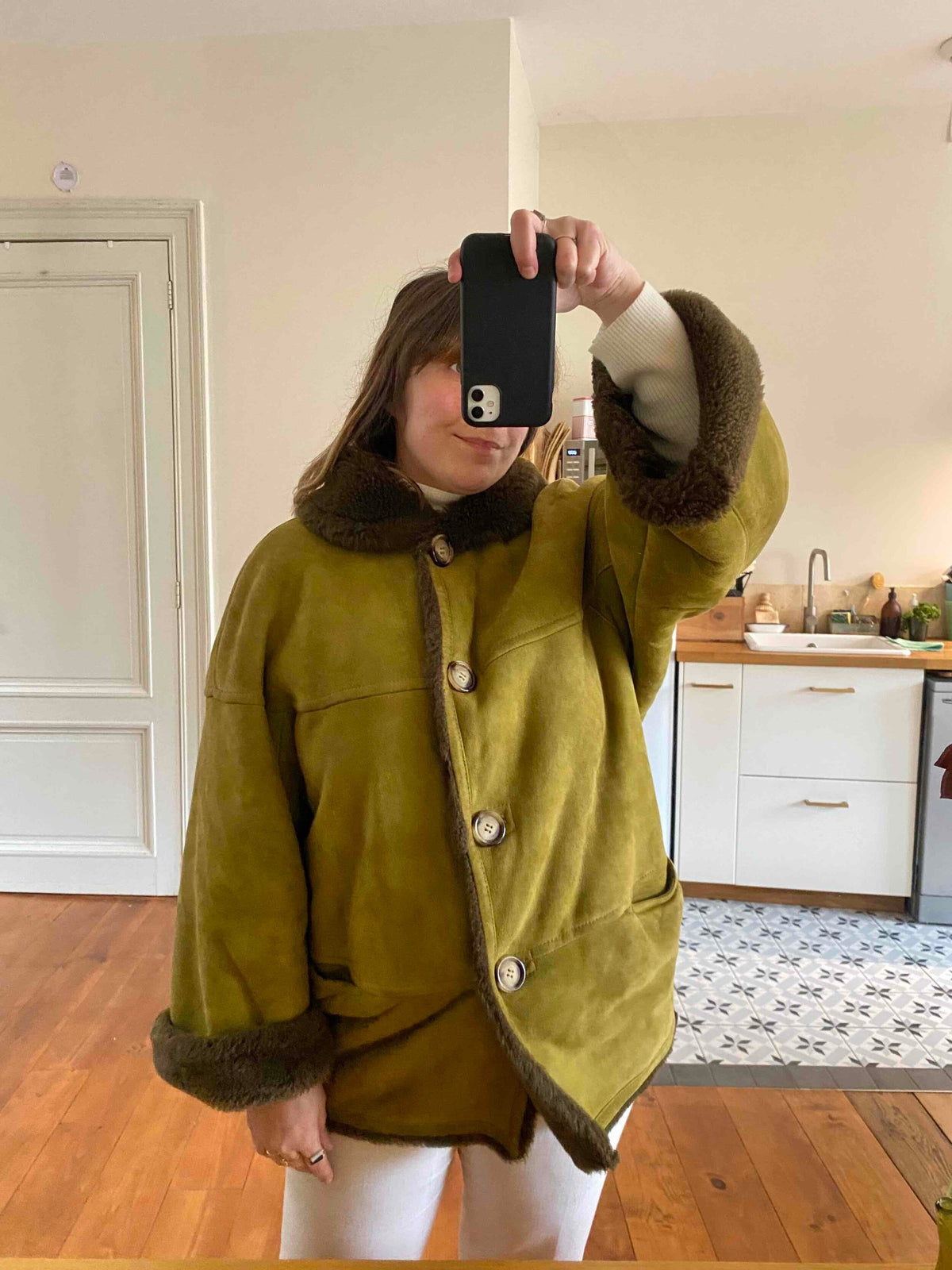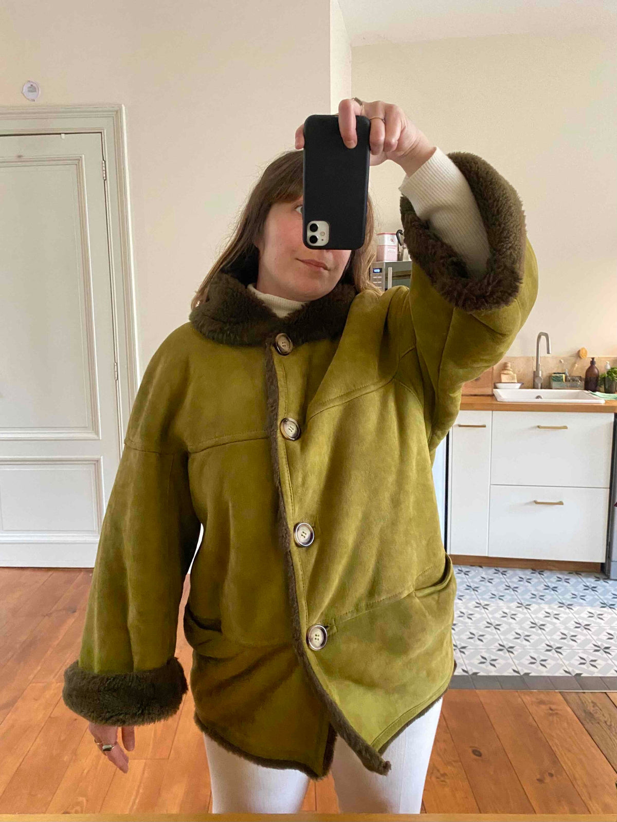 Prix unitaire parPeau lainée en mouton retourné extérieur daim vert olive, intérieur mouton brun kaki, col mouton, manches pagodes évasées à revers, grands boutons cornes, fabriqué en Italie, taille 38 porté ici serré sur une personne T40.