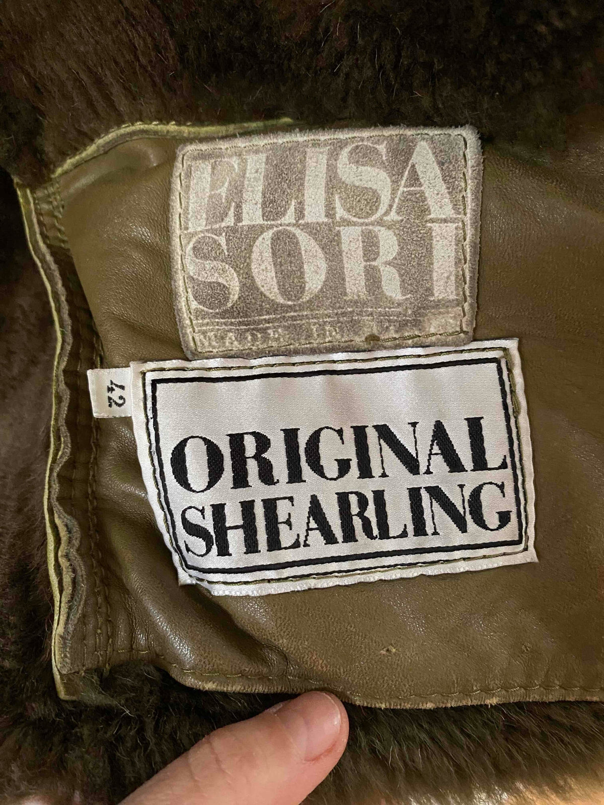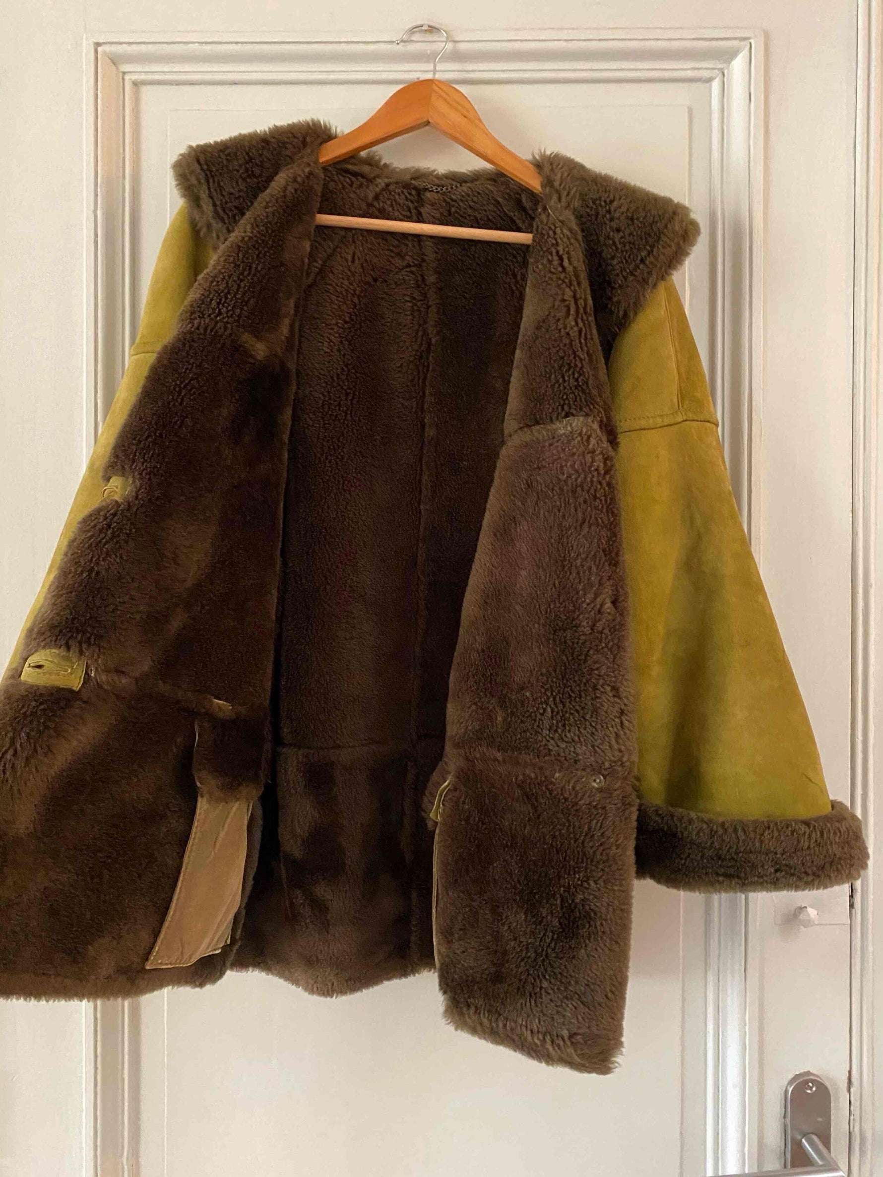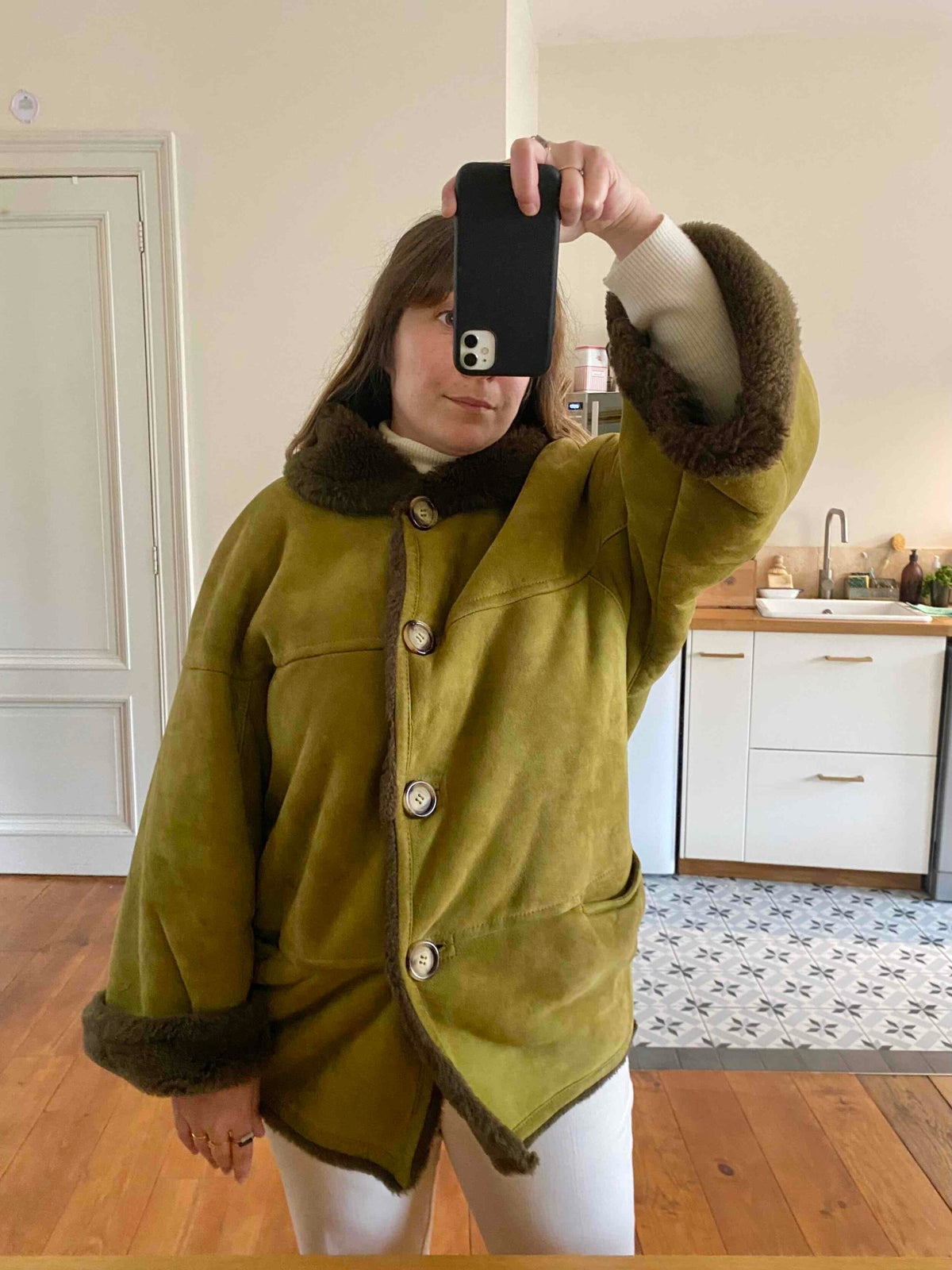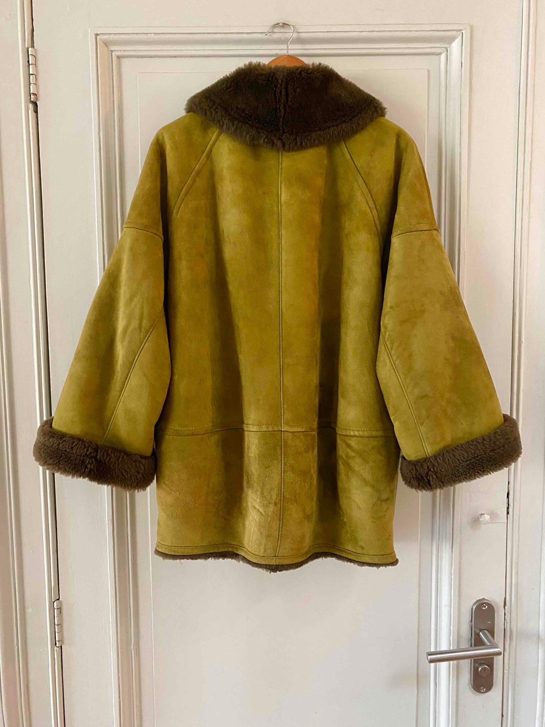 Prix unitaire parPeau lainée en mouton retourné extérieur daim vert olive, intérieur mouton brun kaki, col mouton, manches pagodes évasées à revers, grands boutons cornes, fabriqué en Italie, taille 38 porté ici serré sur une personne T40.