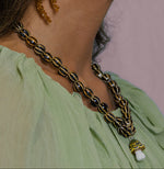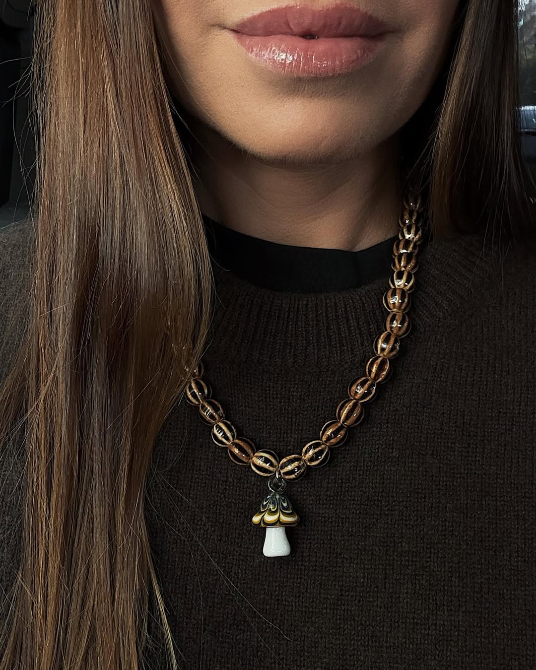 Collar con cuentas de cerámica gris y marrón redondas pintadas a mano y un charm de una seta blanca y amarilla con rayas grises de cristal soplado. Divertido, original y rompedor, hecho a mano.