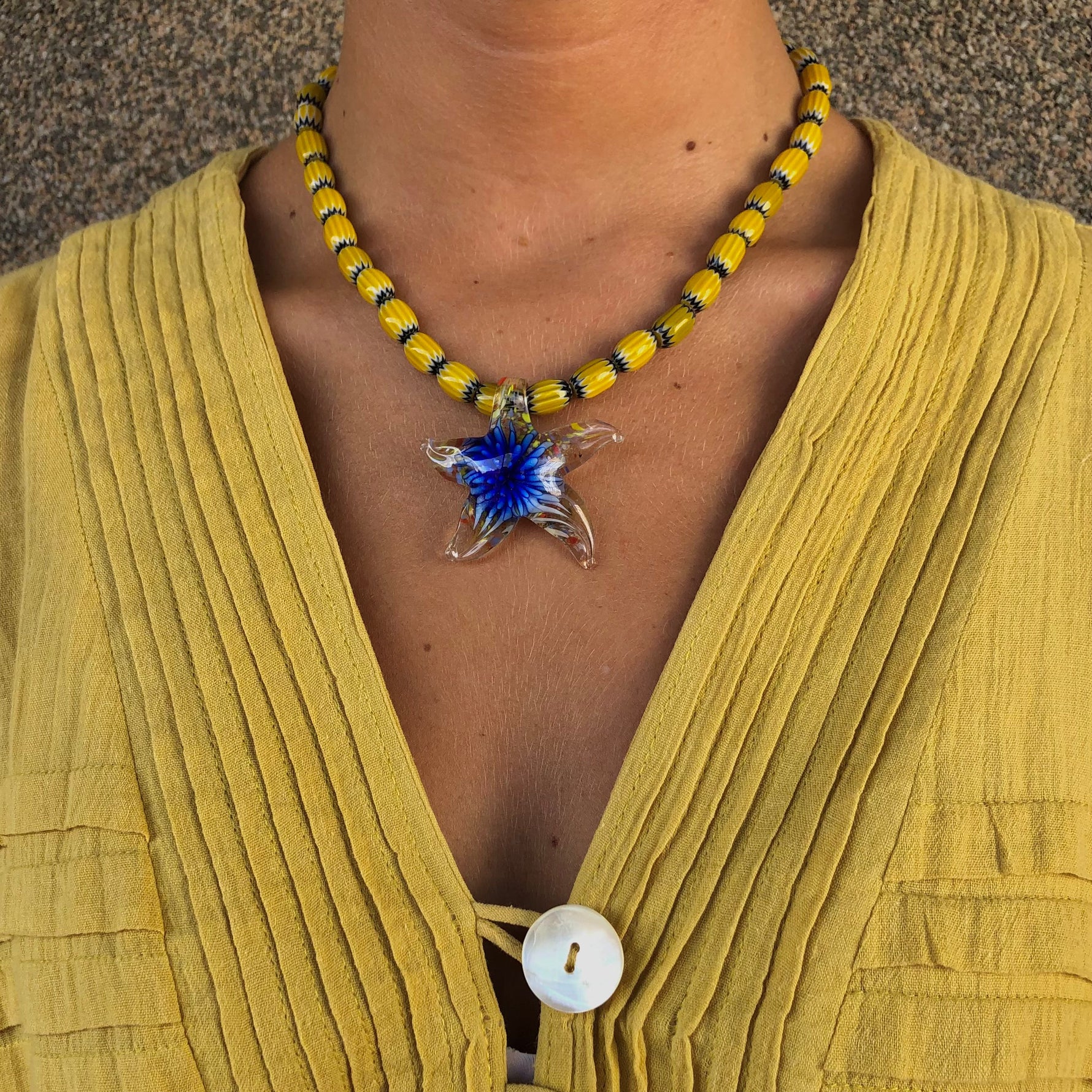 Gargantilla de cuentas de cerámica ovaladas amarillas y azules con un charm de cristal soplado de una estrella de mar azul. Diferente, fresco y original