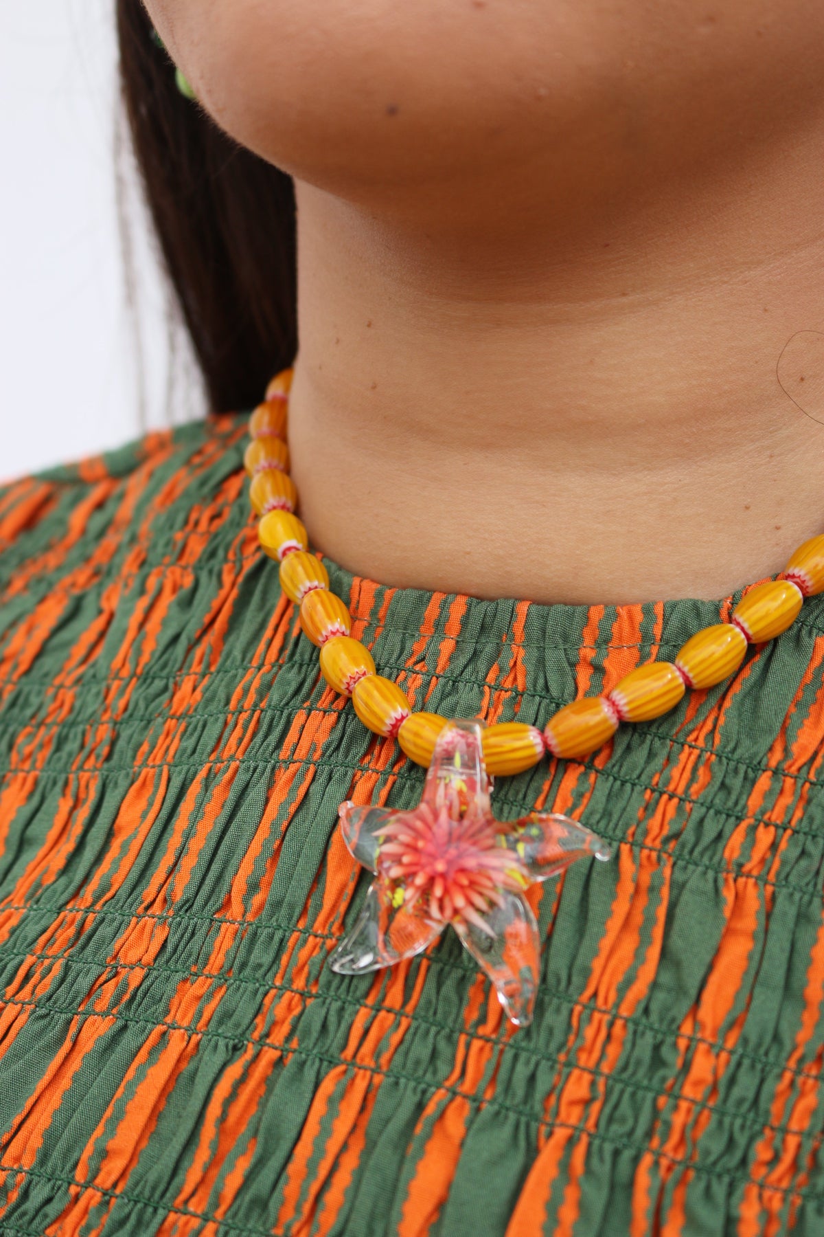 Gargantilla de cuentas de cerámica ovaladas naranjas y amarillas con un charm de cristal soplado de una estrella de mar naranja. Diferente, fresco y original