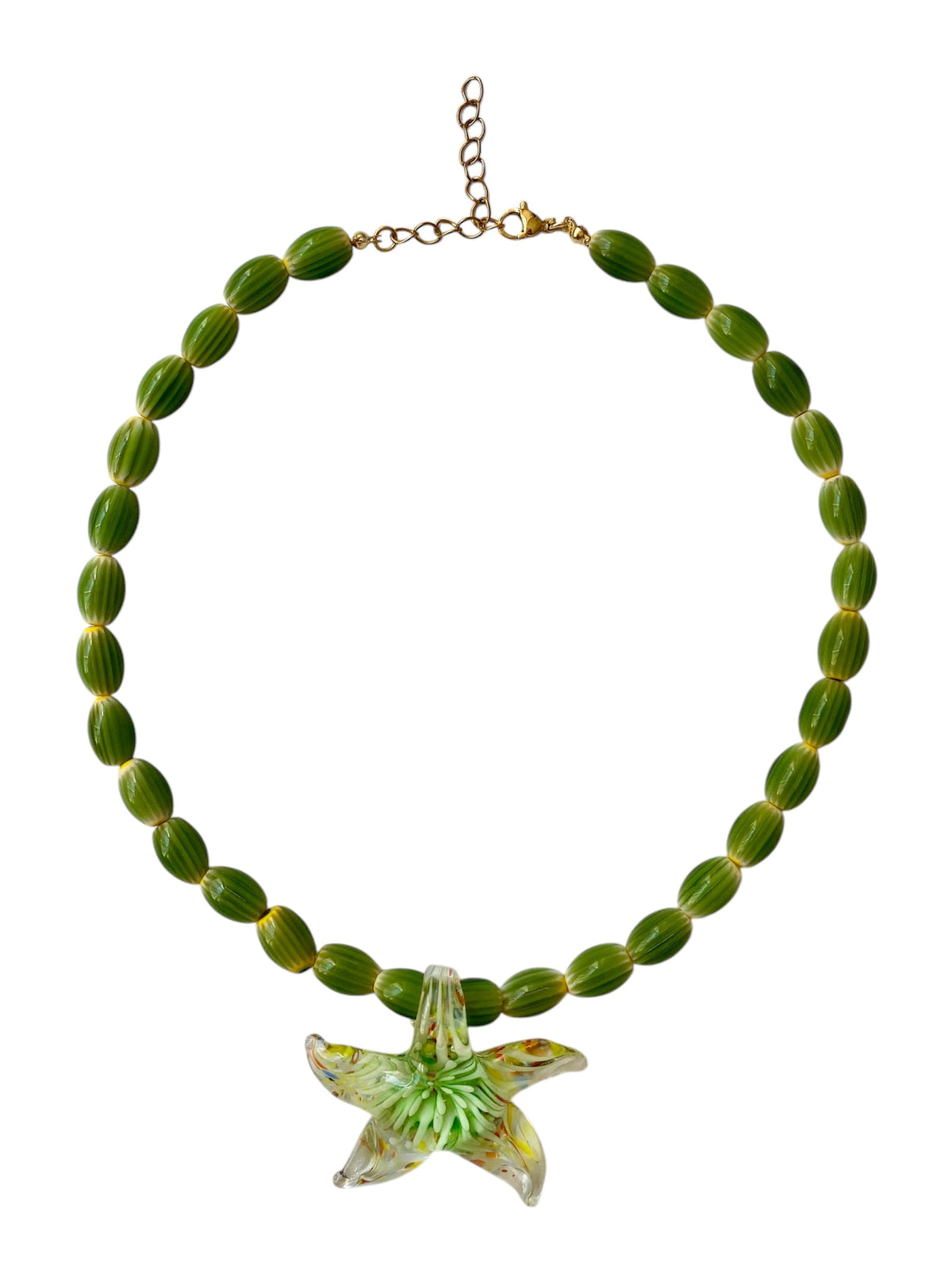 Gargantilla de cuentas de cerámica ovaladas verdes y amarillas con un charm de cristal soplado de una estrella de mar verde. Diferente, fresco y original