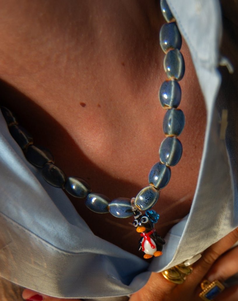 Collar con cuentas de cerámica azul ovaladas pintadas a mano y un charm de un pingüino con una bufanda roja y un gorrito azul de cristal soplado. Divertido, original y rompedor, hecho a mano.