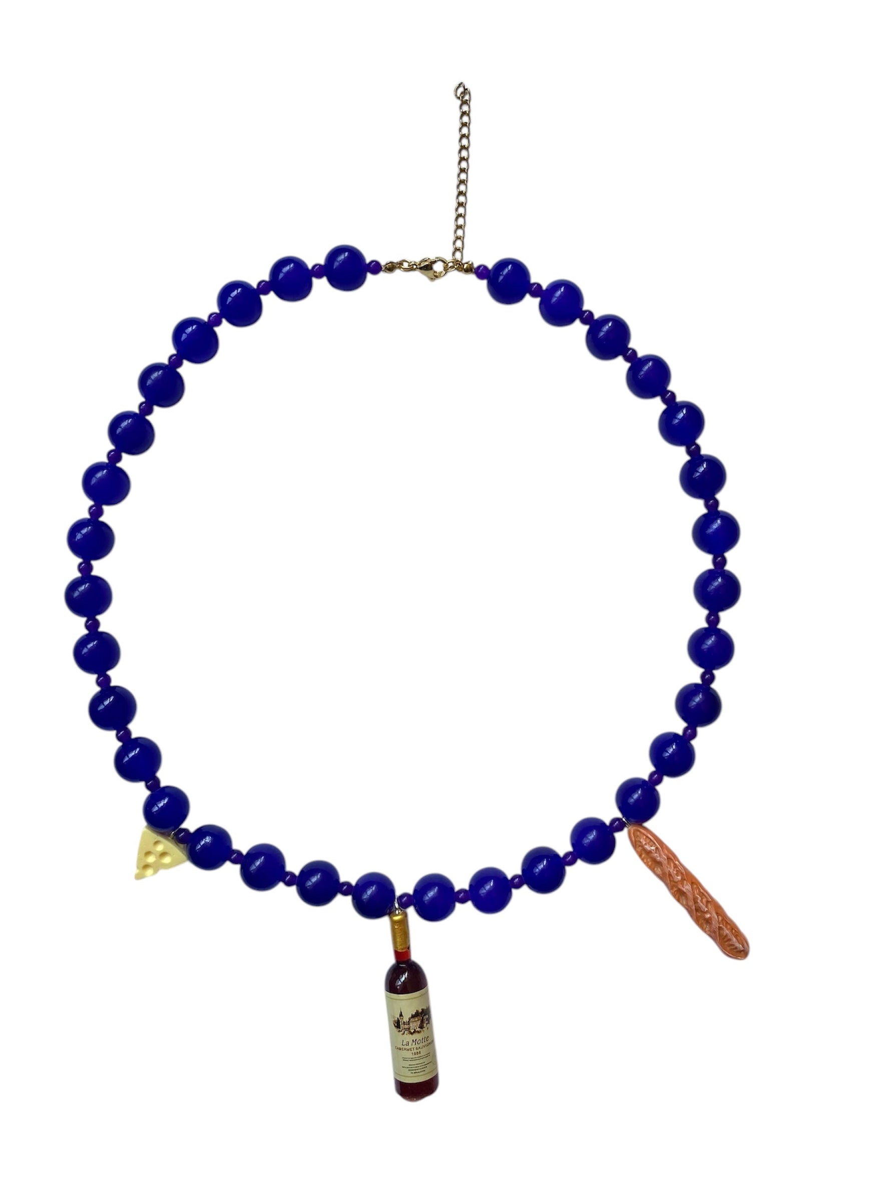 Collar de cuentas de cristal natural color azul y morado de diferentes tamaños con charms de resina en forma de vino, queso y pan. Diferente, fresco y original