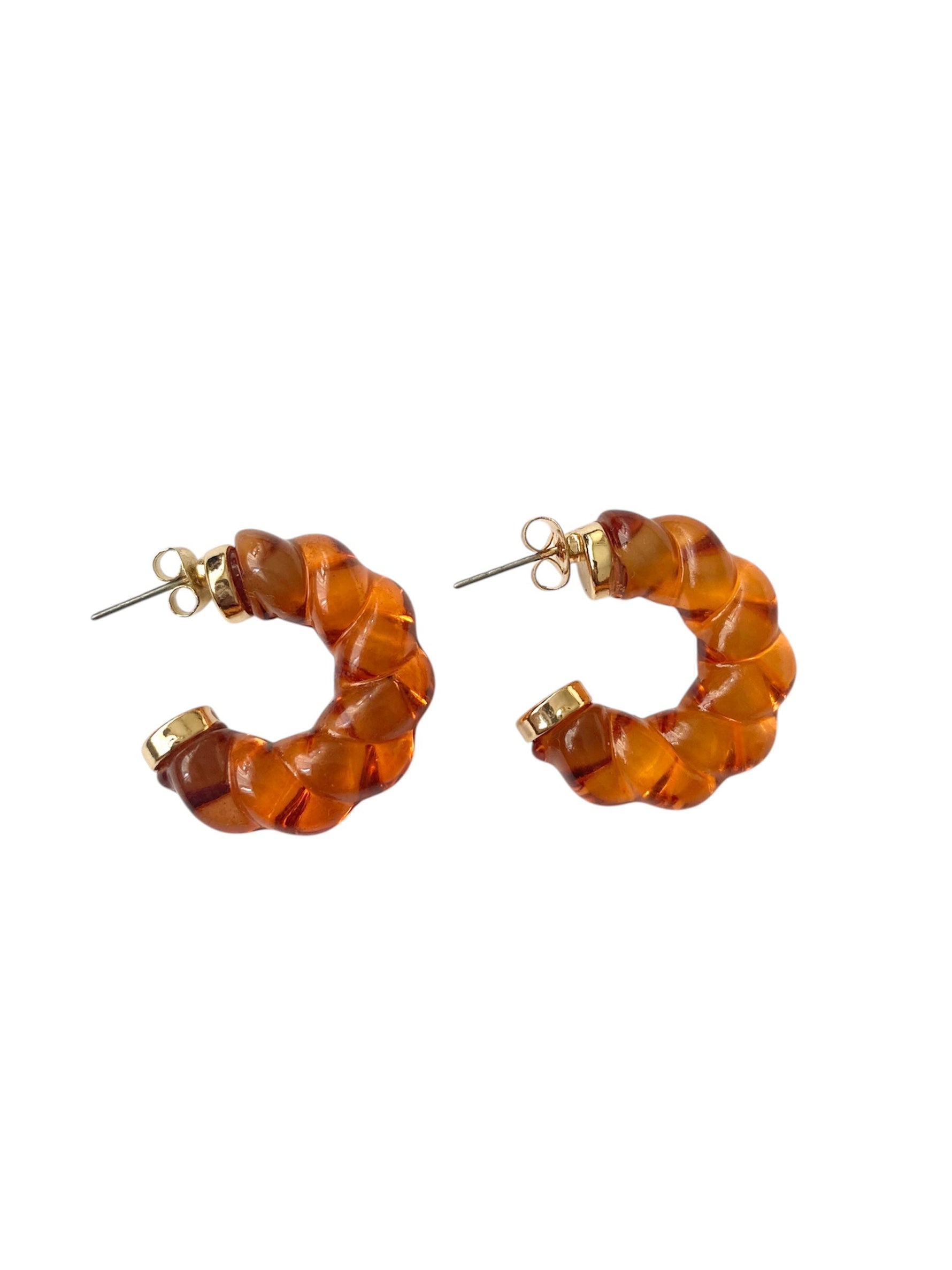 Pendiente en forma de aro transparente de resina con forma retorcida.