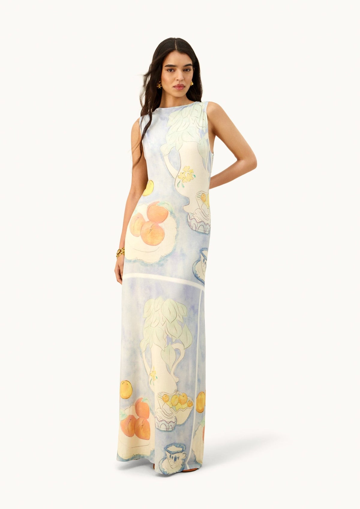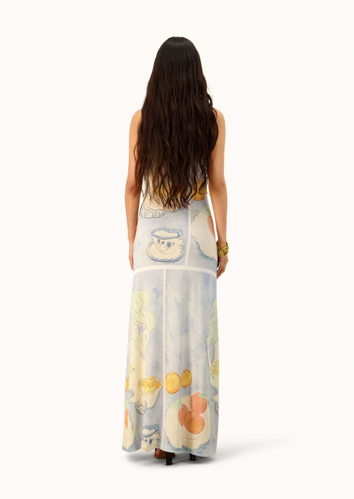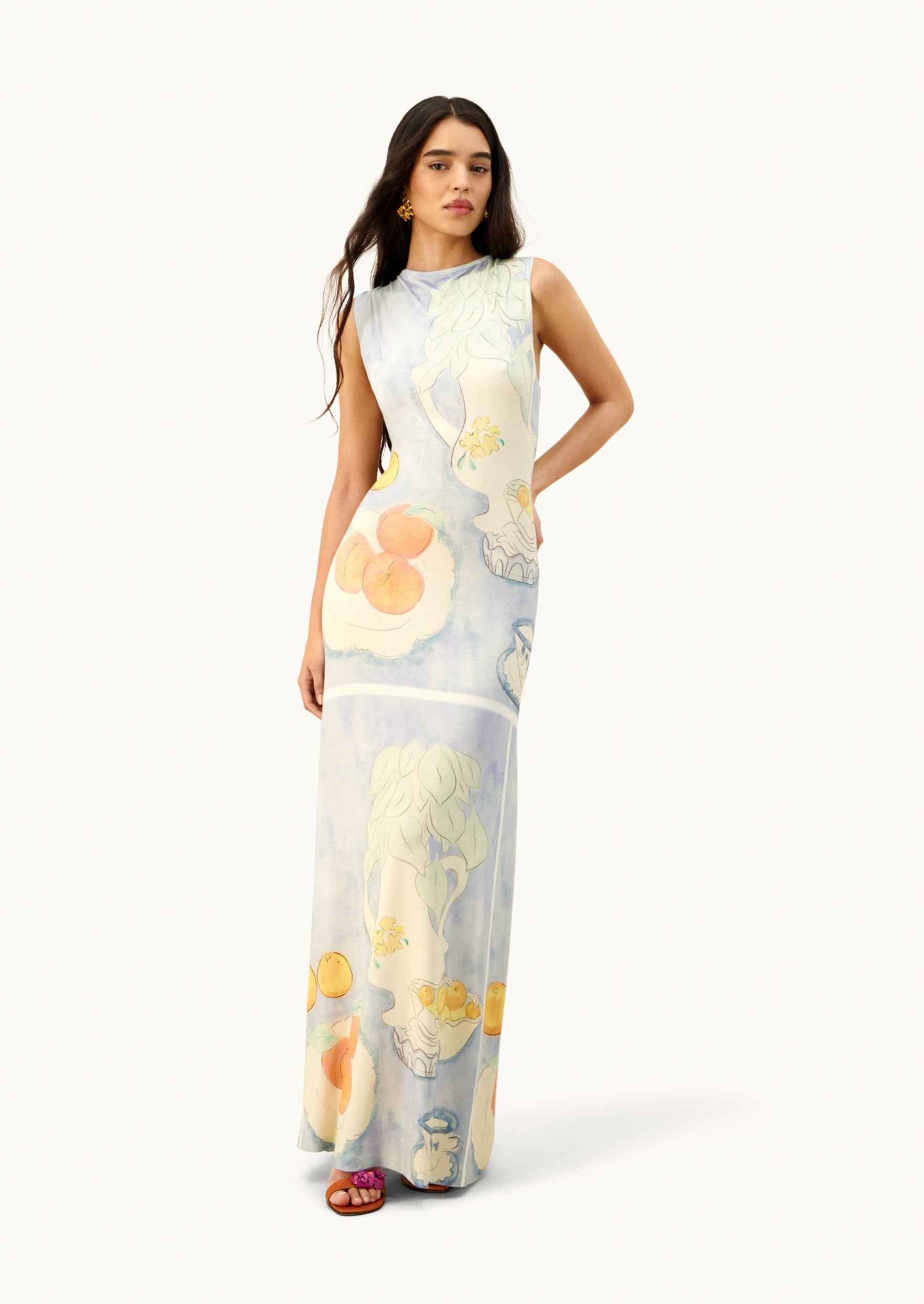 Robe longue sans manches aux tons pastel avec un imprimé artistique. Son tissu fluide épouse élégamment la silhouette, offrant une allure sophistiquée et moderne.