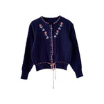 Cardigan autrichien en laine mélangée bleue foncée brodée de fleurs roses pastel, bleu ciel et blanches, bordures en damier rose, cordon à nouer taille, maille ajourée, boutons bijoux argentés fleuris, fabriqué en Autriche, taille 36 porté ici sur un mannequin T36.