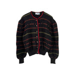 Cardigan autrichien en pure Laine motifs jacquards verts et rouges, maille ajourée, manches ballons, boutons bois, taille 38/40 porté ici sur un mannequin T36 et une personne T40.