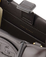 Deux poignées et une bandoulière amovible et réglable. Double portage. Matière : polyuréthane. Doublure : cuir. Couleur : Noir. Fermeture : languette avec fermoir magnétique ; soufflets à boutons-pression. Intérieur : deux compartiments et deux poches zippées.