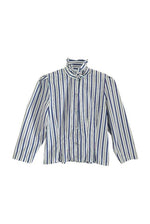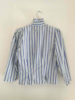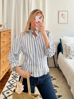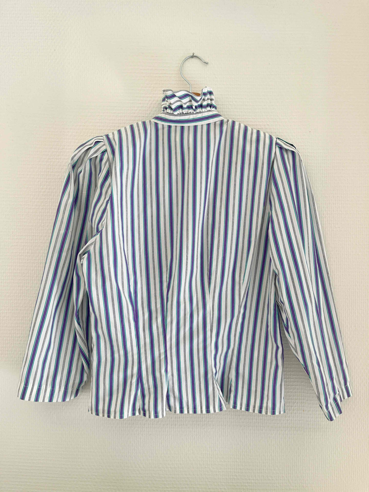 Blouse rayée, col montant à volants, boutonnée sur le devant, fabriquée en France. Portée ici sur une T36 pour 1,64 m.