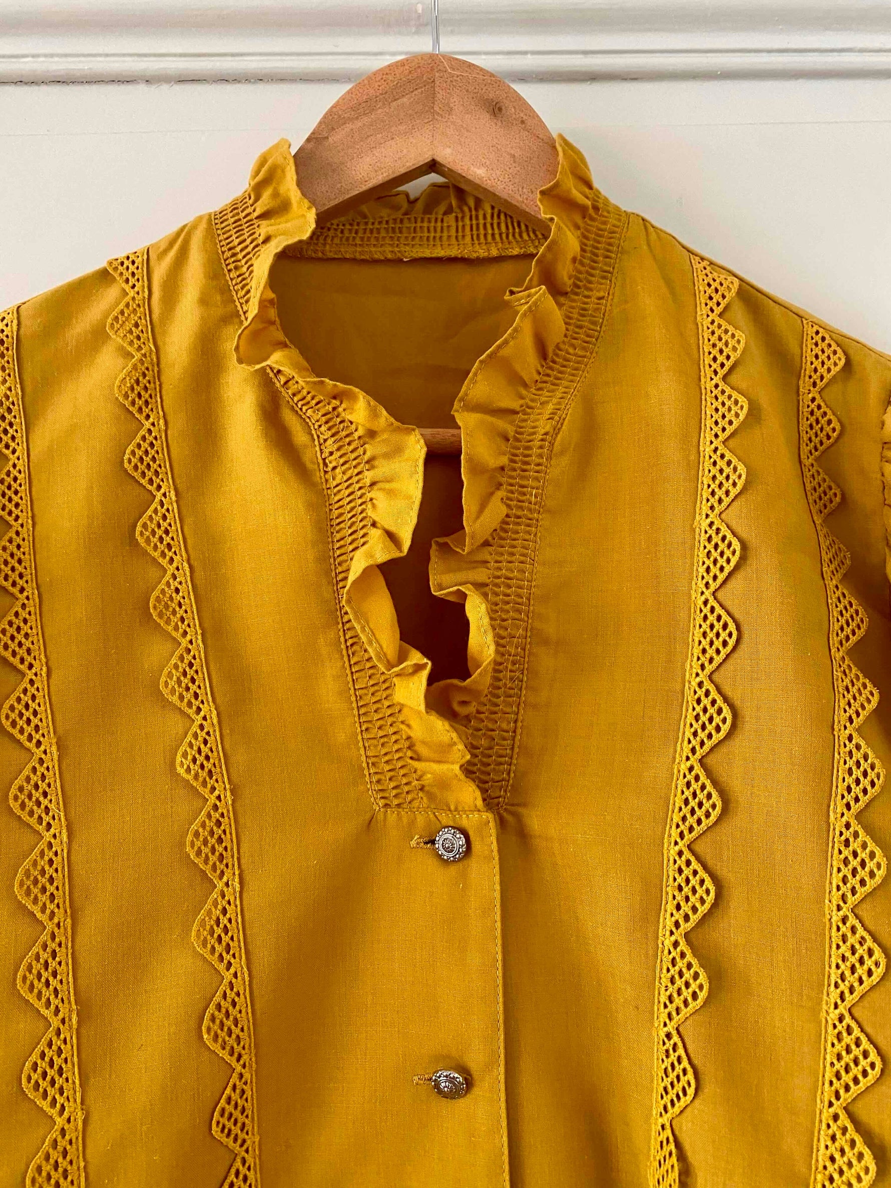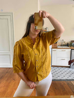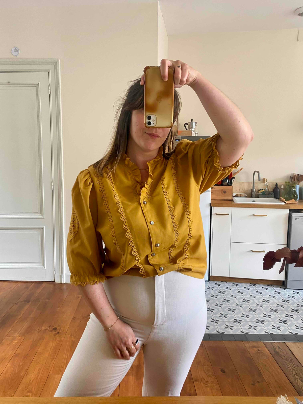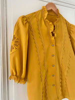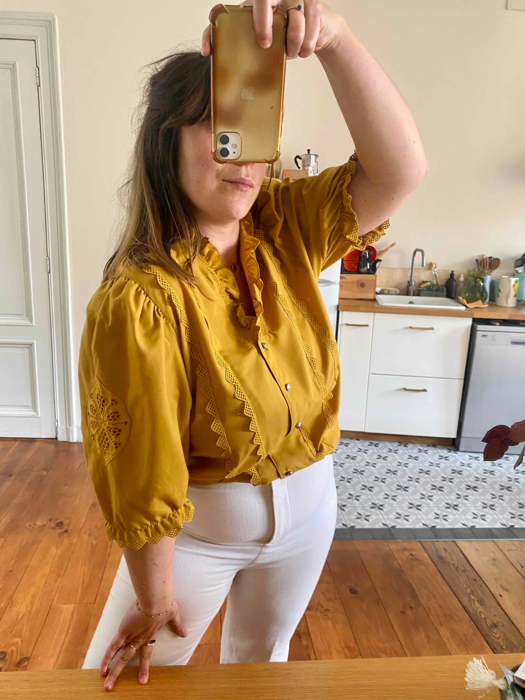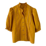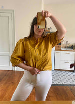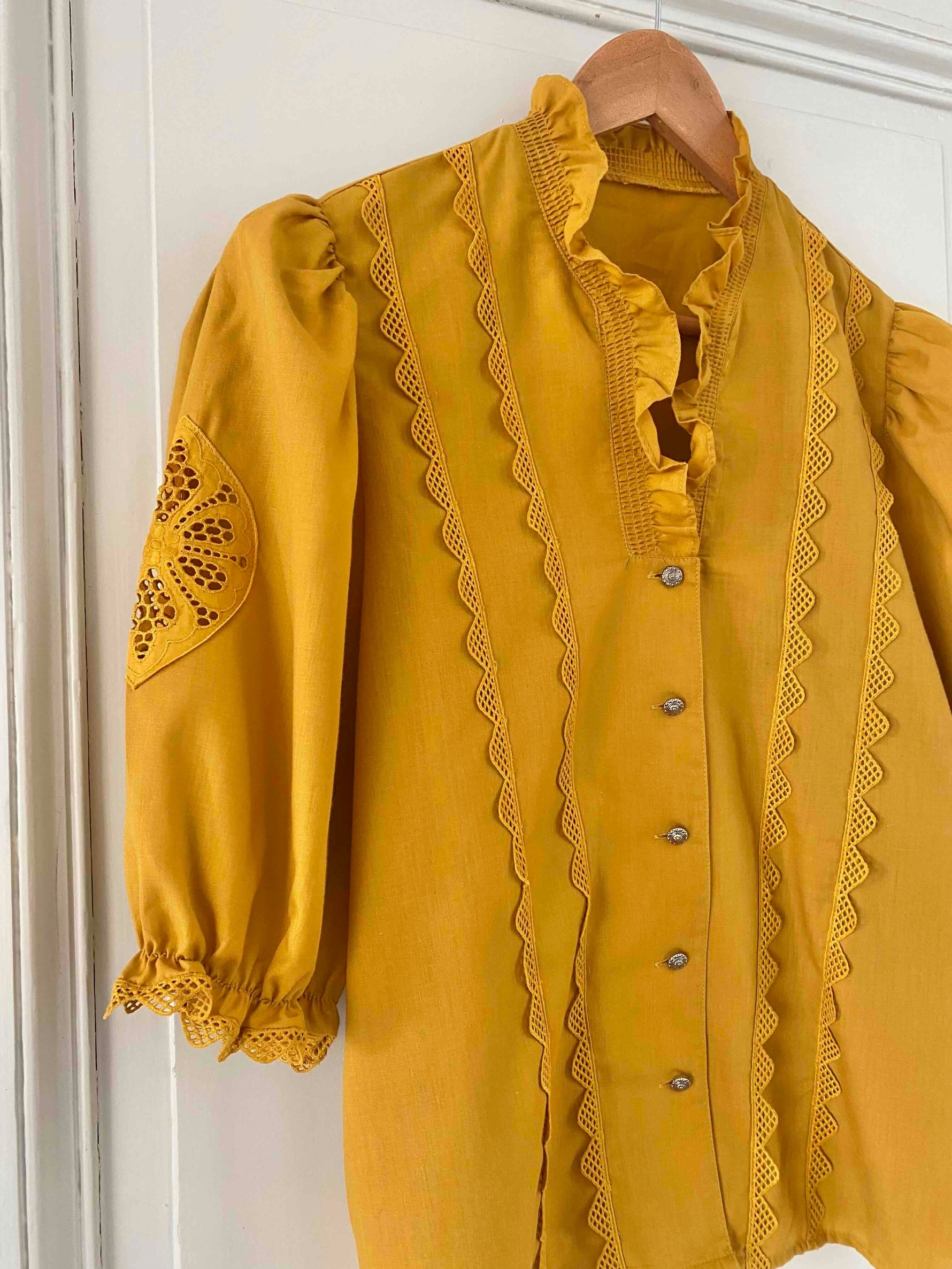 Prix unitaire parBlouse autrichienne en coton laune ocre et broderies anglaises, manches ballons 3/4 élastique volantées et ajourées d'une broderie florale, boutons bijoux argentés fleuris, fabriquée en Autriche, taille 38 et 40 portée ici sur un mannequin T36 et une personne T40.