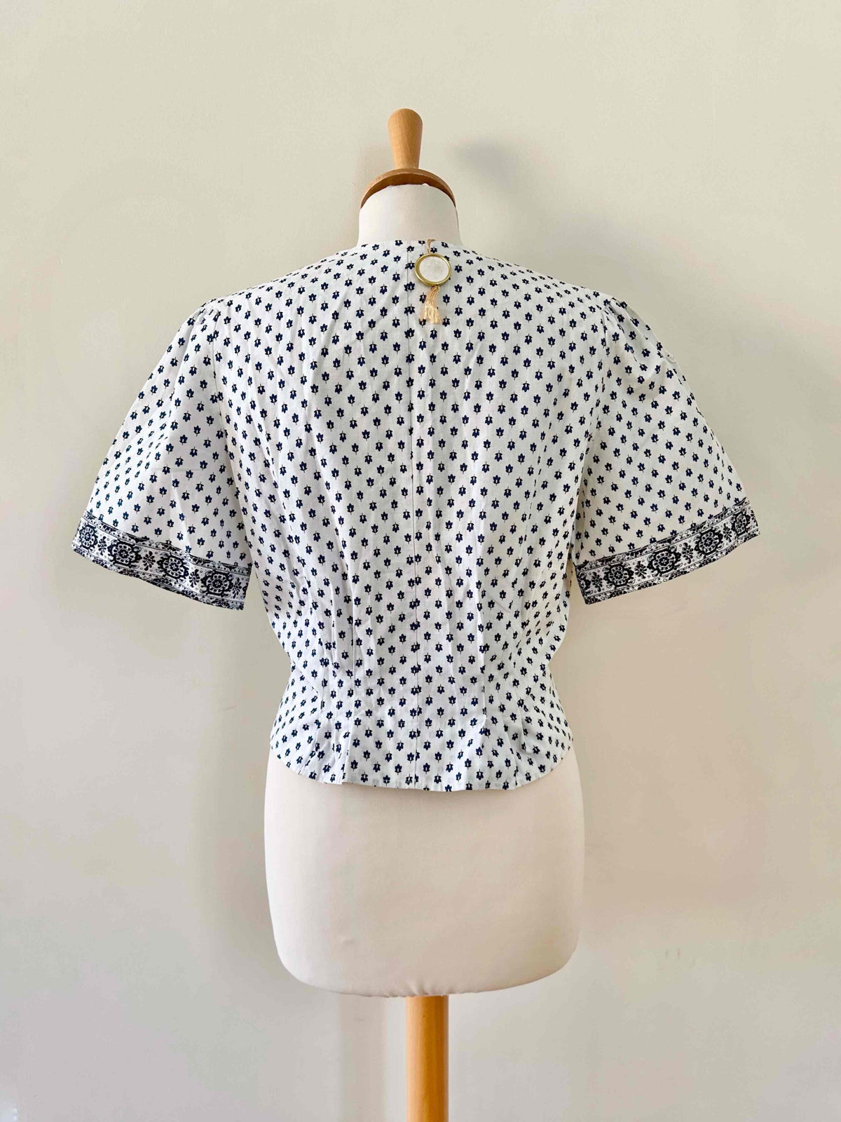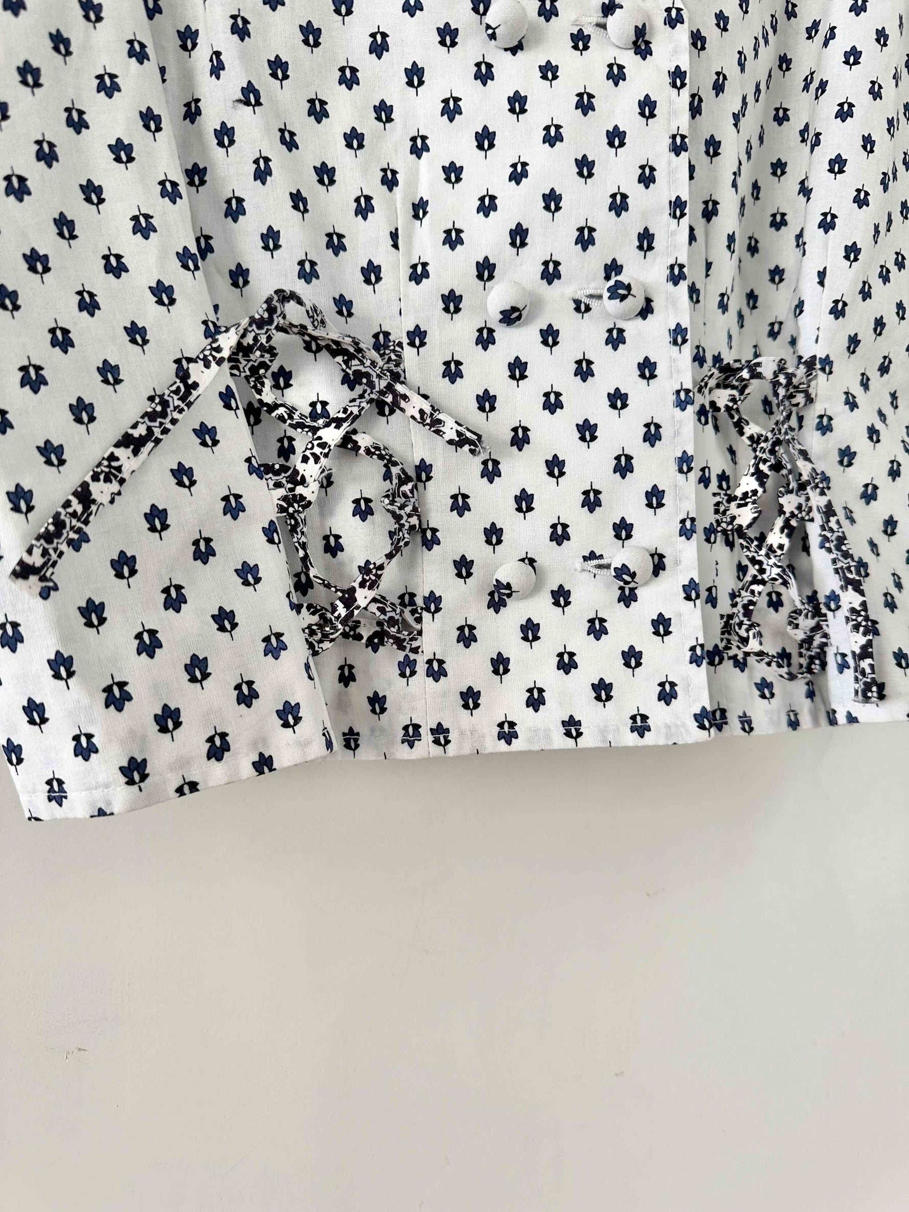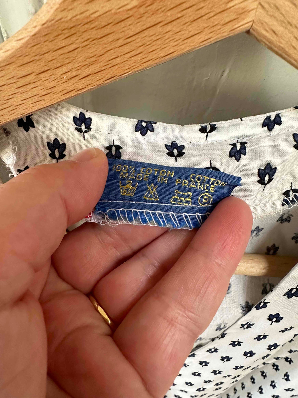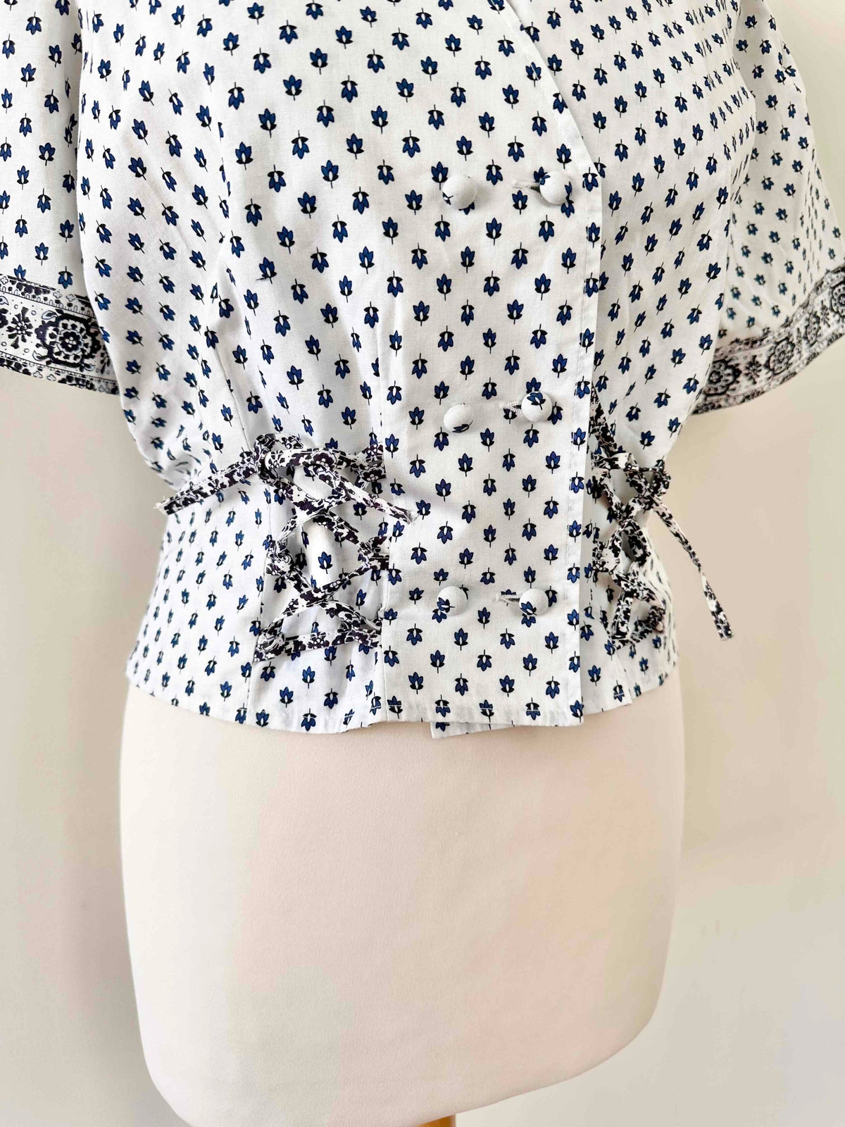 Blouse provençale, en 100% coton blanc imprimé fleurs et minis motifs provençaux bleus, boutonnage croisé, manches gigots froncées, laçage sur les côtés, taille, fabriquée en France, convient aux tailles 34 et 36, portée ici sur un mannequin T36. Avec étiquette d’origine.