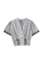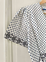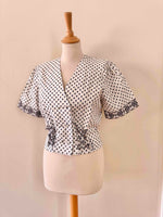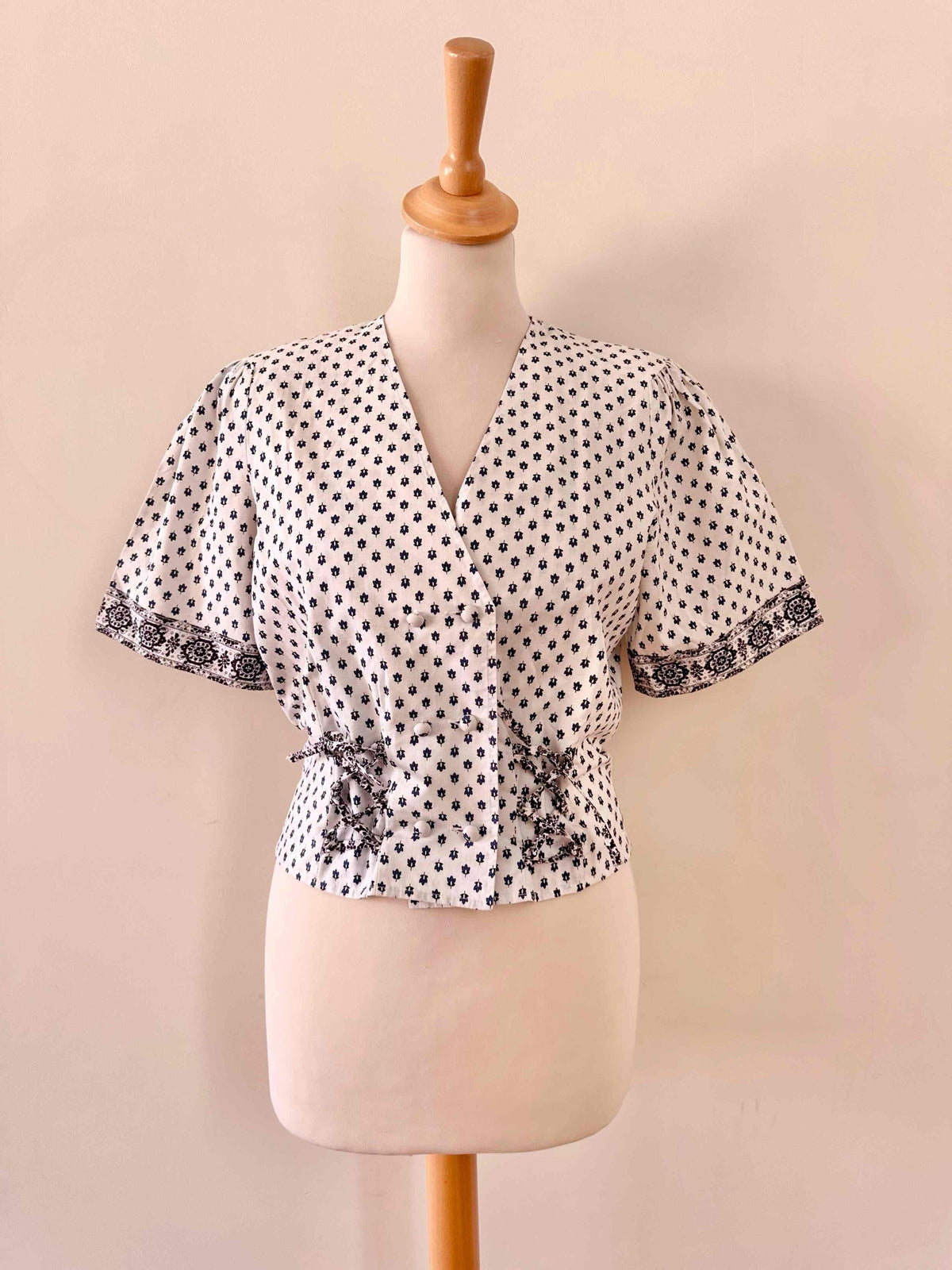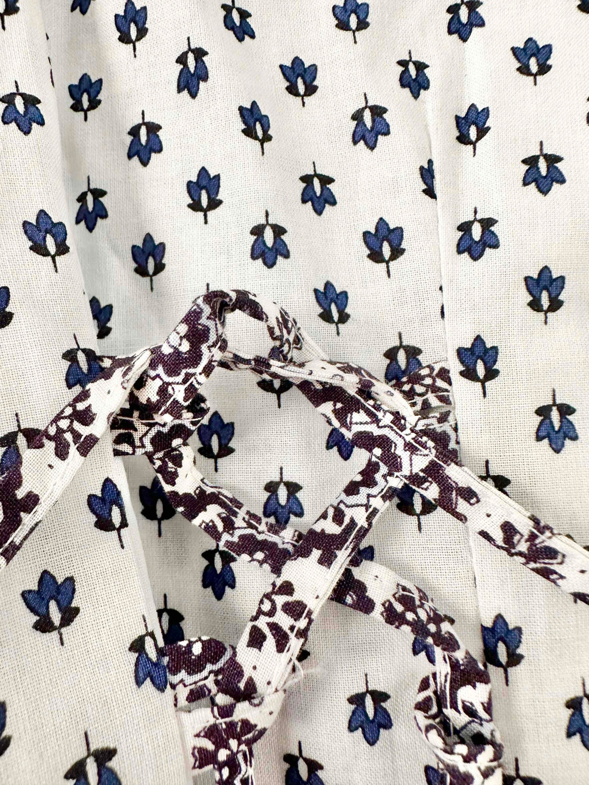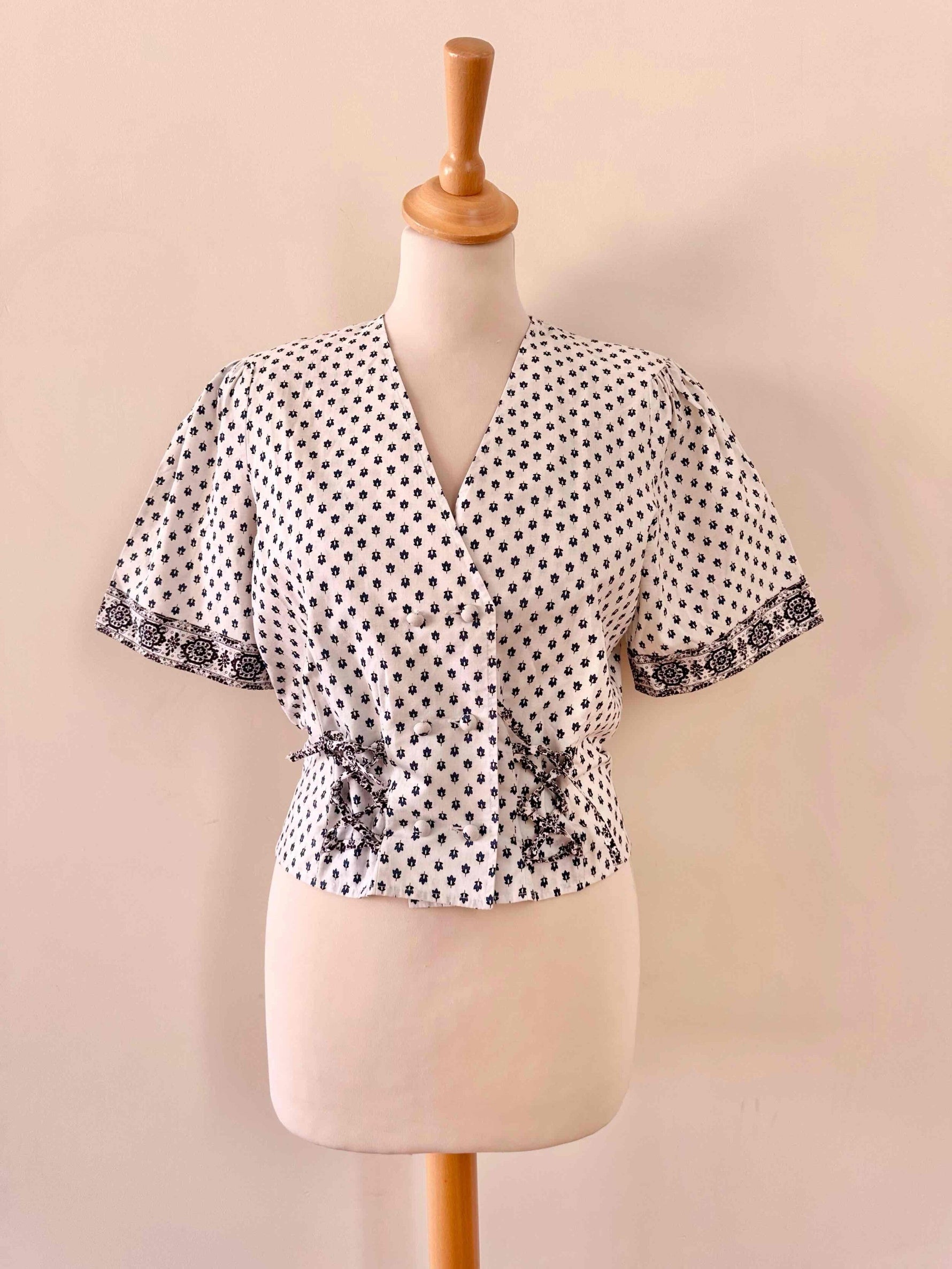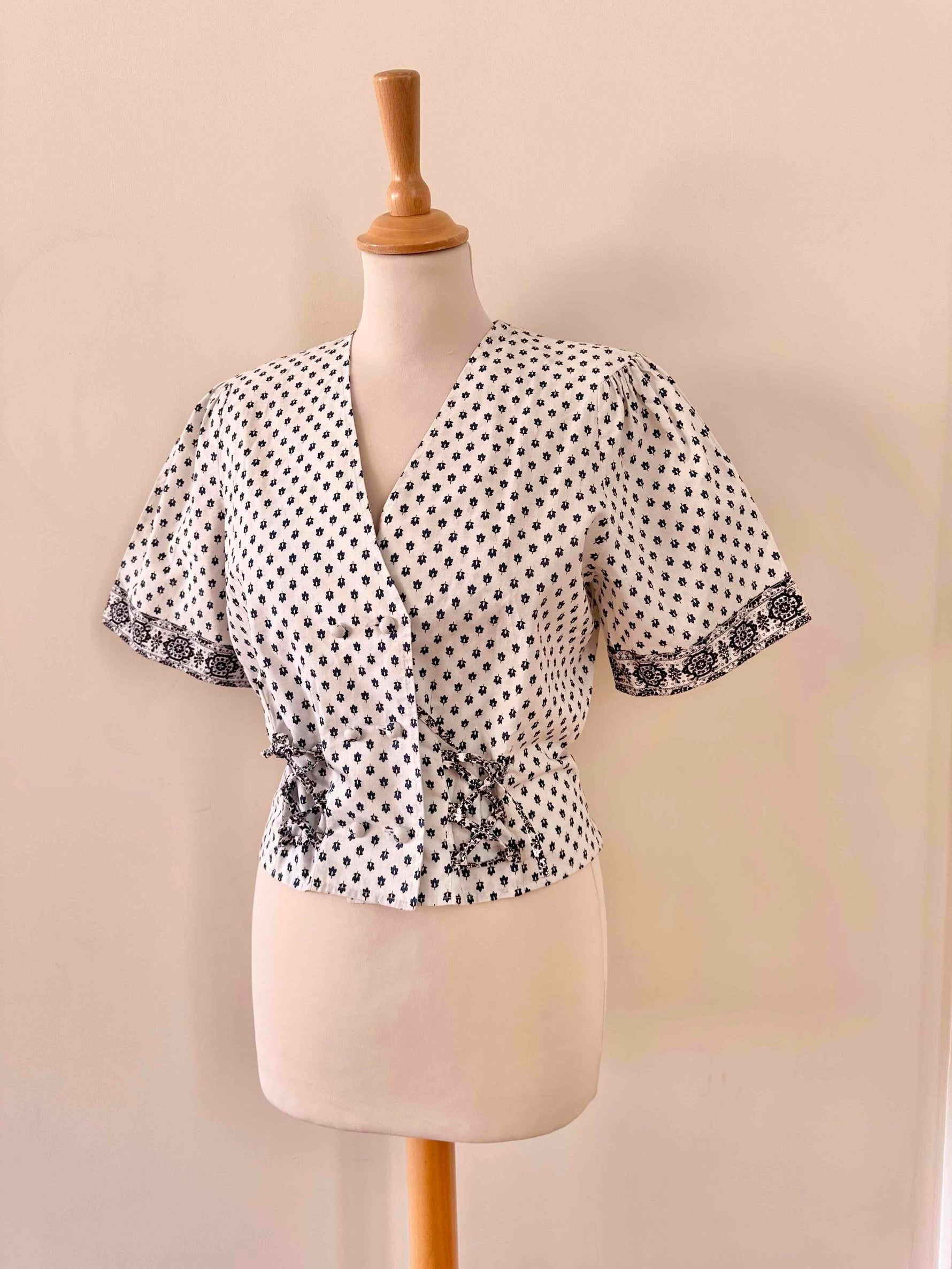 Blouse provençale, en 100% coton blanc imprimé fleurs et minis motifs provençaux bleus, boutonnage croisé, manches gigots froncées, laçage sur les côtés, taille, fabriquée en France, convient aux tailles 34 et 36, portée ici sur un mannequin T36. Avec étiquette d’origine.