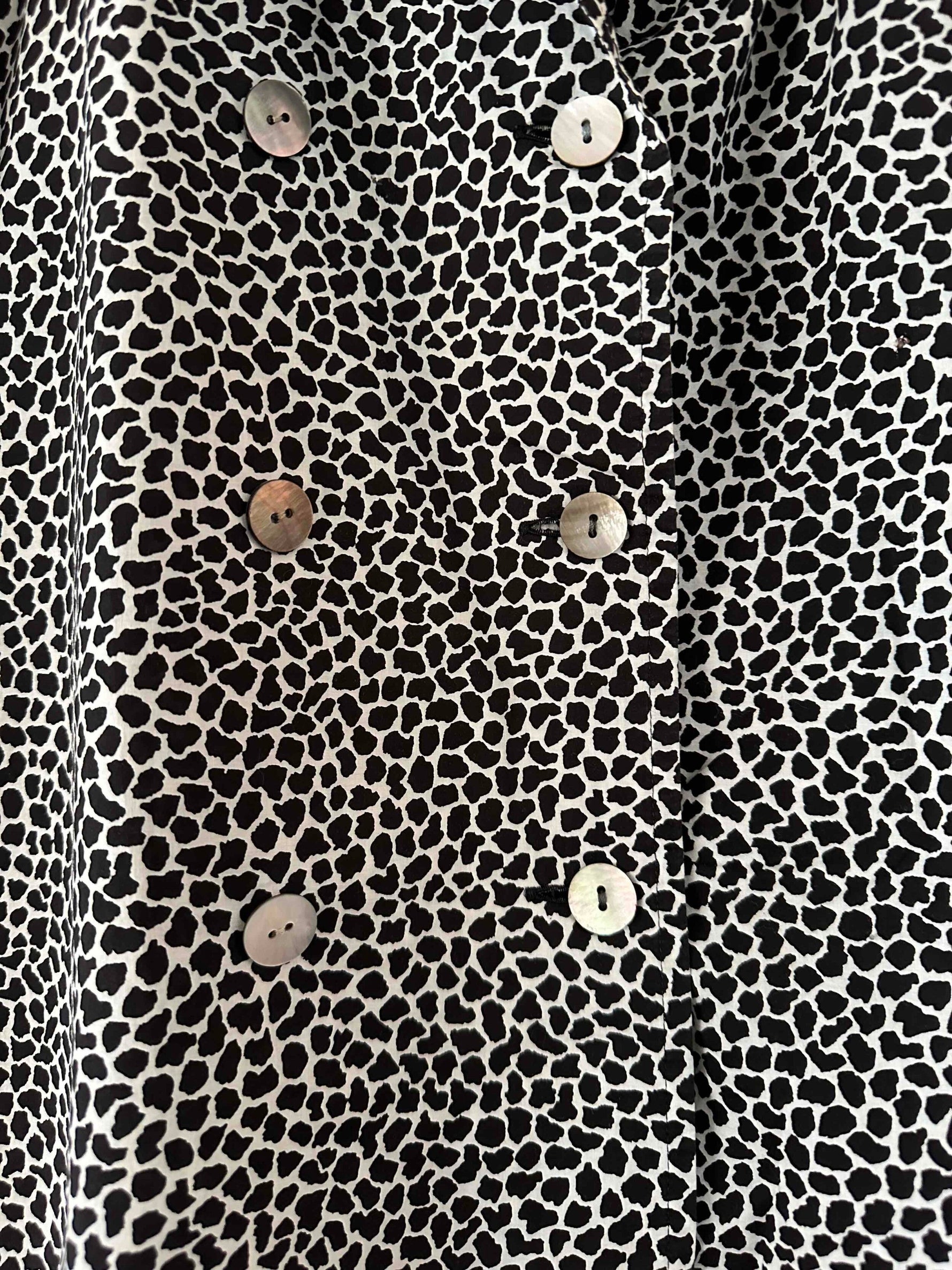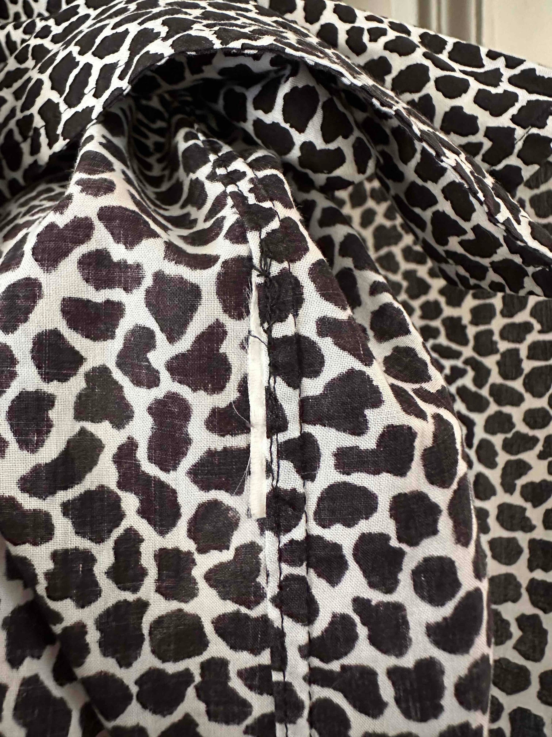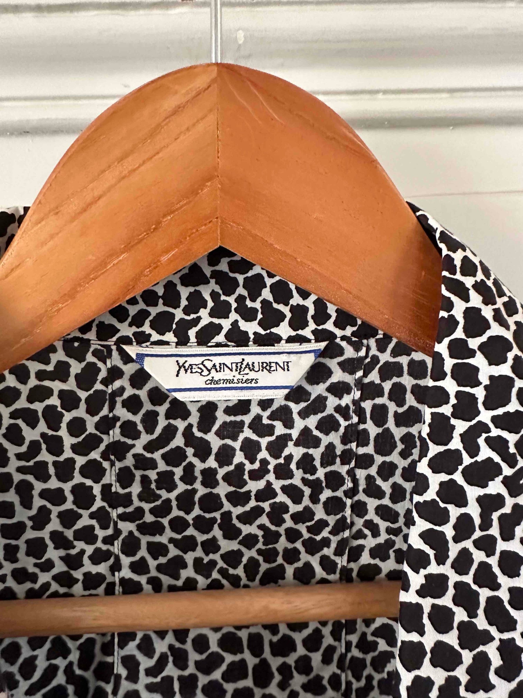 Prix unitaire parBlouse leopard Yves Saint Laurent, en 100% coton blanc imprimé petites tâches léopards noires, col chemisier, boutonnage croisé cache coeur en nacre, fabriqué en France, taille 38 et 40 portée ici sur un mannequin T36 et une personne T40.