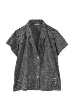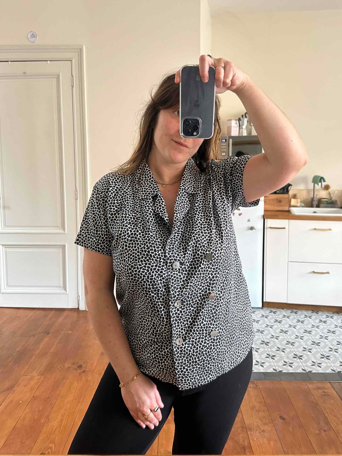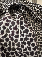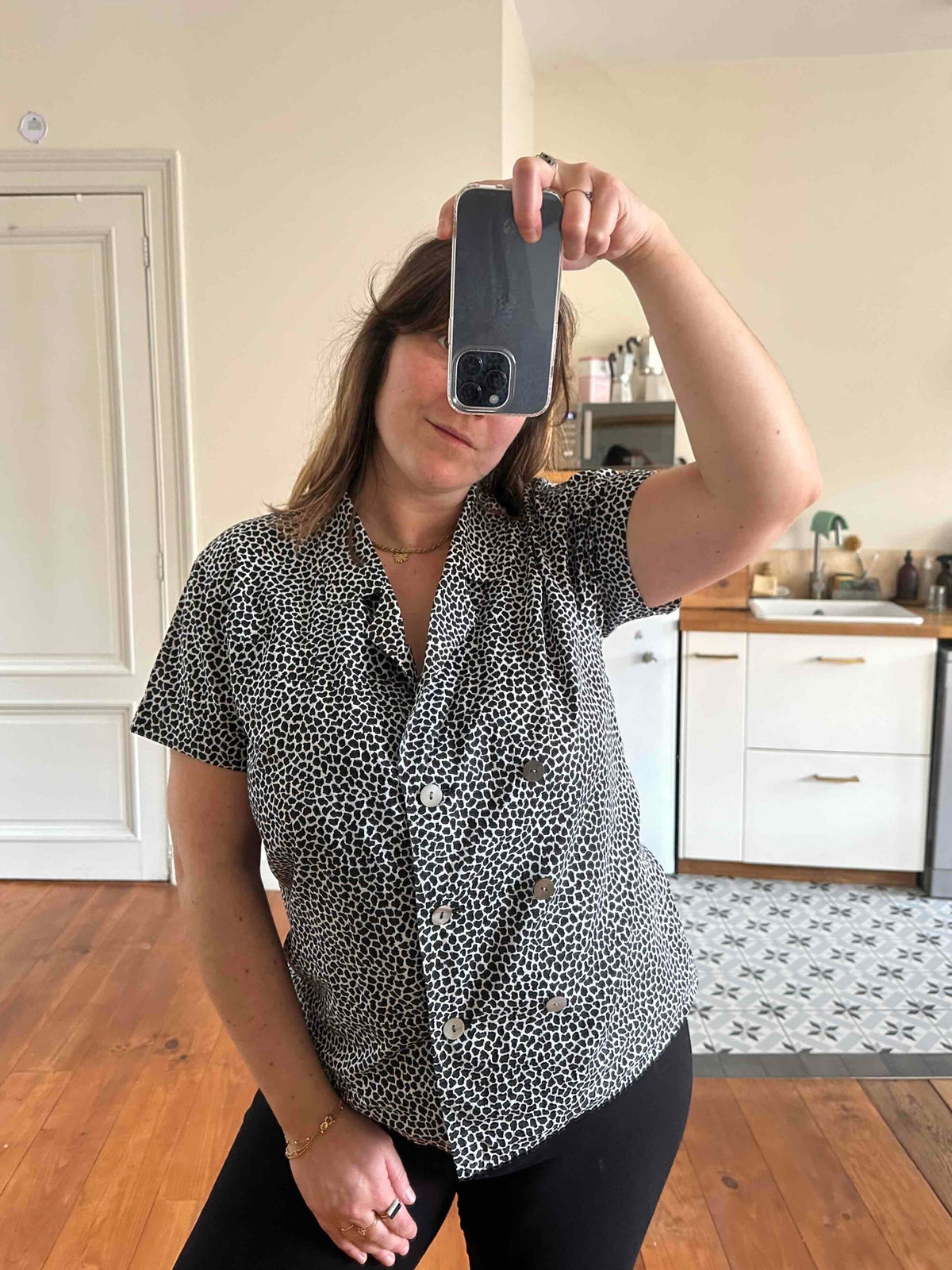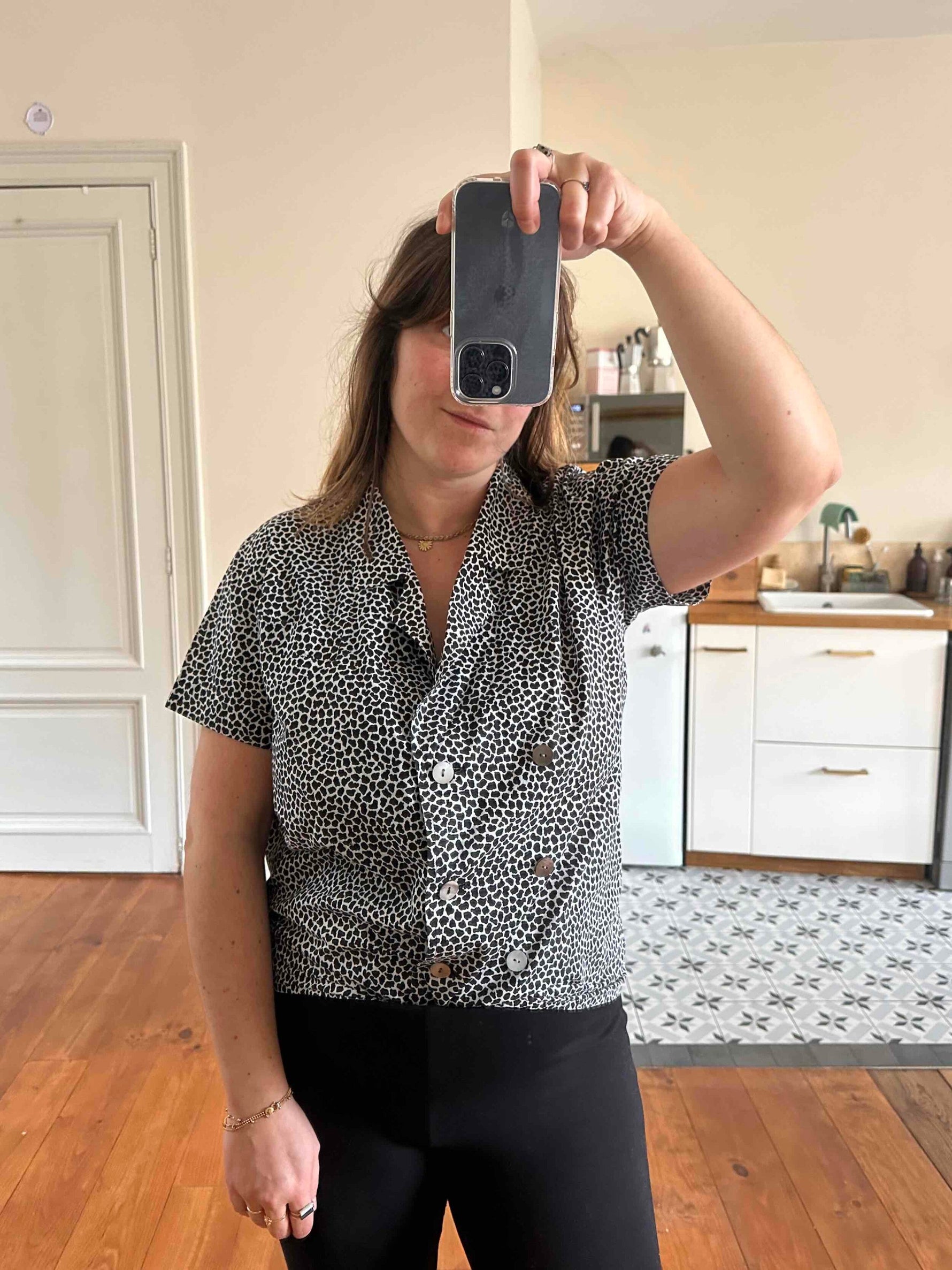 Prix unitaire parBlouse leopard Yves Saint Laurent, en 100% coton blanc imprimé petites tâches léopards noires, col chemisier, boutonnage croisé cache coeur en nacre, fabriqué en France, taille 38 et 40 portée ici sur un mannequin T36 et une personne T40.