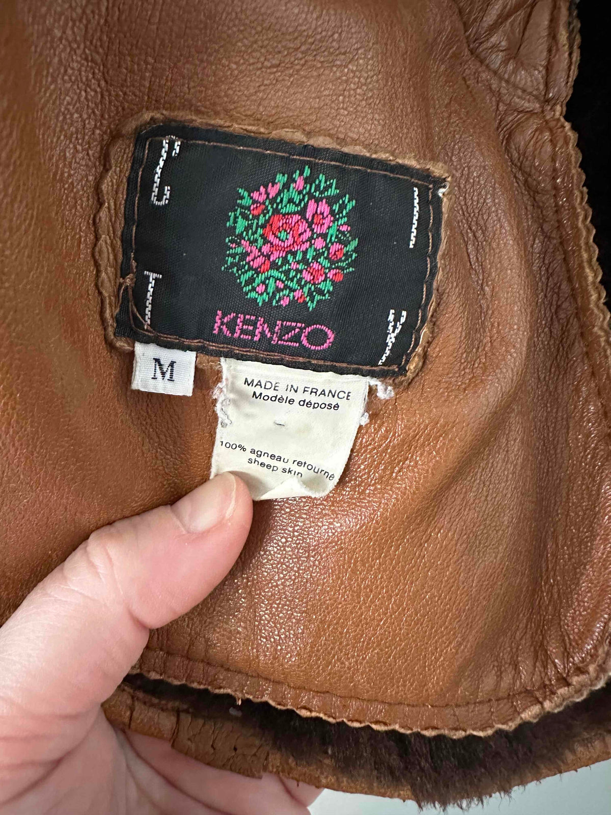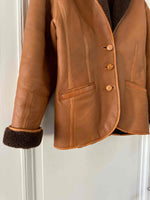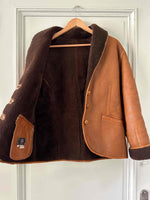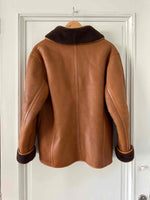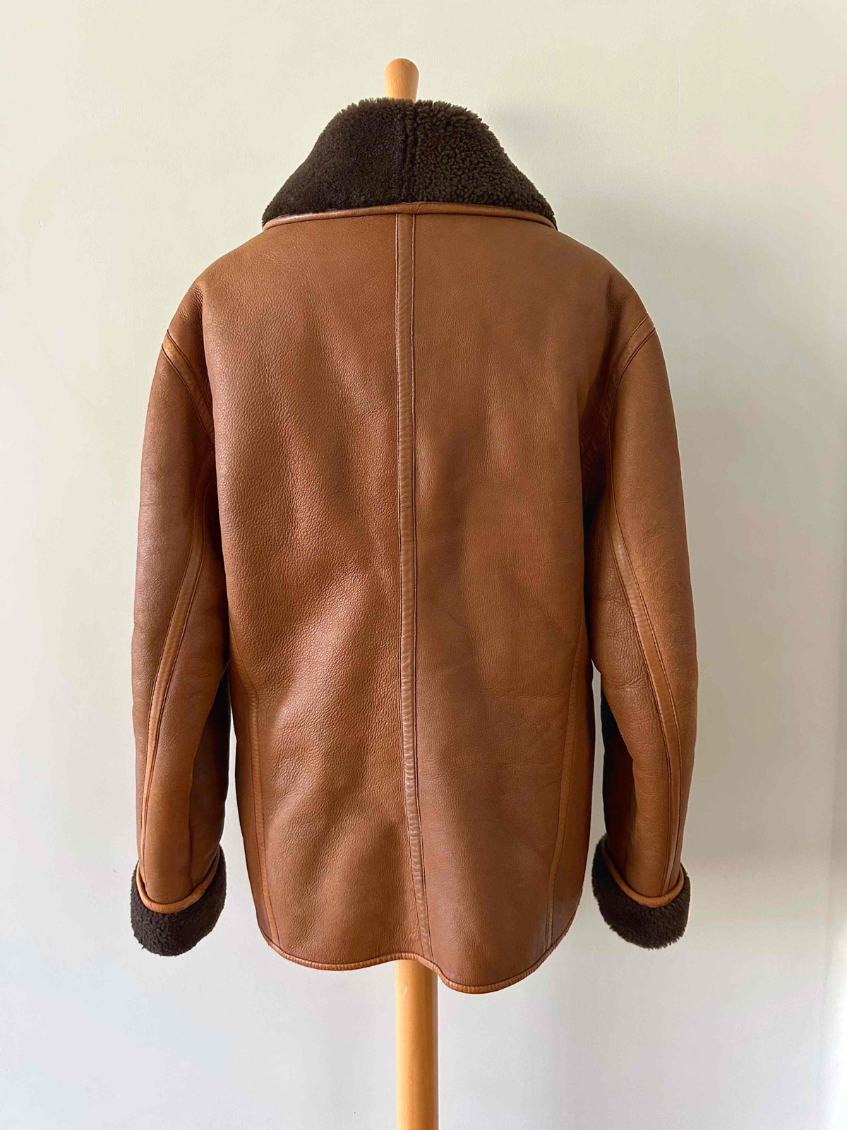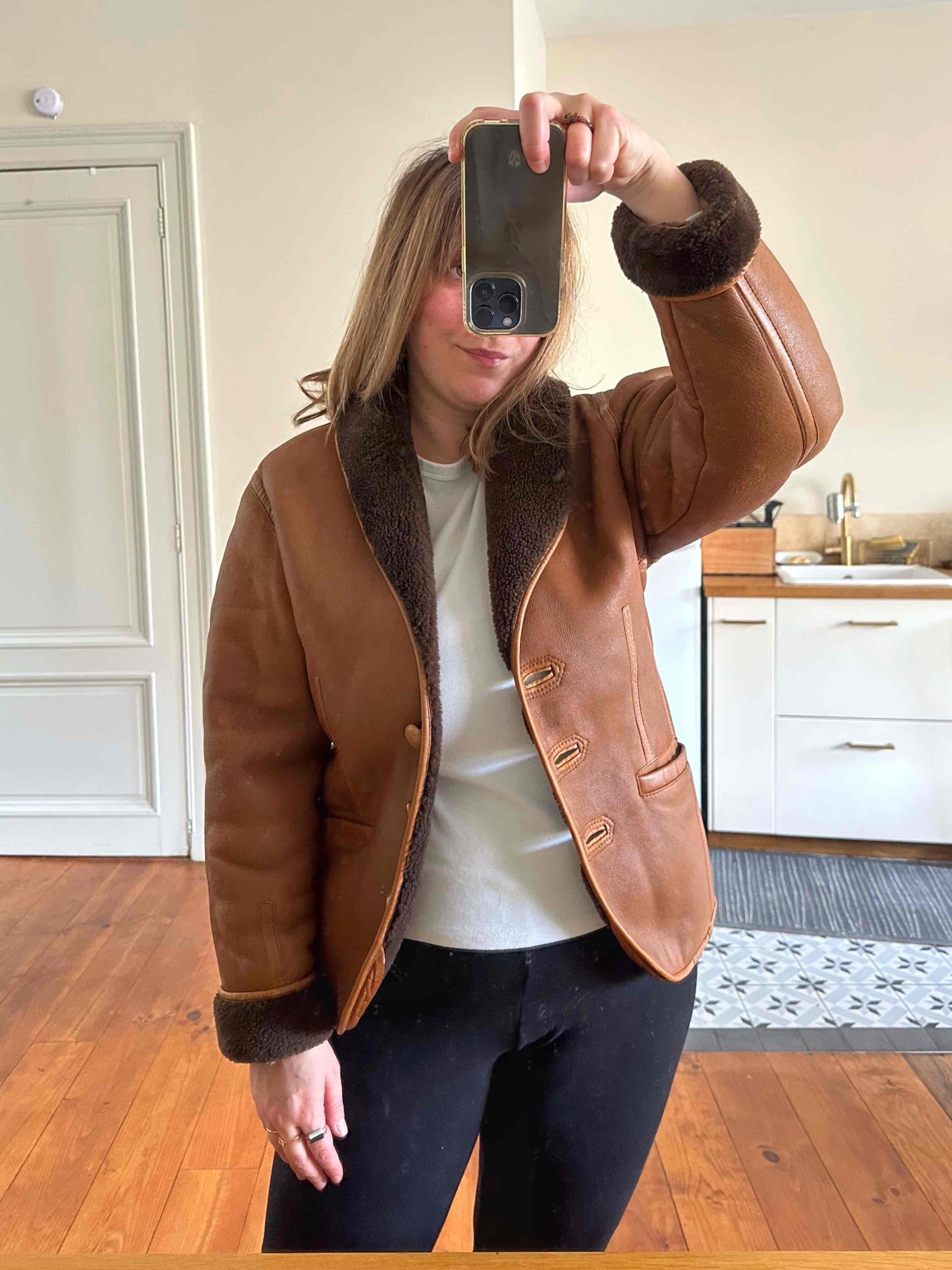 Bombardier Kenzo en peau lainée, en agneau retourné véritable, extérieur cuir caramel intérieur laine d'agneau chocolat, fabriqué en France, col châle croisé par boutons cuir, taille 36 porté ici sur un mannequin T36 et ouvert sur une personne T40.