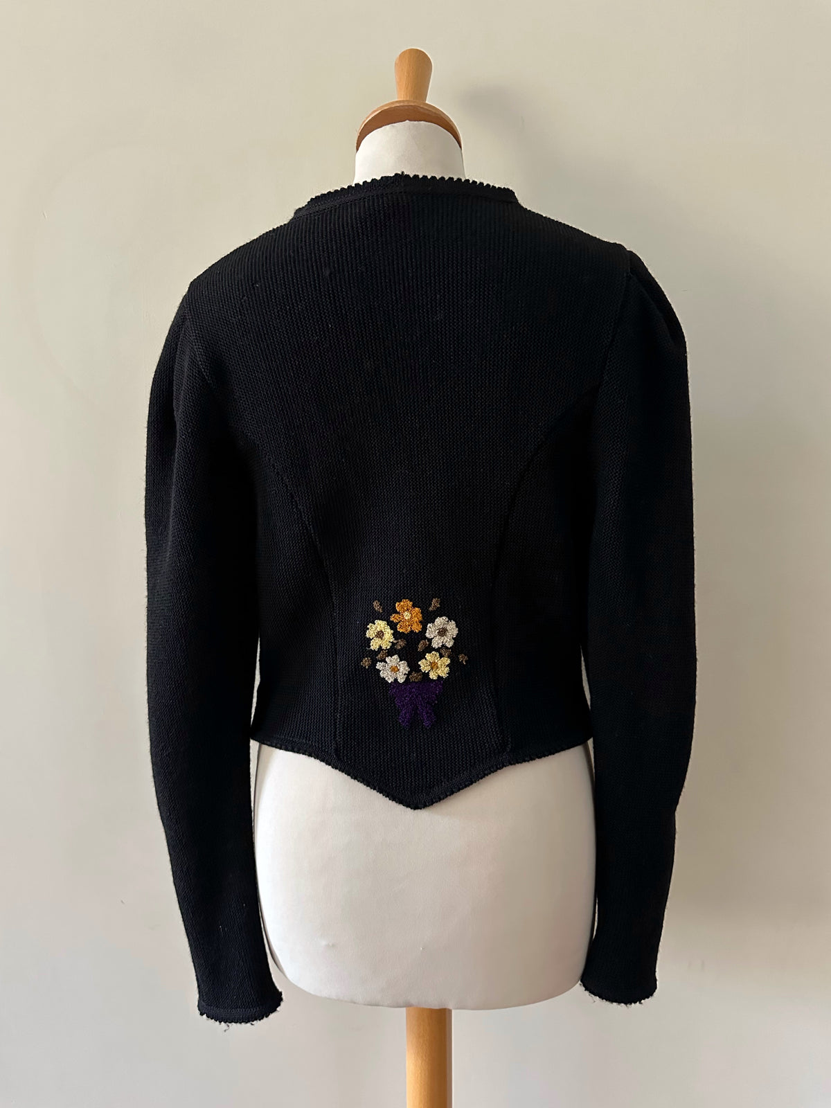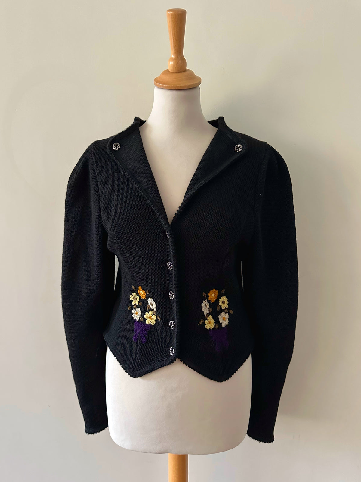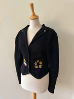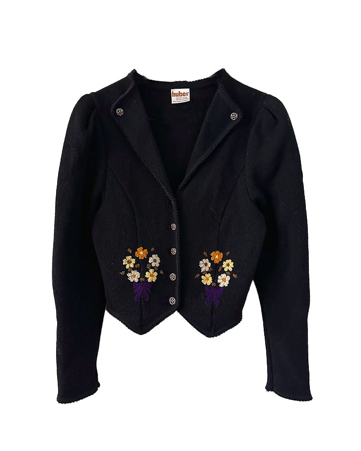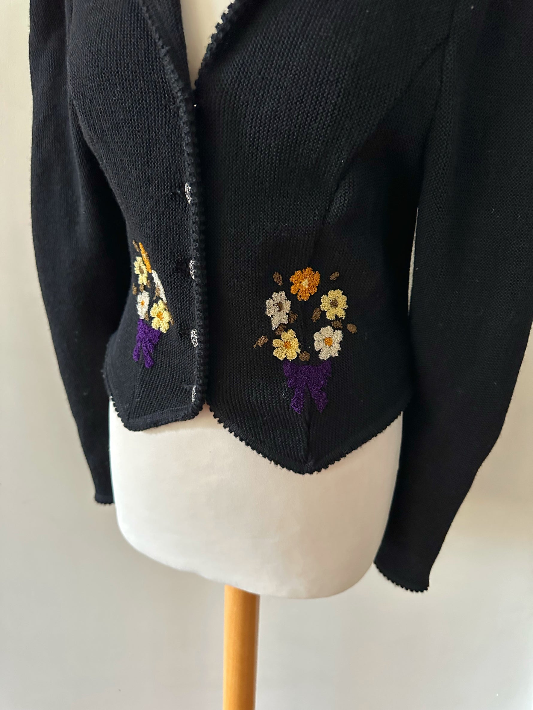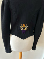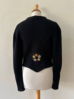 Prix unitaire parCardigan Autrichien, en pure laine noire, brodée de bouquets de fleurs violet, oranges, blanc jaune et vert olive. Encolure échancrée, manches ballons, boutons bijoux argentés, fabriqué en Autriche, convient aux tailles 34 et 36 porté ici sur un mannequin T36. Longueur dos 55cm Aisselles 44cm.