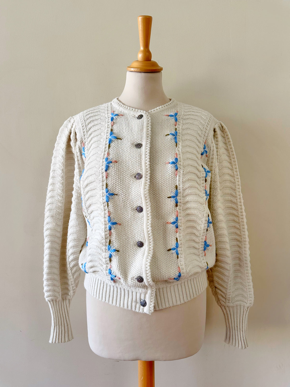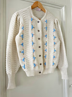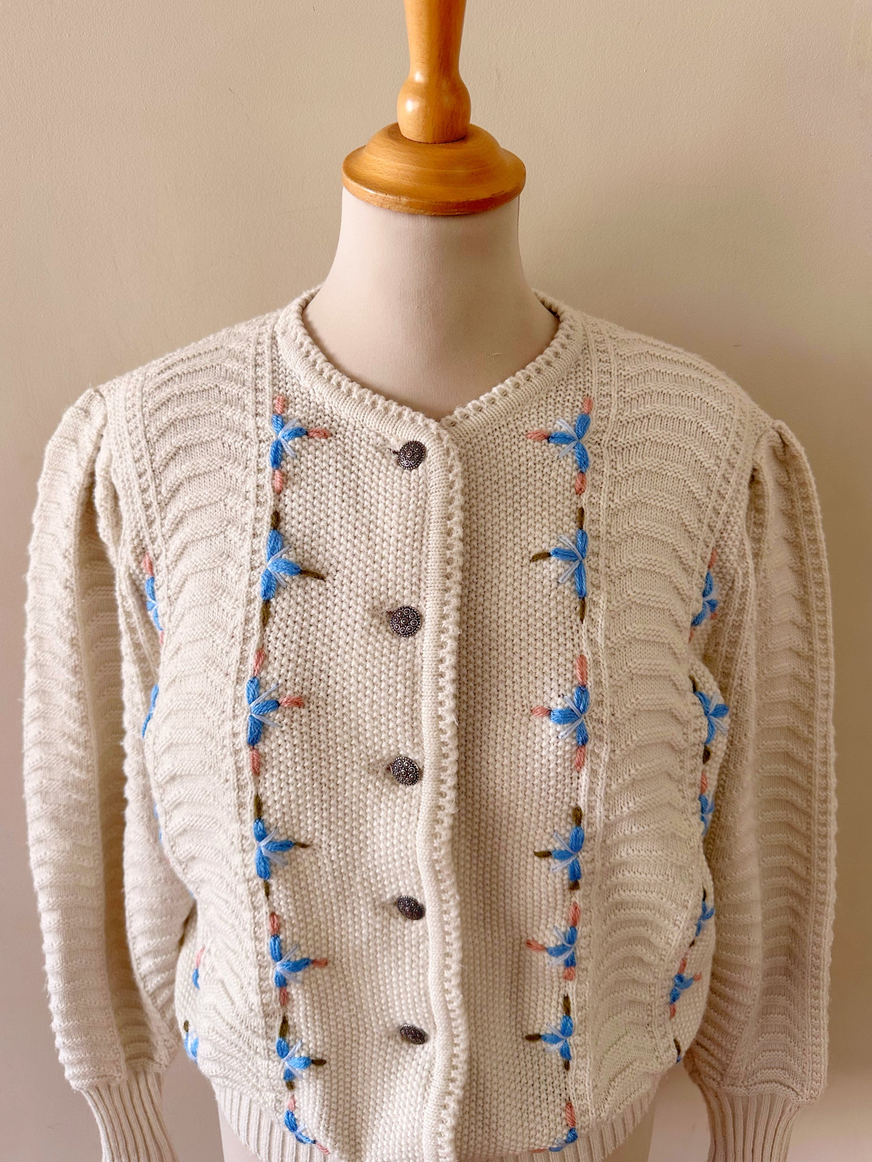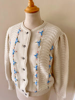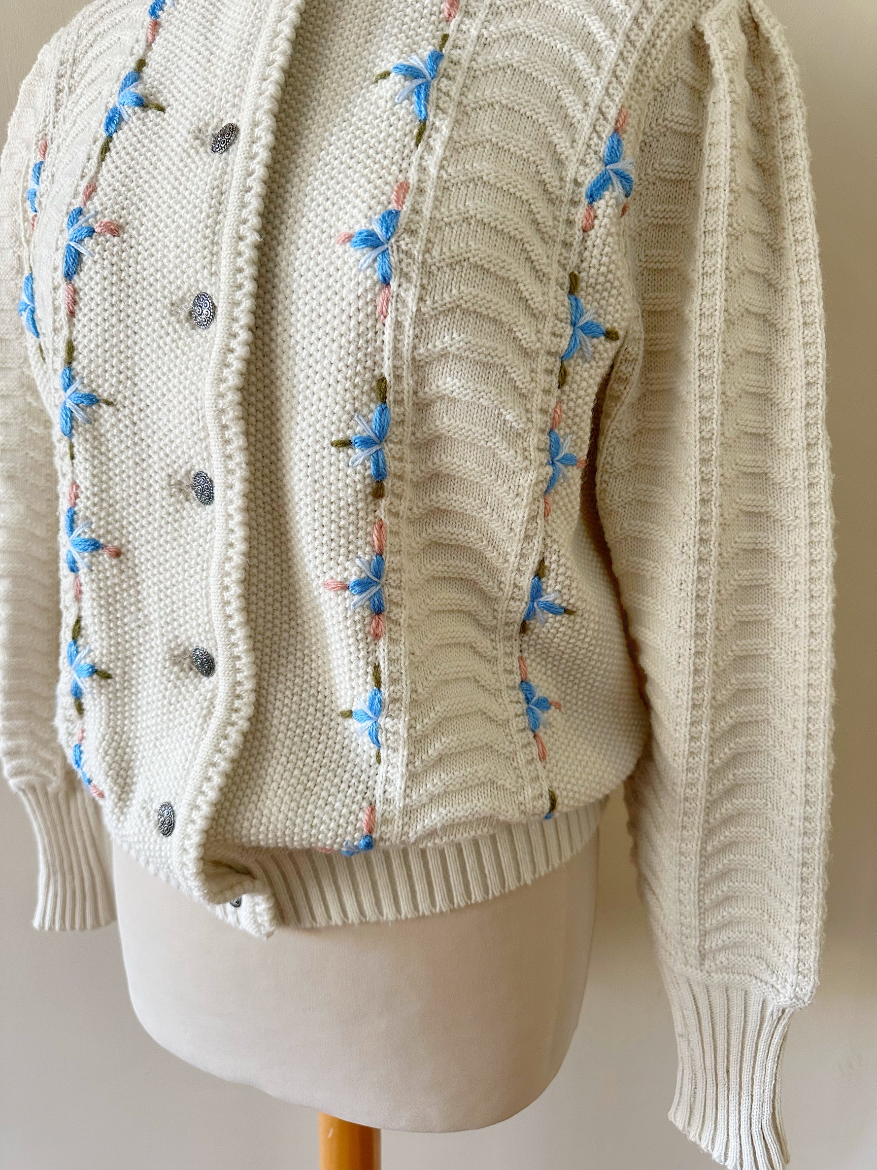 Prix unitaire parCardigan Autrichien en laine mélangée blanche, maille torsadée, brodé de fleurs bleues ciel, roses et vertes, boutons bijoux argentés fleuris, fabriqué en Autriche. Taille 36 porté ici sur un mannequin T36. Aisselles 45cm, Longueur 58cm
