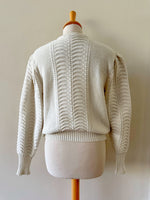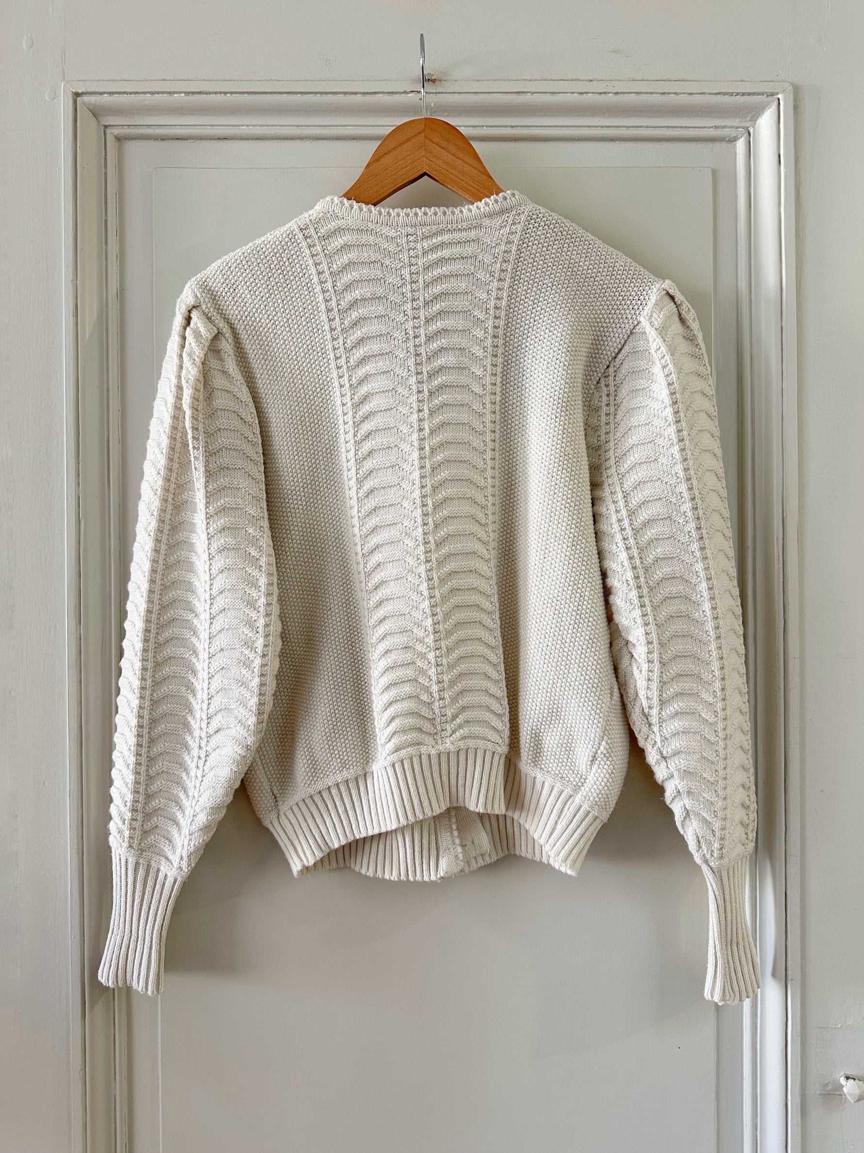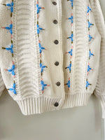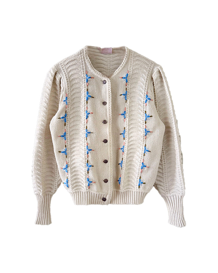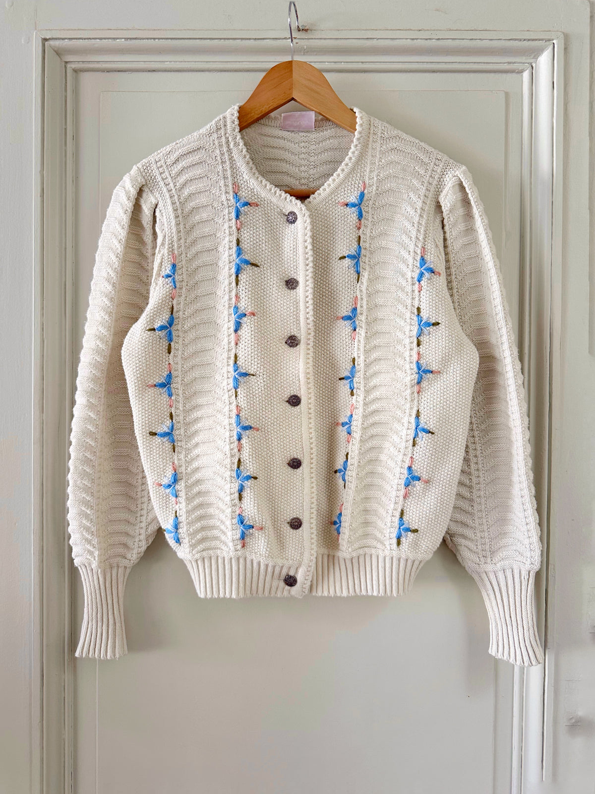 Prix unitaire parCardigan Autrichien en laine mélangée blanche, maille torsadée, brodé de fleurs bleues ciel, roses et vertes, boutons bijoux argentés fleuris, fabriqué en Autriche. Taille 36 porté ici sur un mannequin T36. Aisselles 45cm, Longueur 58cm