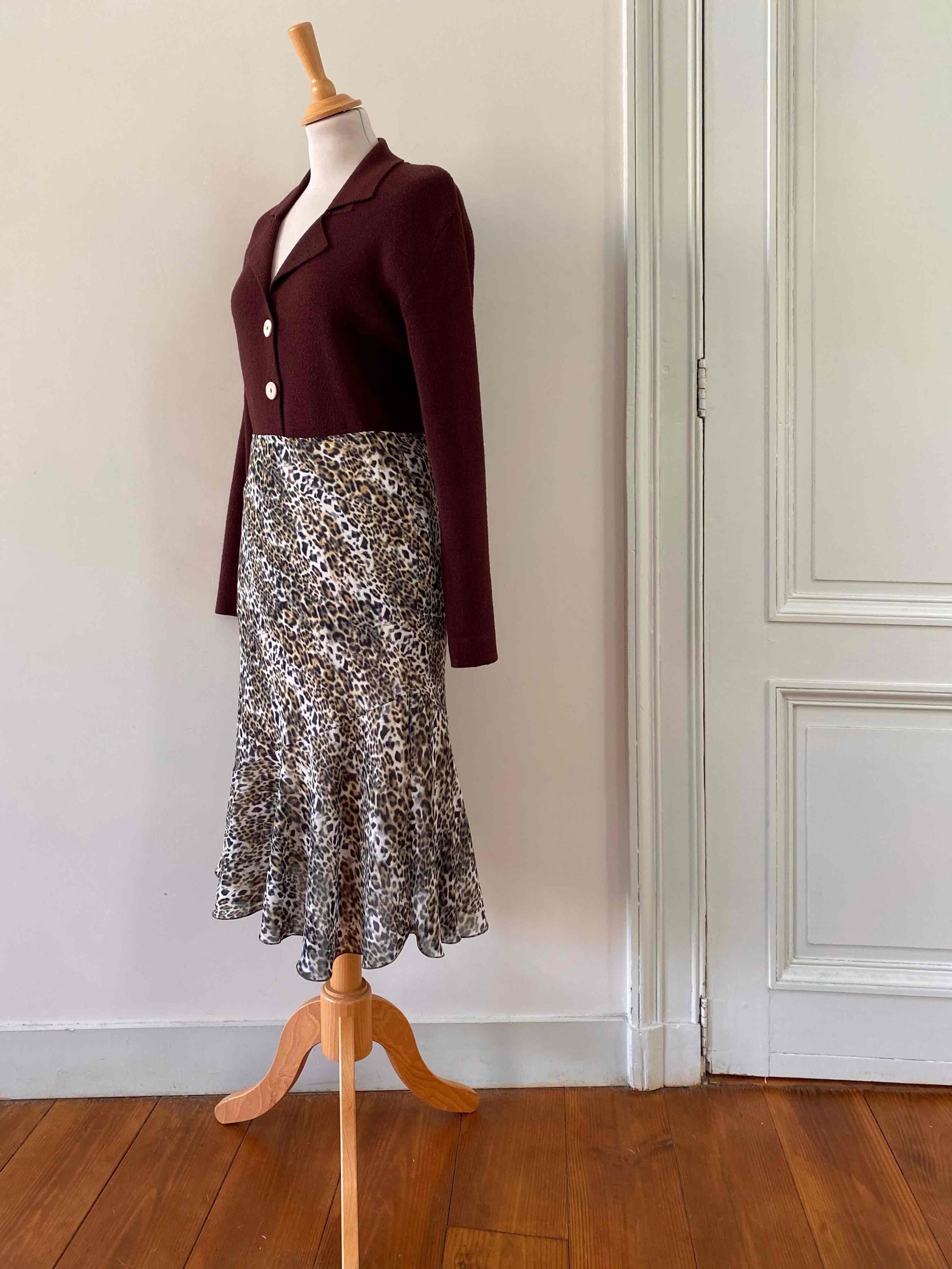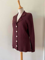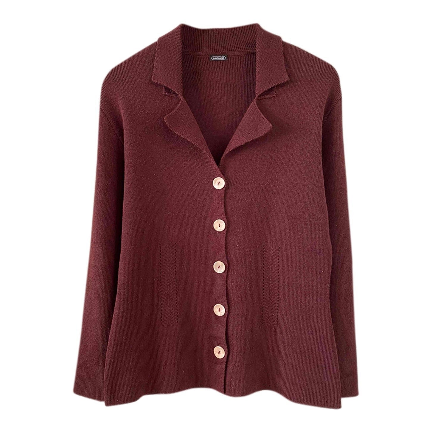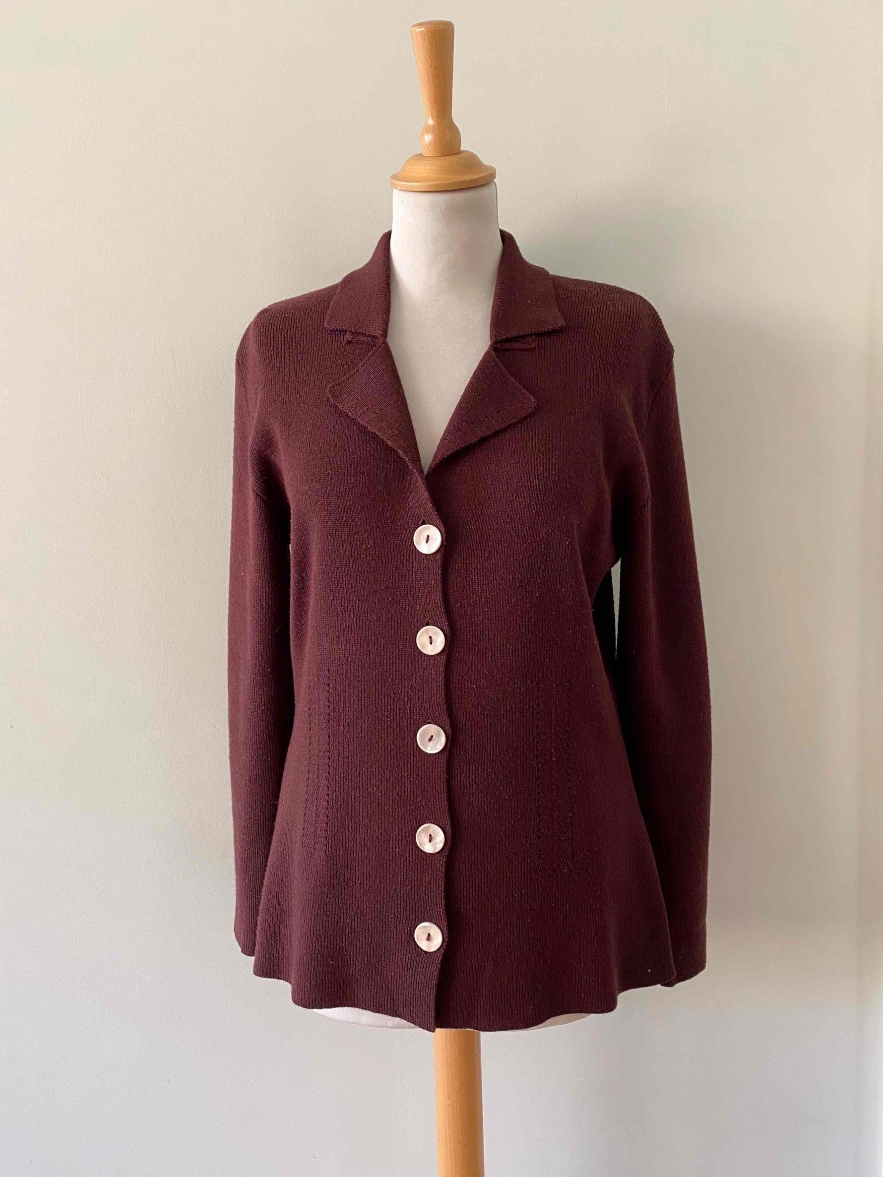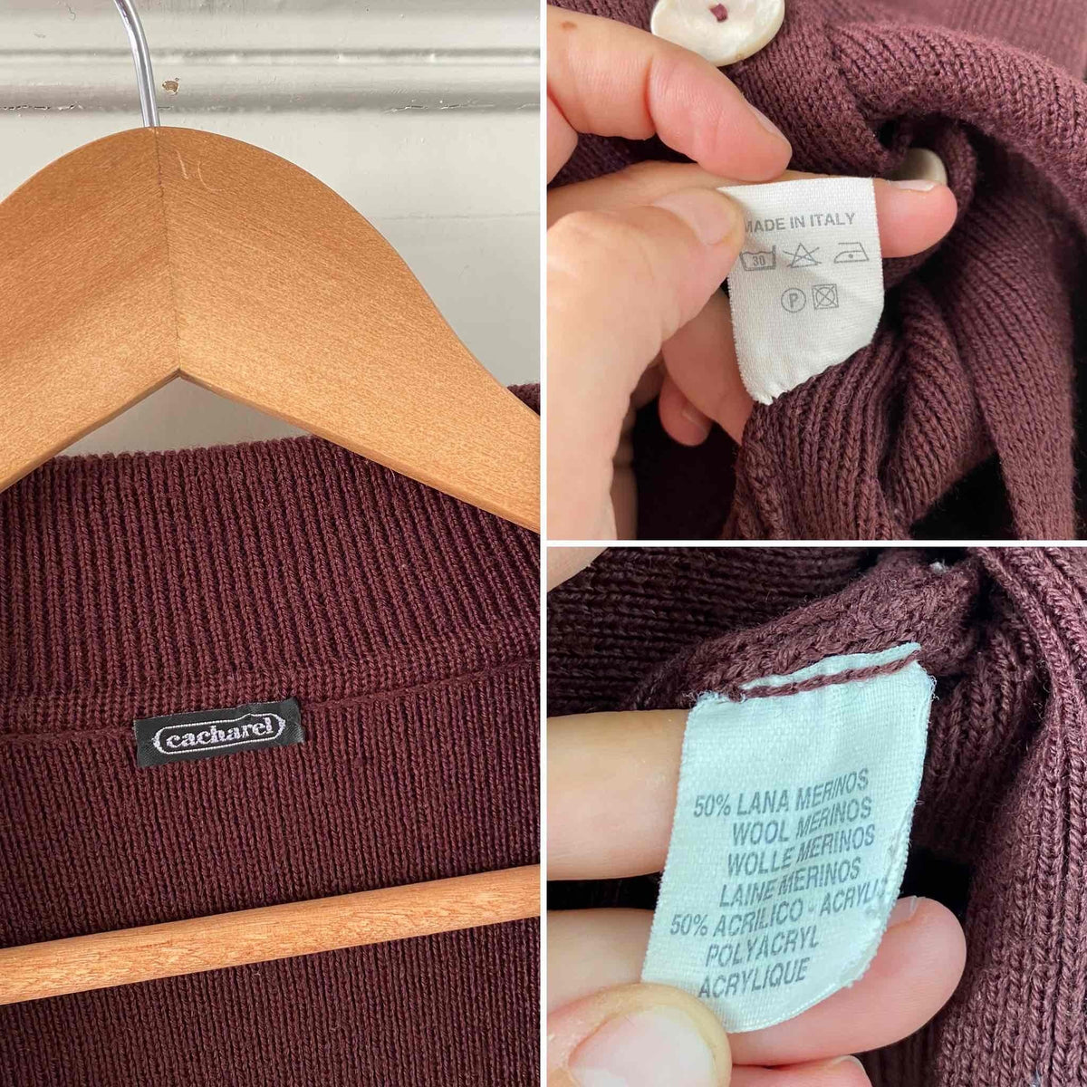 Cardigan Cacharel en laine merinos mélangée, chocolat, col chemisier, gros boutons nacres, détails de maille ajourée, fabriqué en Italie, taille 38 portée ici sur un mannequin T36.