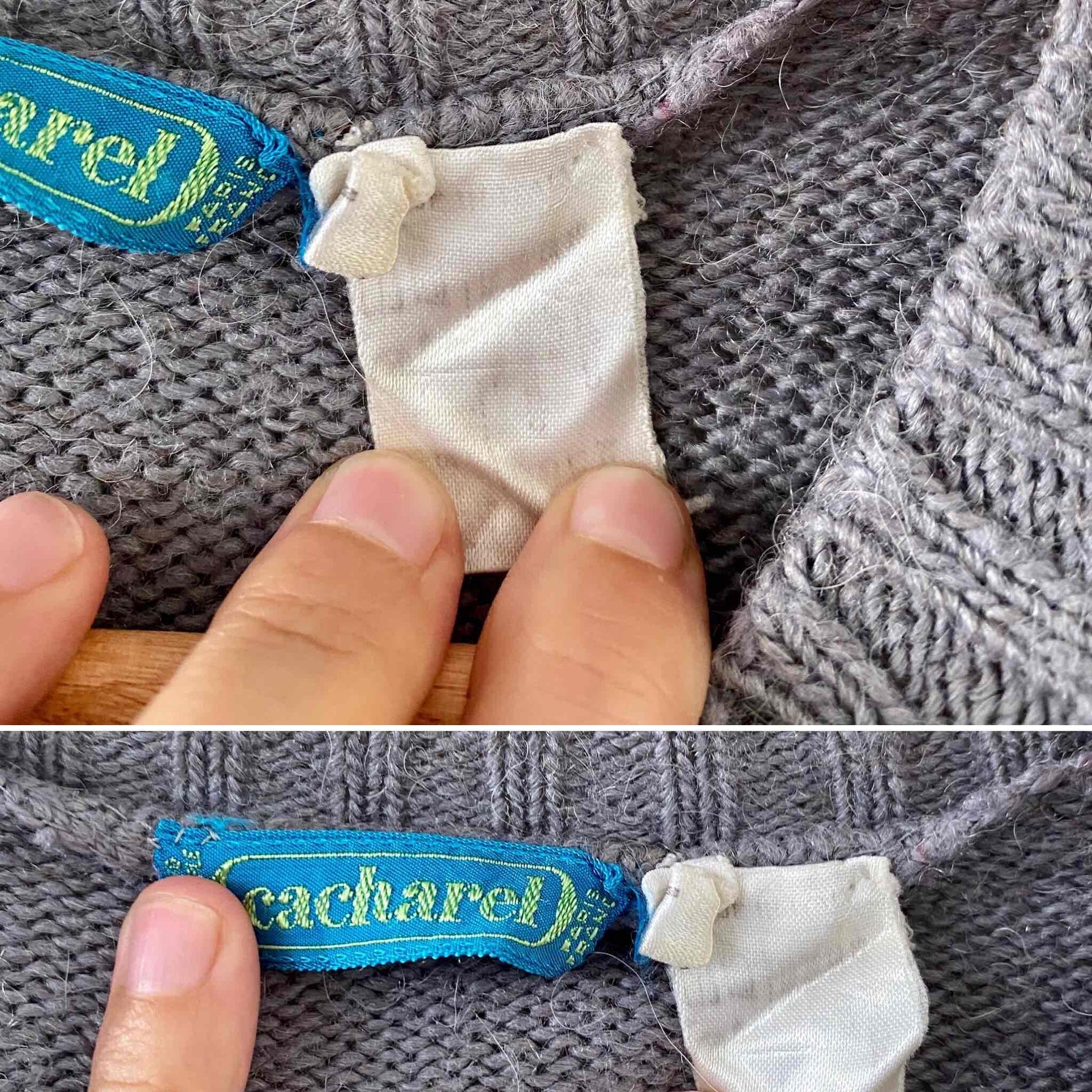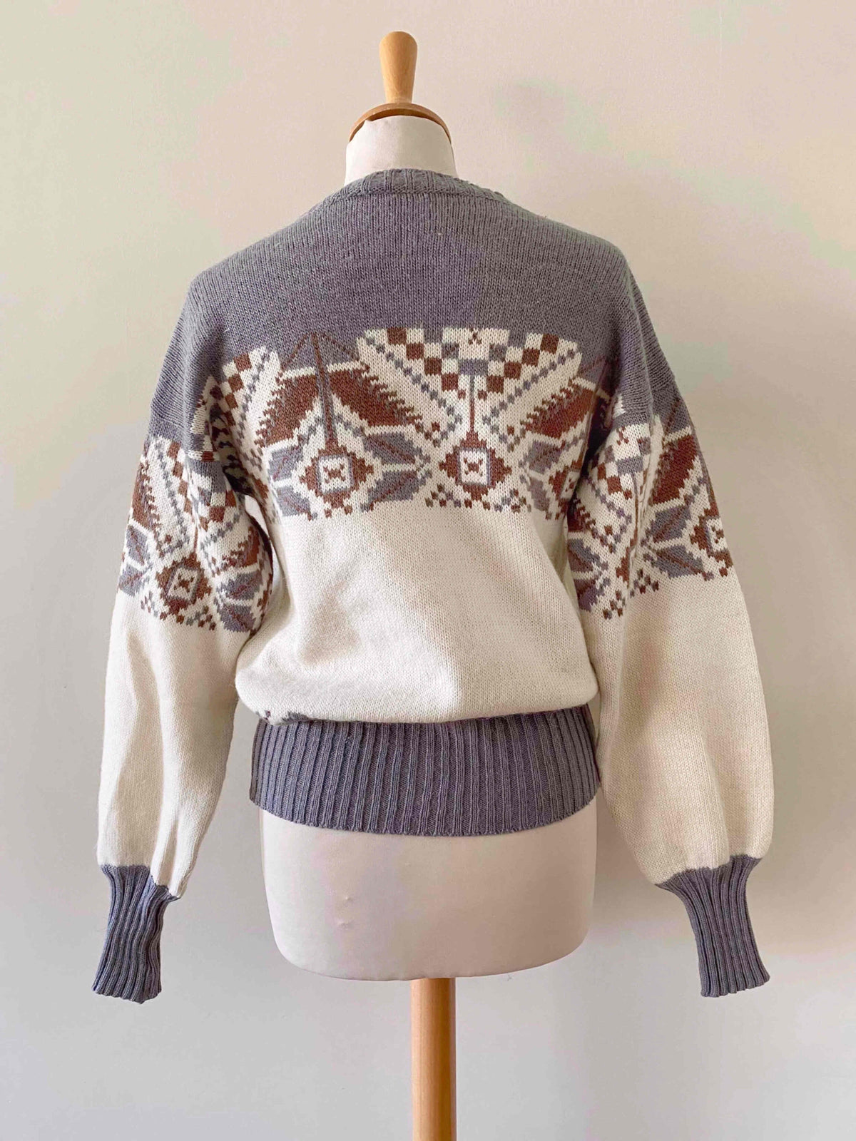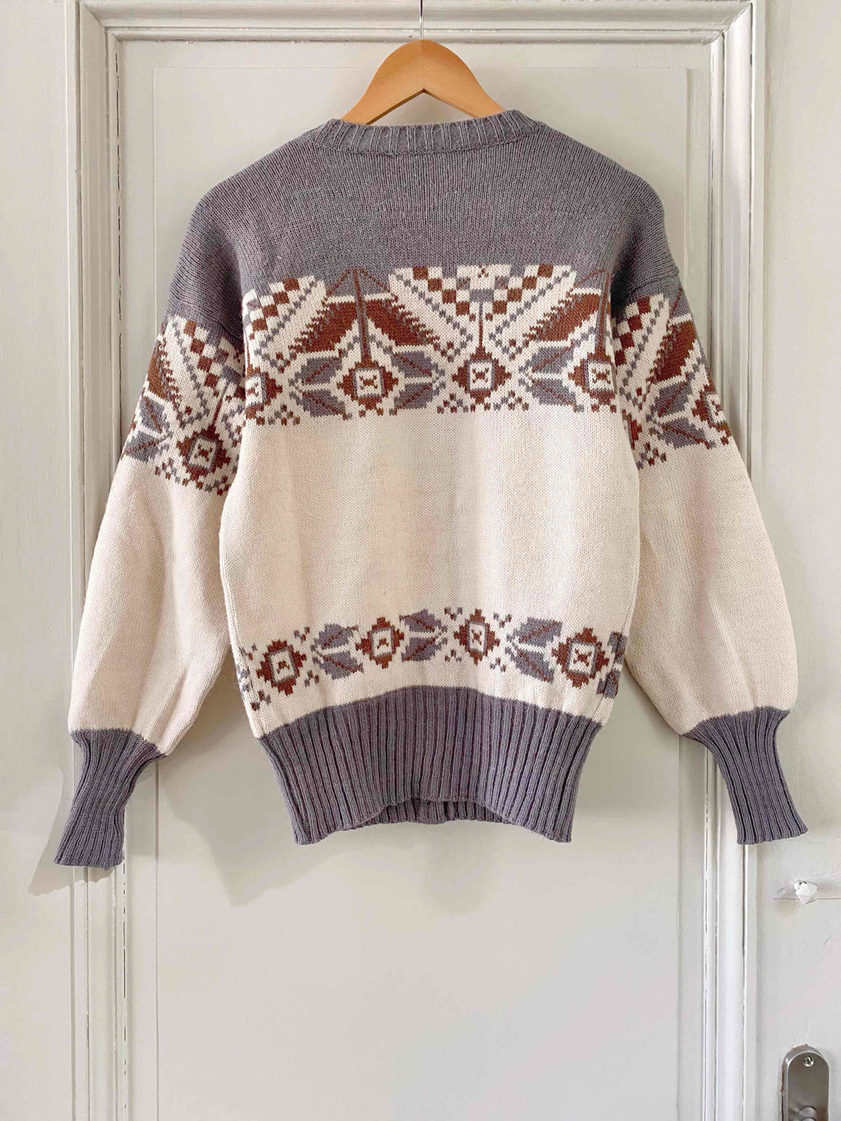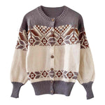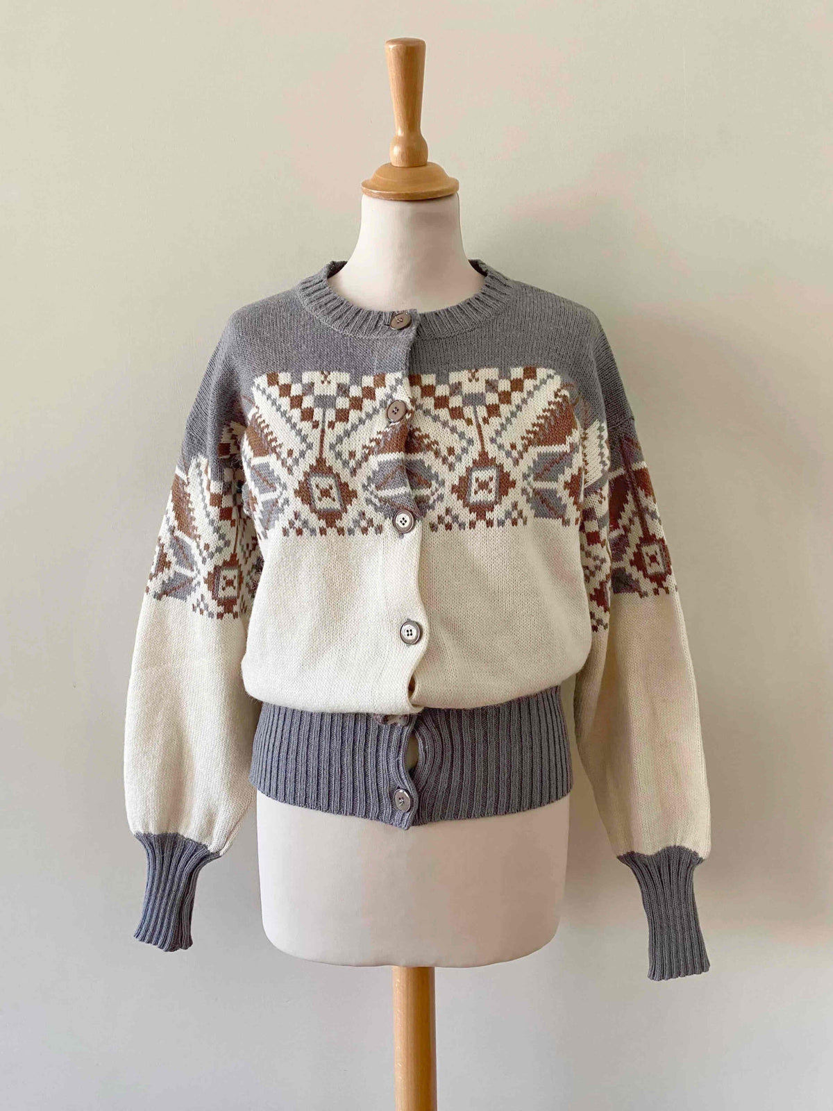 Cardigan Cacharel en laine merinos mélangée, motifs jacquards nordiques écru, gris chiné, caramel, forme blousante taille à large bord côte, fabriqué en France, taille 36 porté ici sur un mannequin T36.