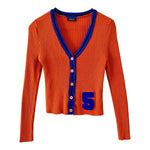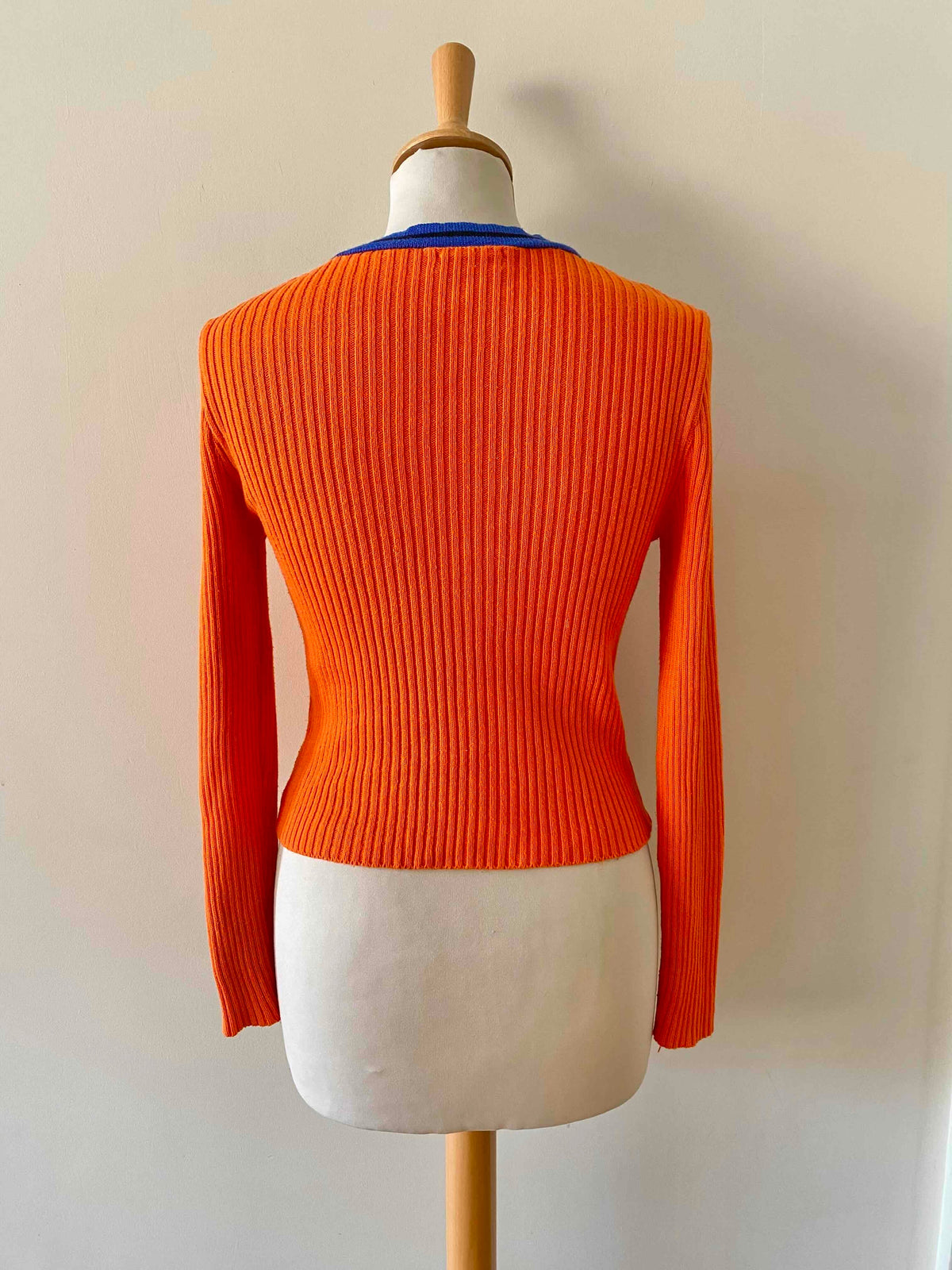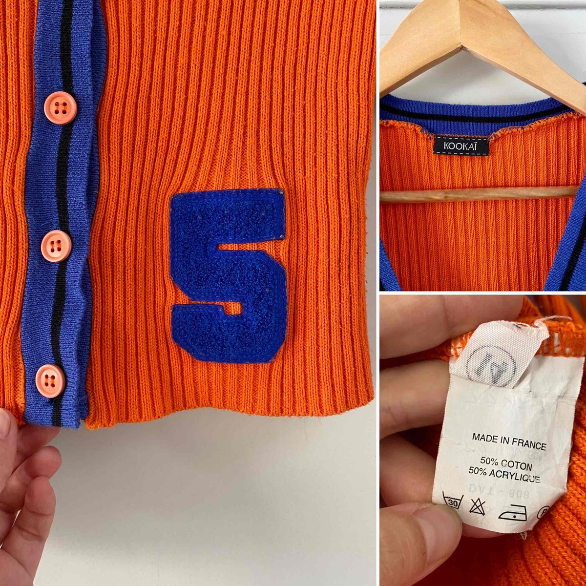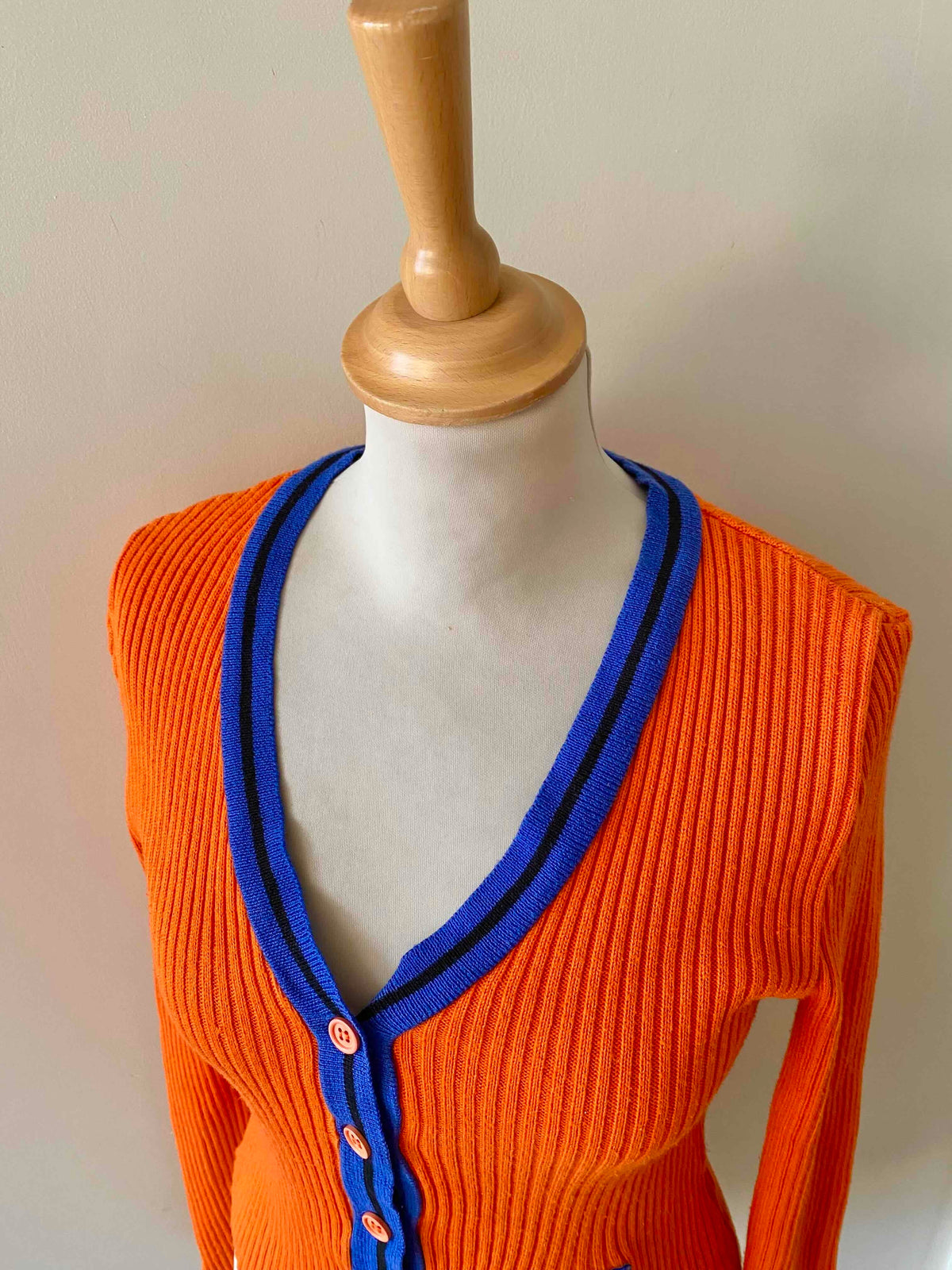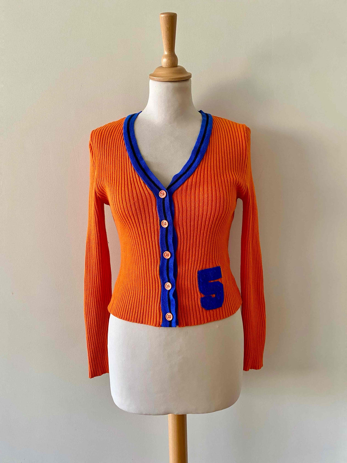Prix unitaire parCardigan côtelé en coton mélangé, maille côtelée orange et bleu électrique, boutons oranges, patch chiffre 5 brodé en bas en tufté eponge bleu, fabriqué en France, taille 34 et 36 porté ici sur un mannequin T36.