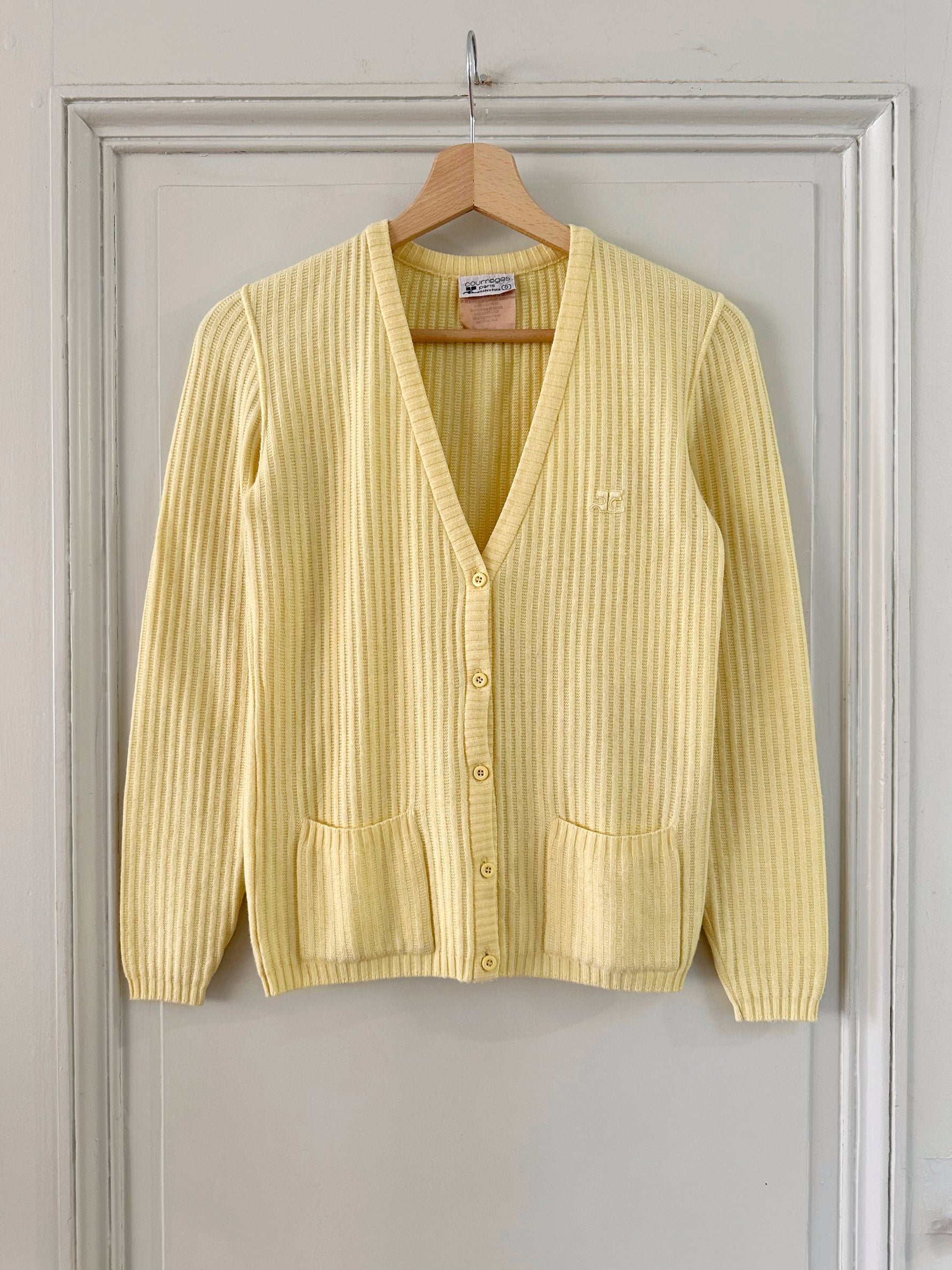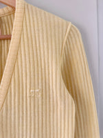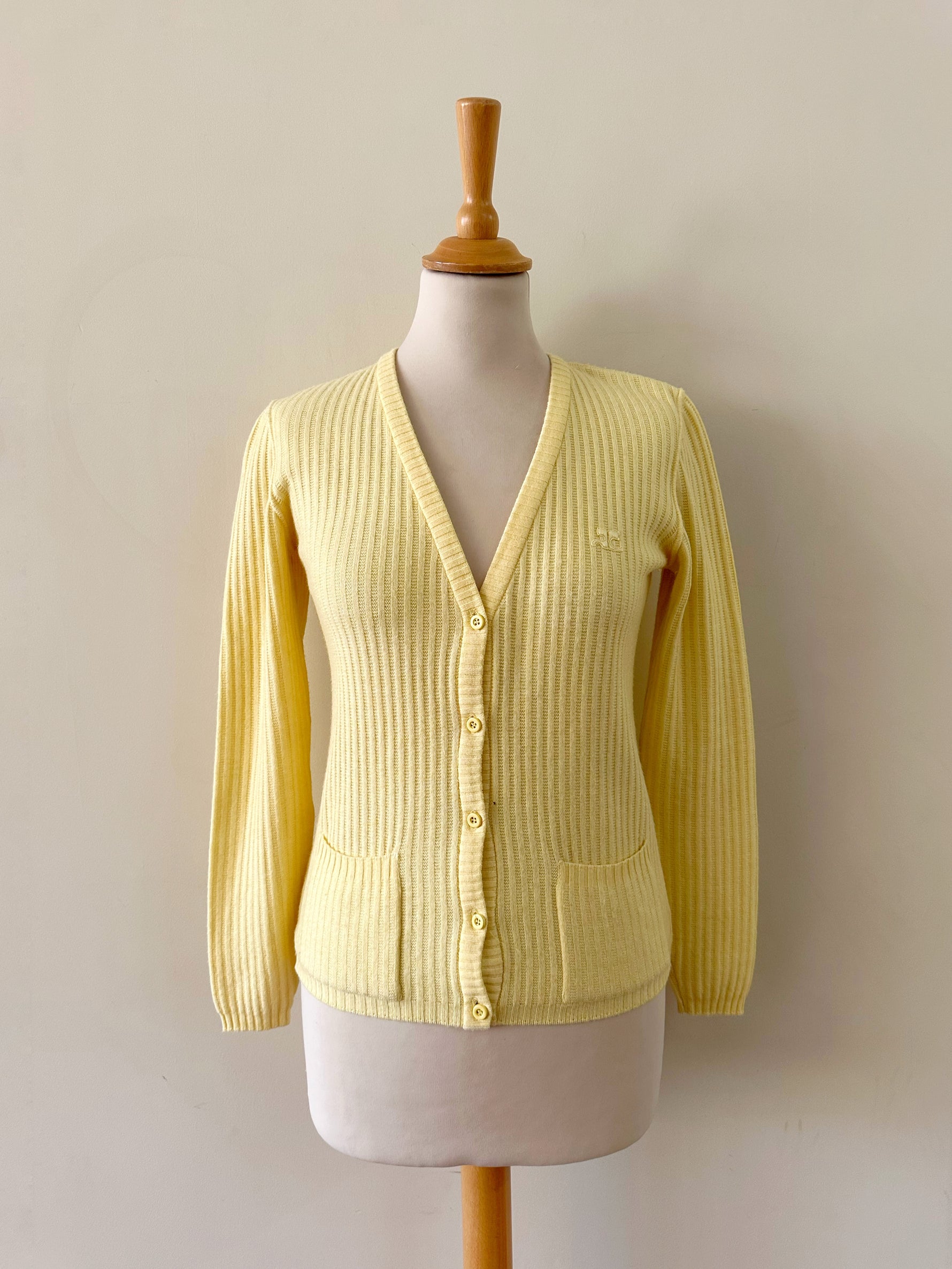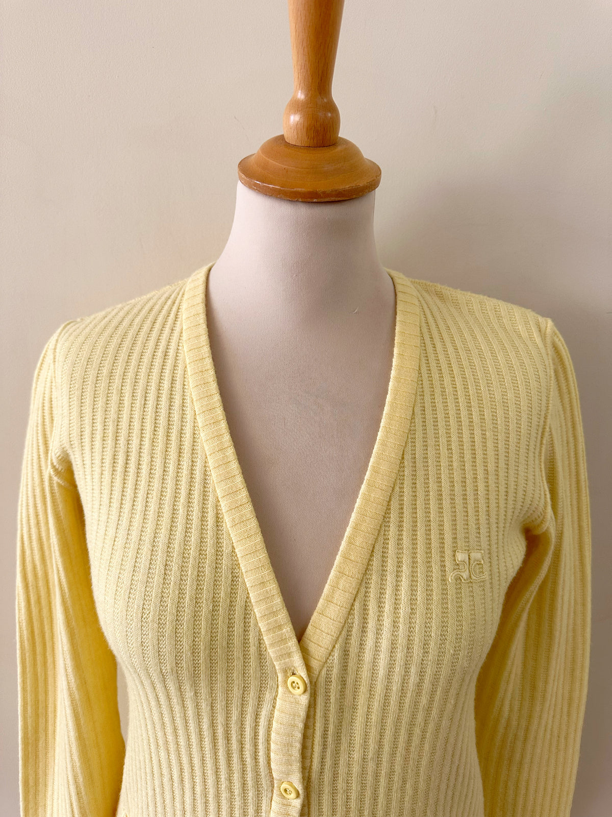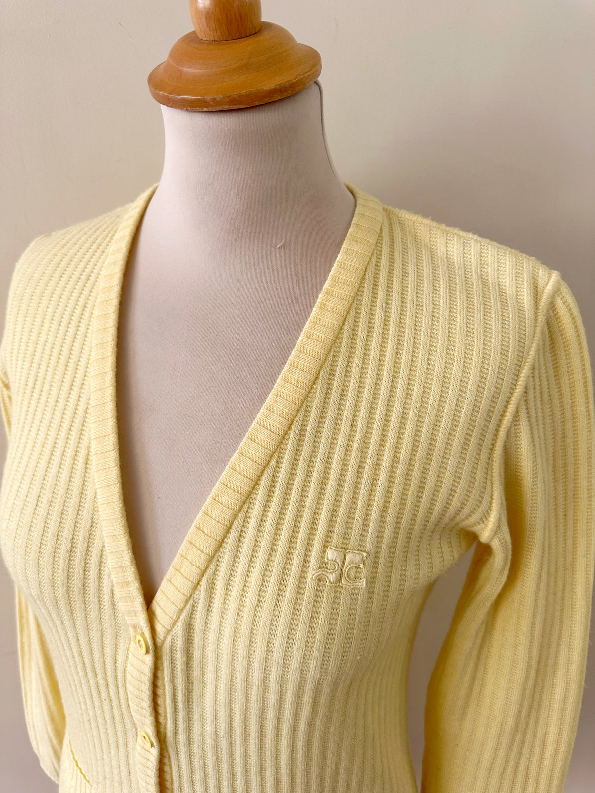 Prix unitaire parCardigan Courrèges, maille côtelée en laine mélangée jaune pastel butter yellow, logo brodé, col V, poches côtés, fabriqué en France, taille 36 porté ici sur un mannequin T36.Aisselles 44cm Longueur 55cm.