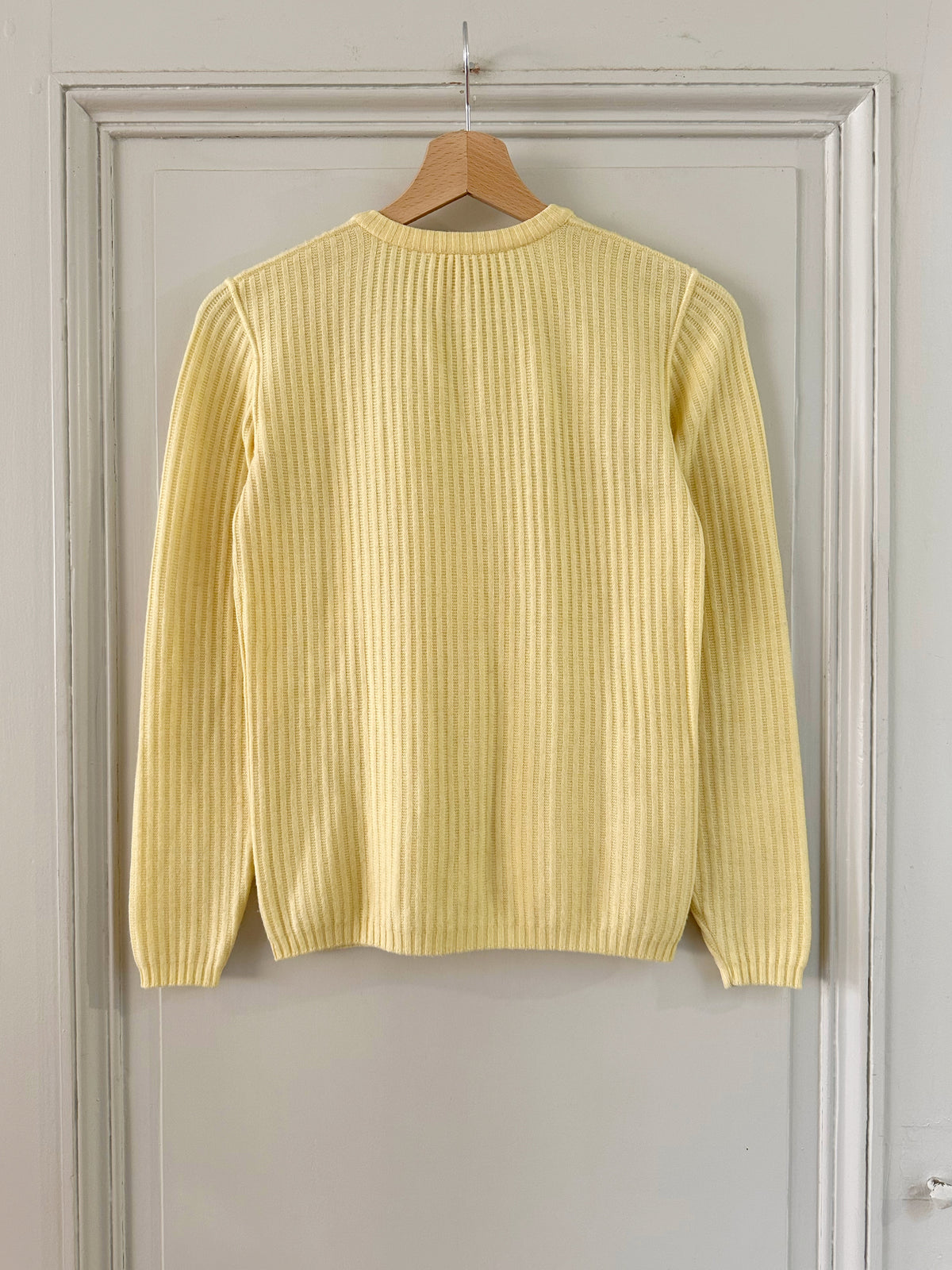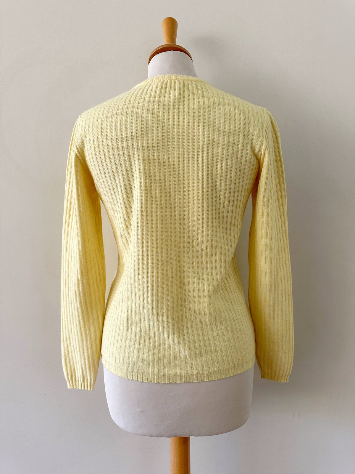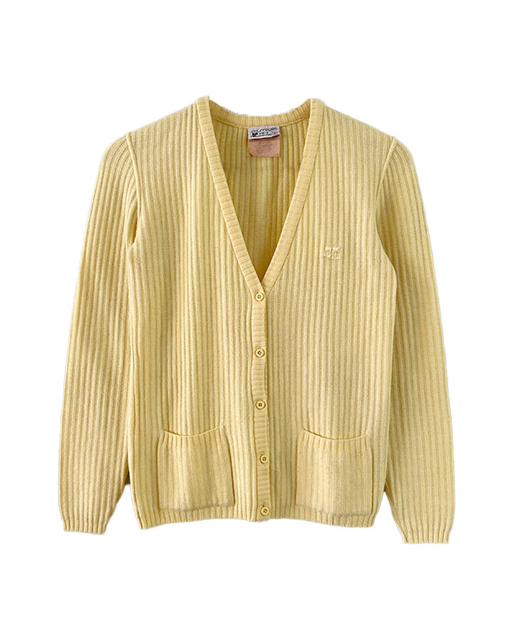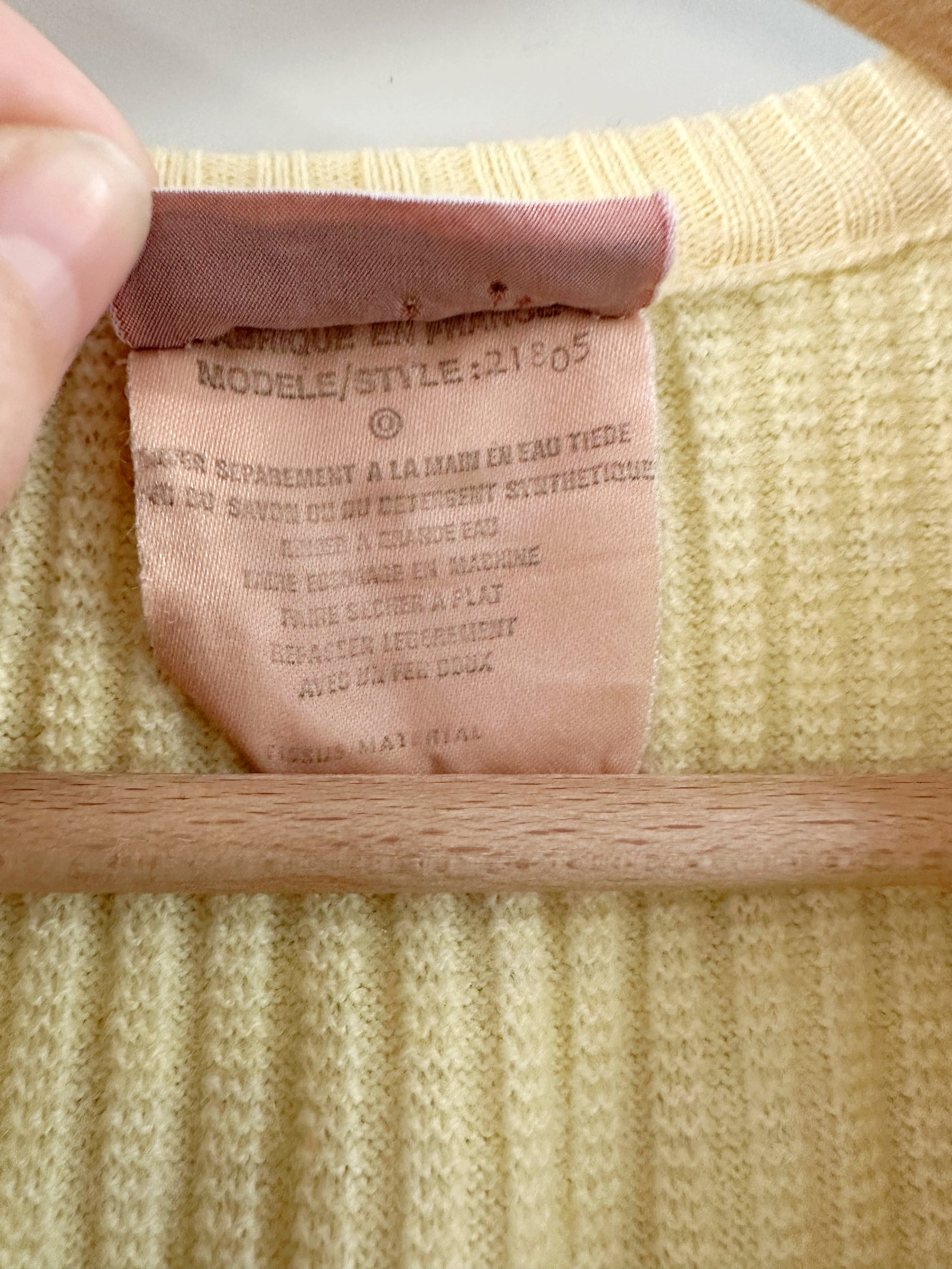 Prix unitaire parCardigan Courrèges, maille côtelée en laine mélangée jaune pastel butter yellow, logo brodé, col V, poches côtés, fabriqué en France, taille 36 porté ici sur un mannequin T36.Aisselles 44cm Longueur 55cm.