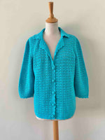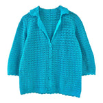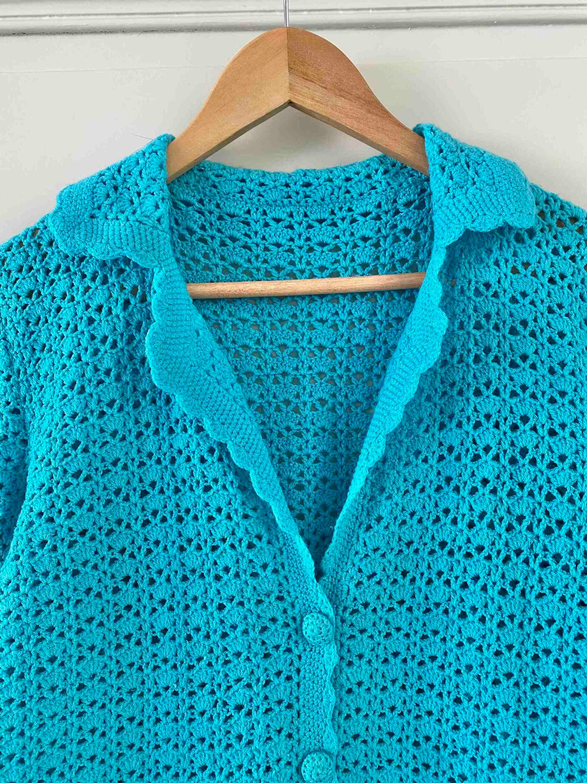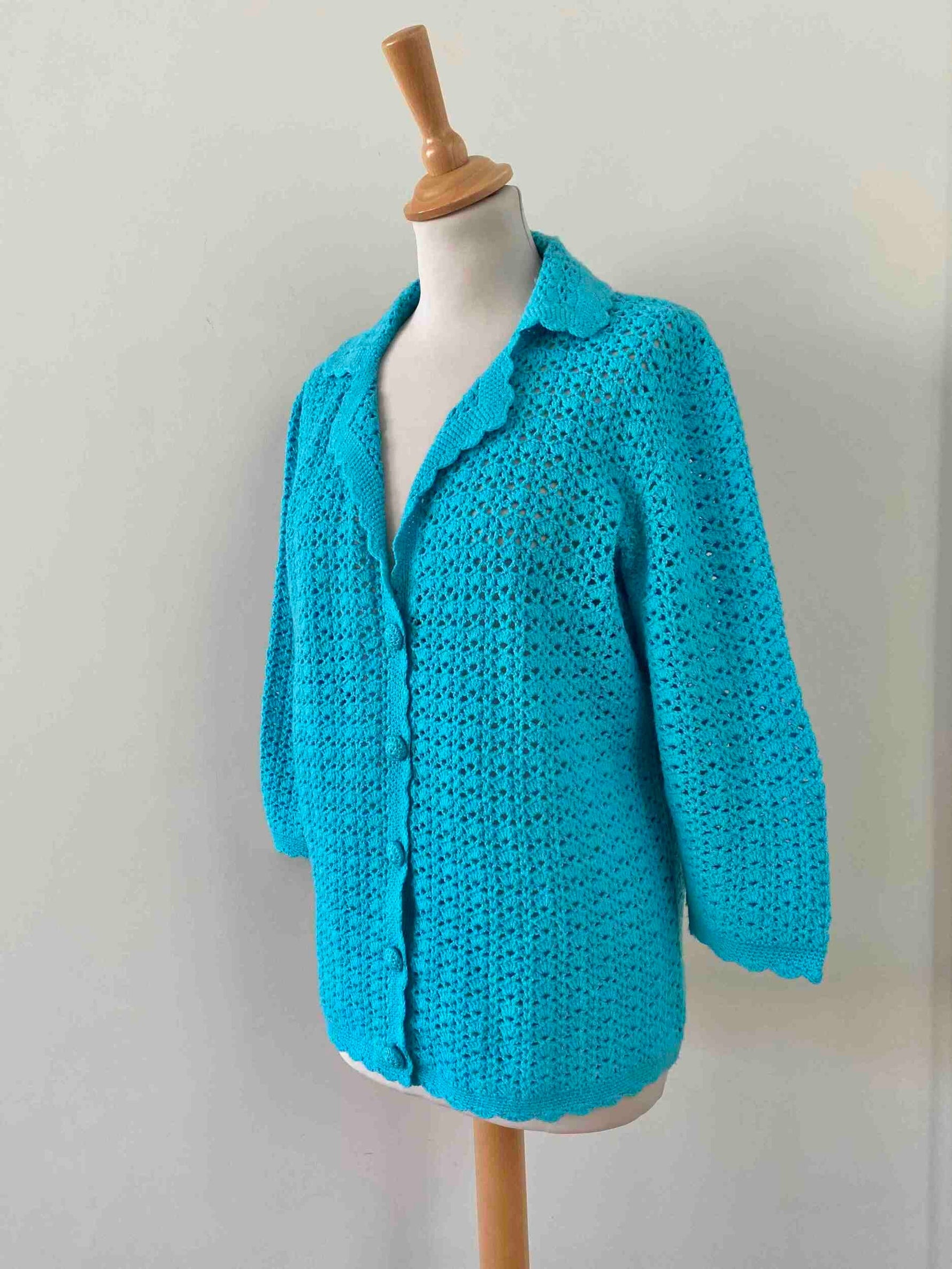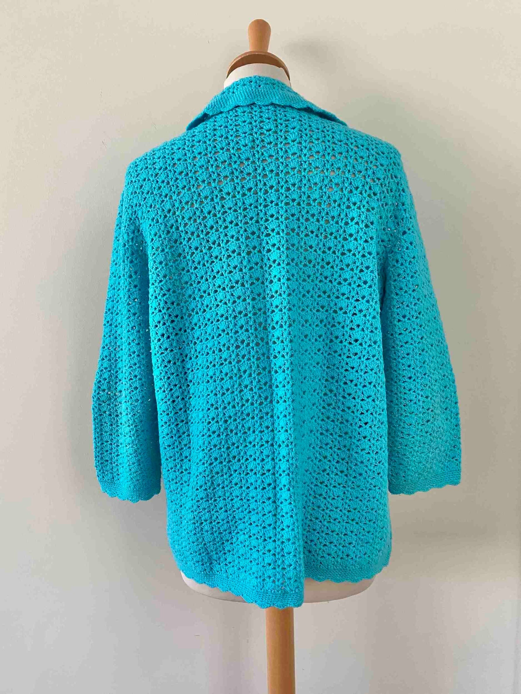 Prix unitaire parCardigan en Crochet bleu piscine, col polo, boutons au crochet, manches trois quarts, tricoté main, années 70’s. Porté ici en 36.