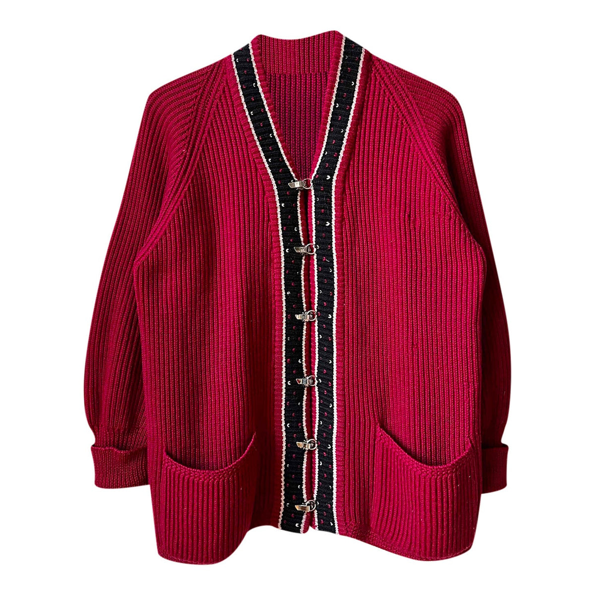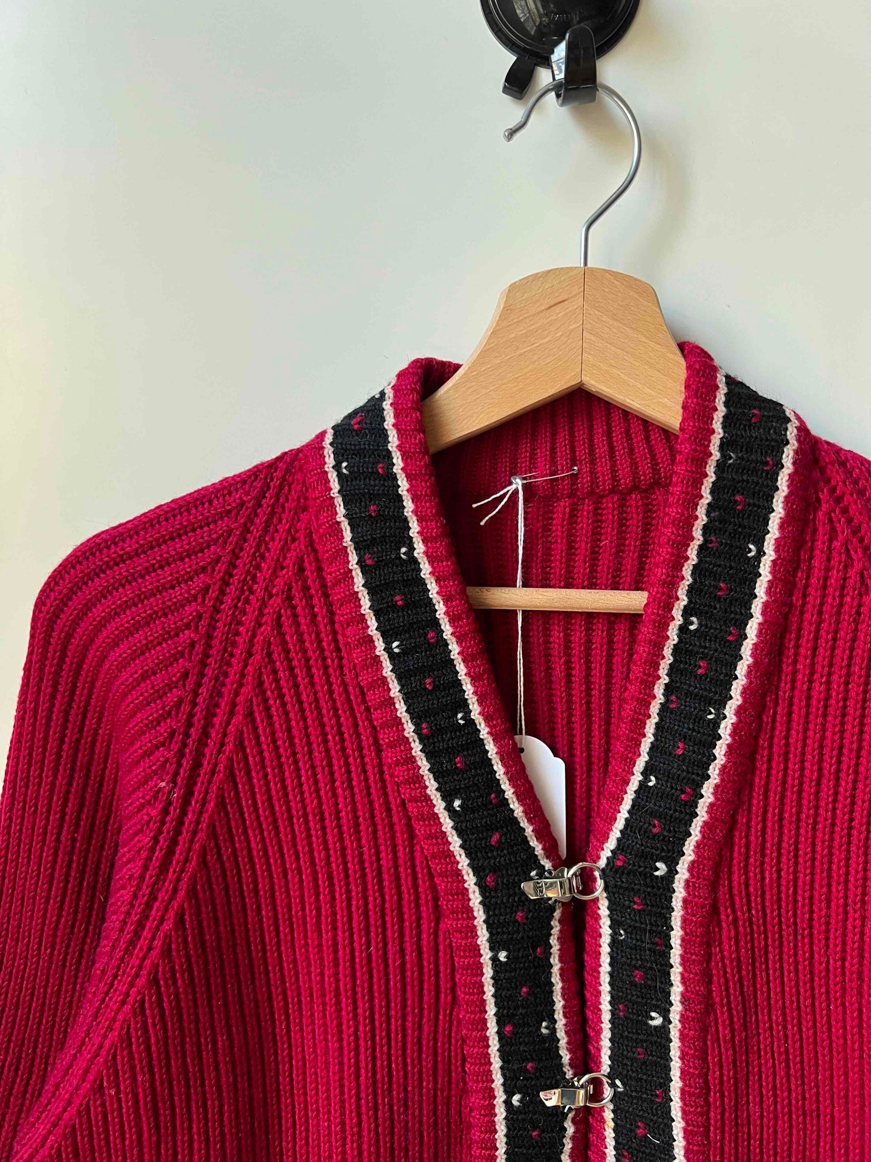 Prix unitaire parCardigan oversize en laine rouge bordeaux avec des détails noir. Fermeture par des crochets en métal argenté. Taille 36 à 40.