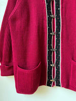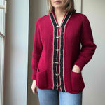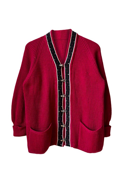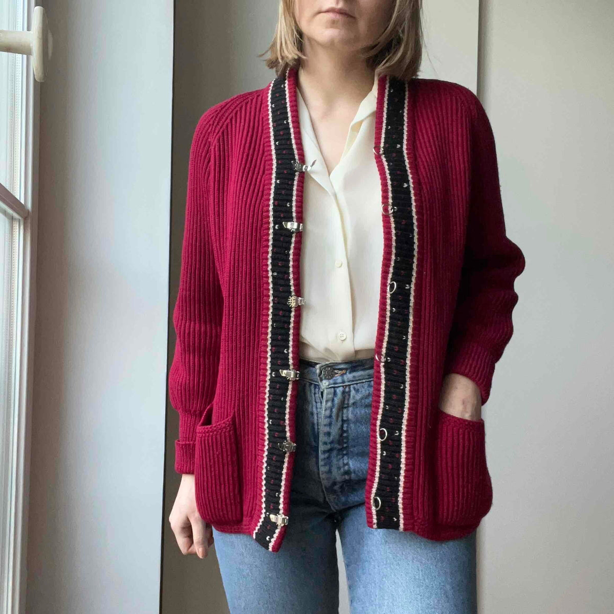 Prix unitaire parCardigan oversize en laine rouge bordeaux avec des détails noir. Fermeture par des crochets en métal argenté. Taille 36 à 40.