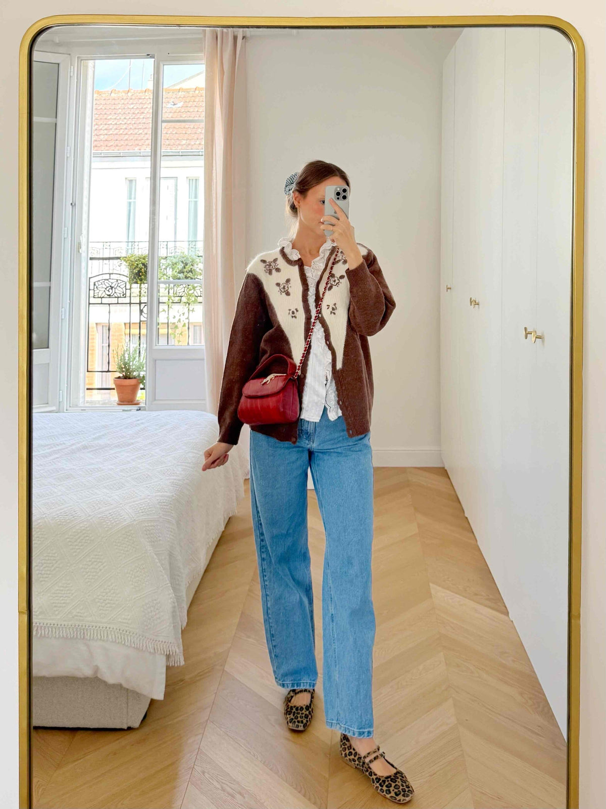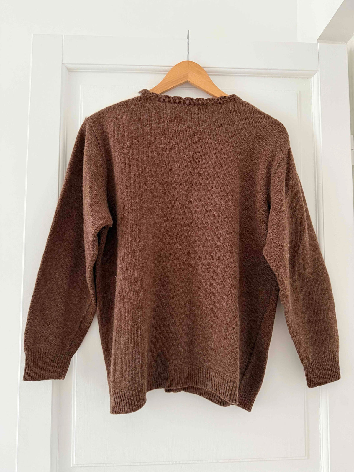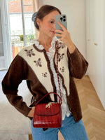Cardigan en laine marron et angora blanc, orné de jolis motifs fleuris sur le buste. Col rond, manches longues et boutonnage sur le devant. Doux, chaud et made in France. Porté ici sur une T36 pour 1m64