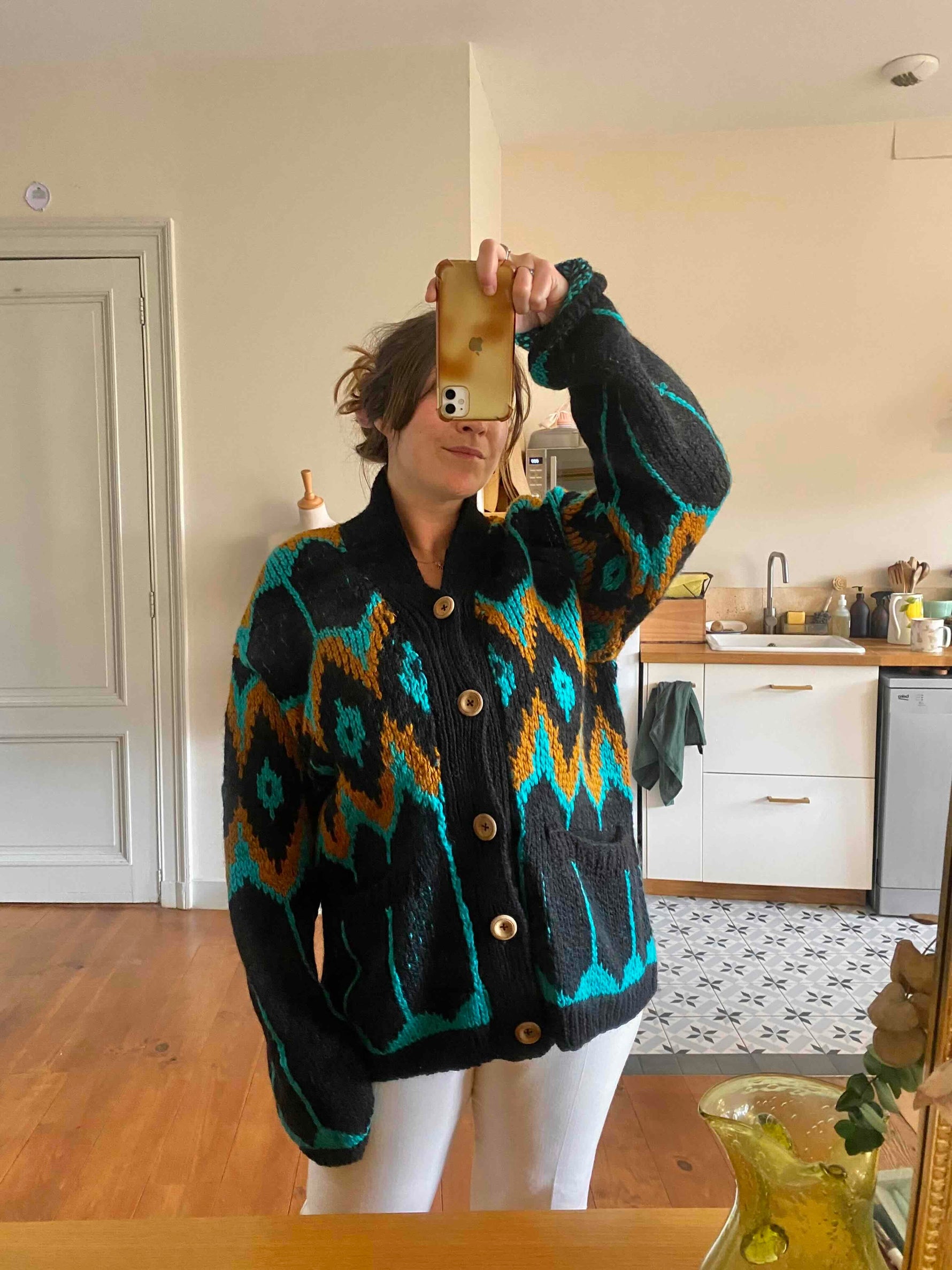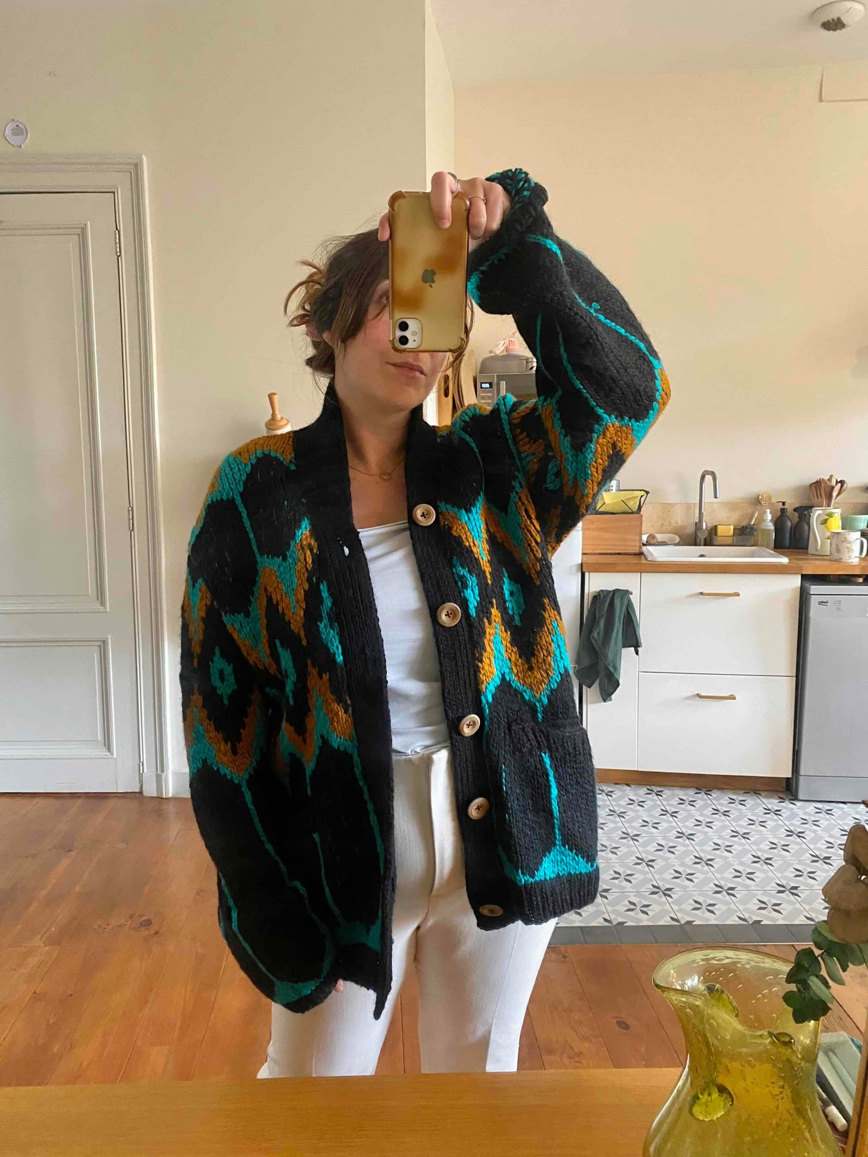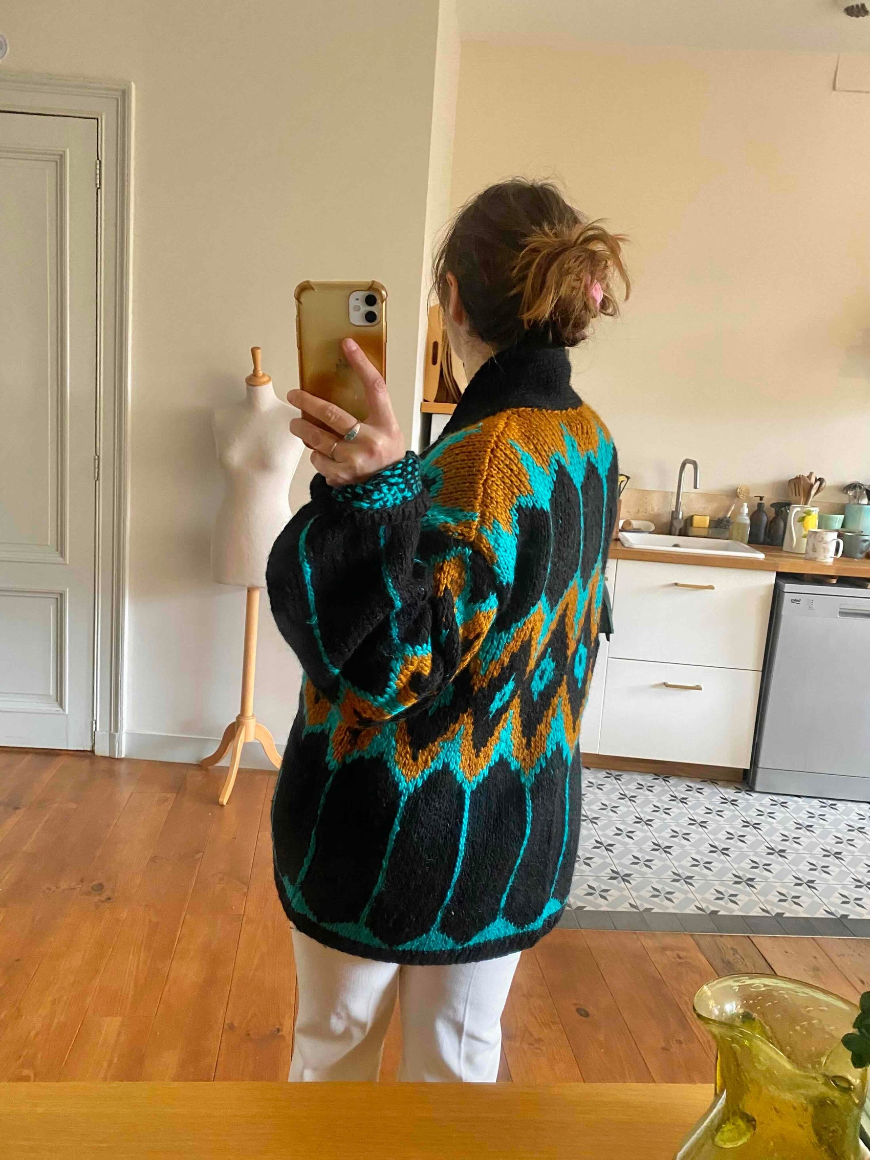 Cardigan en Jacquard 80’s, en laine mélangée noire motifs jacquard ikats caramel et vert menthe, col châle, boutons en bois, forme oversize, tricotté mains, taille 40 porté ici sur une personne T40.