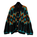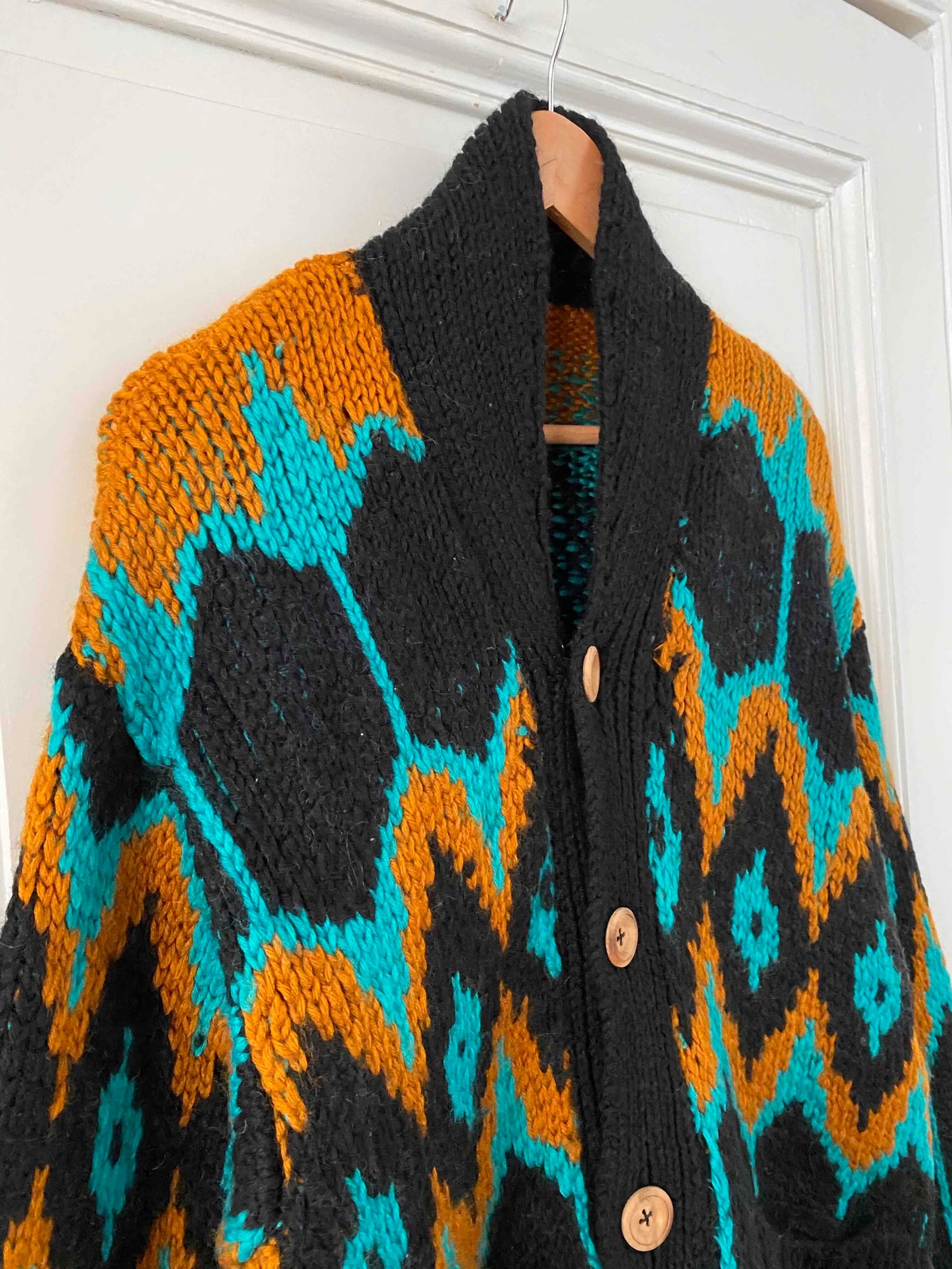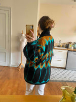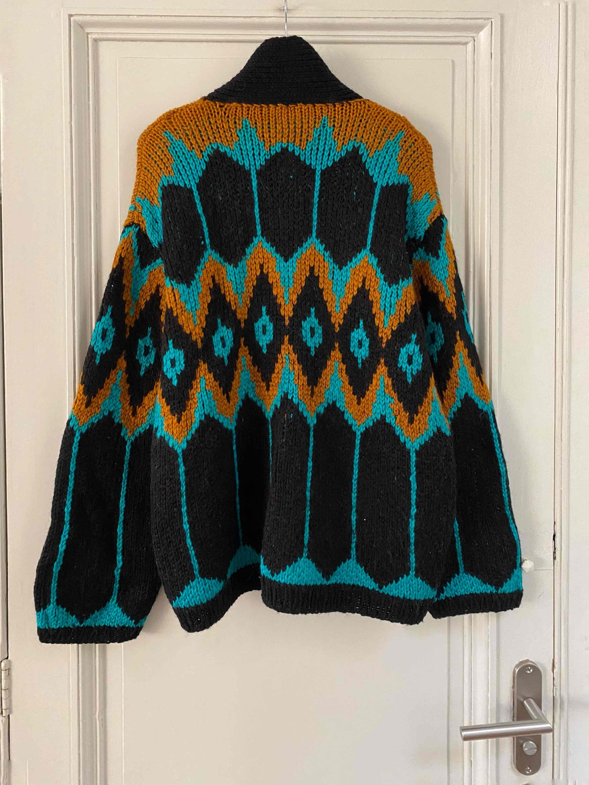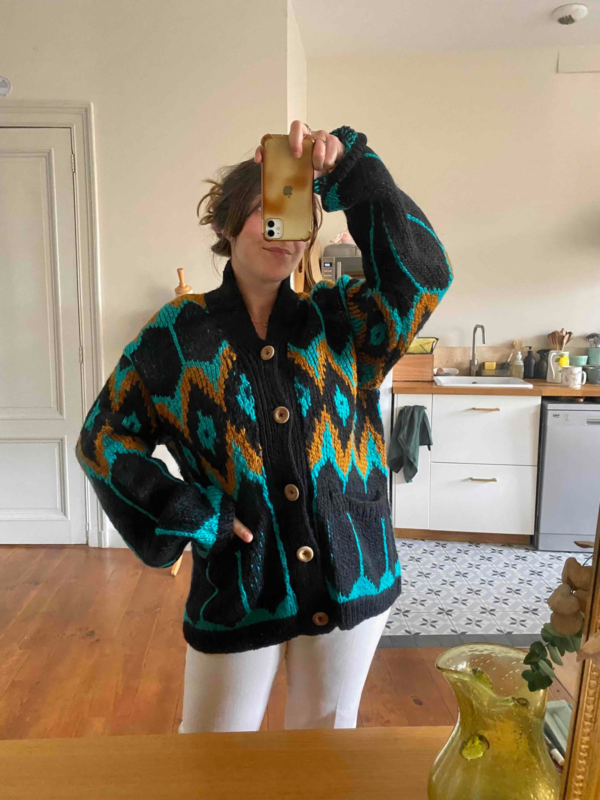 Cardigan en Jacquard 80’s, en laine mélangée noire motifs jacquard ikats caramel et vert menthe, col châle, boutons en bois, forme oversize, tricotté mains, taille 40 porté ici sur une personne T40.