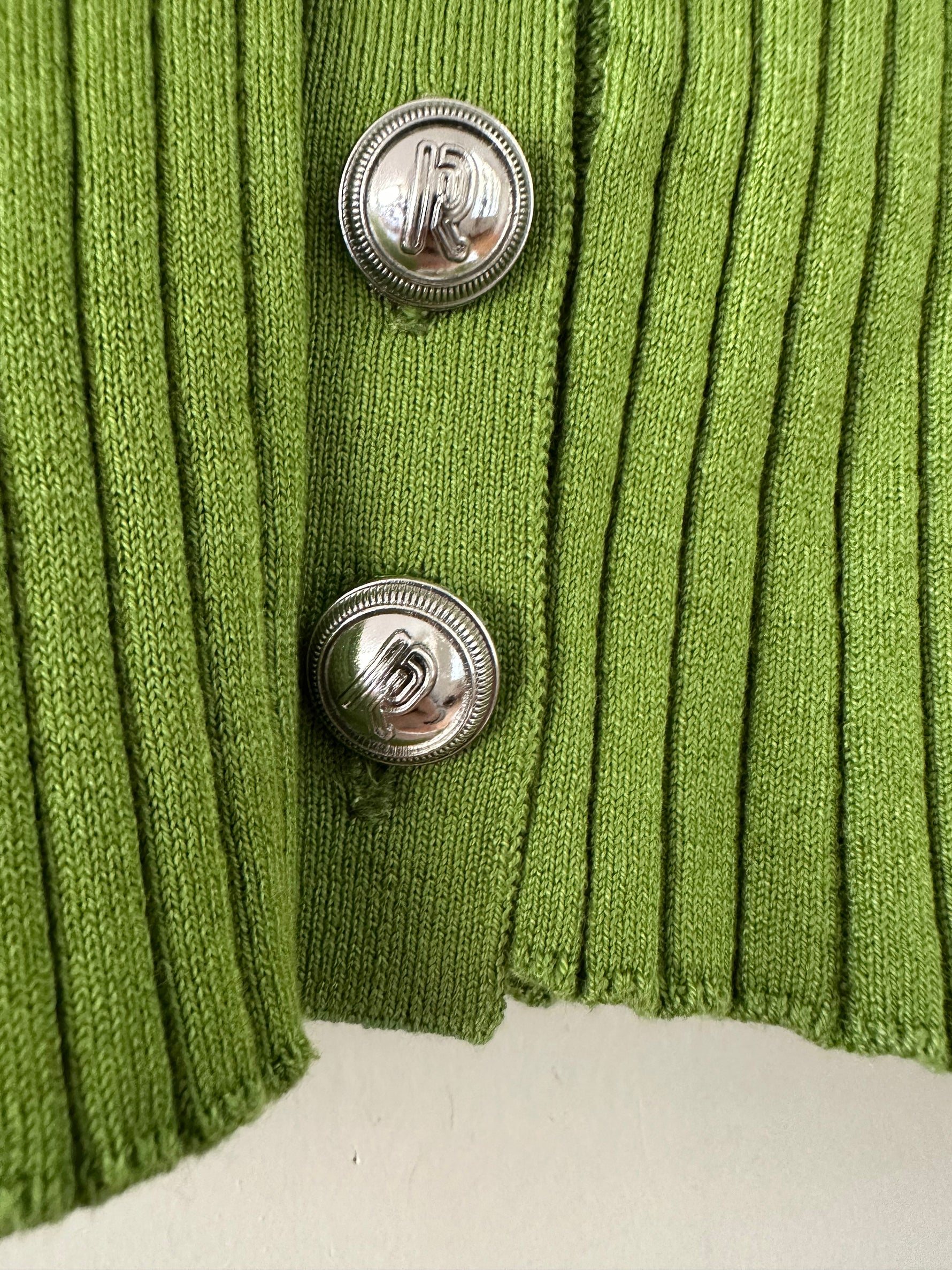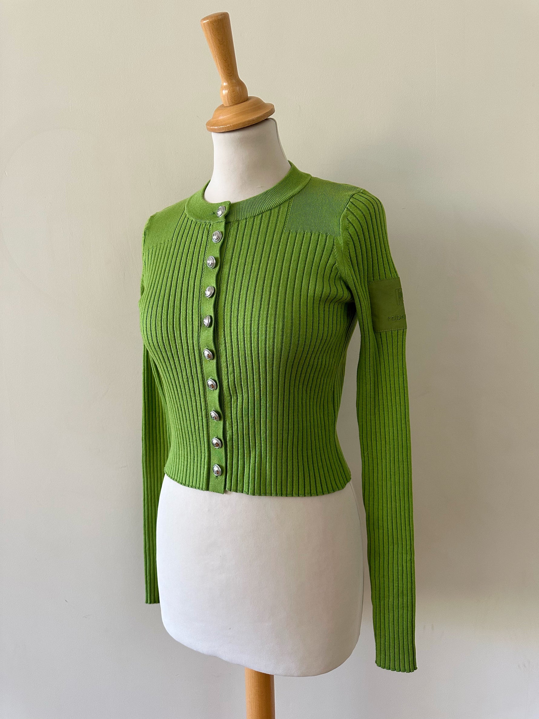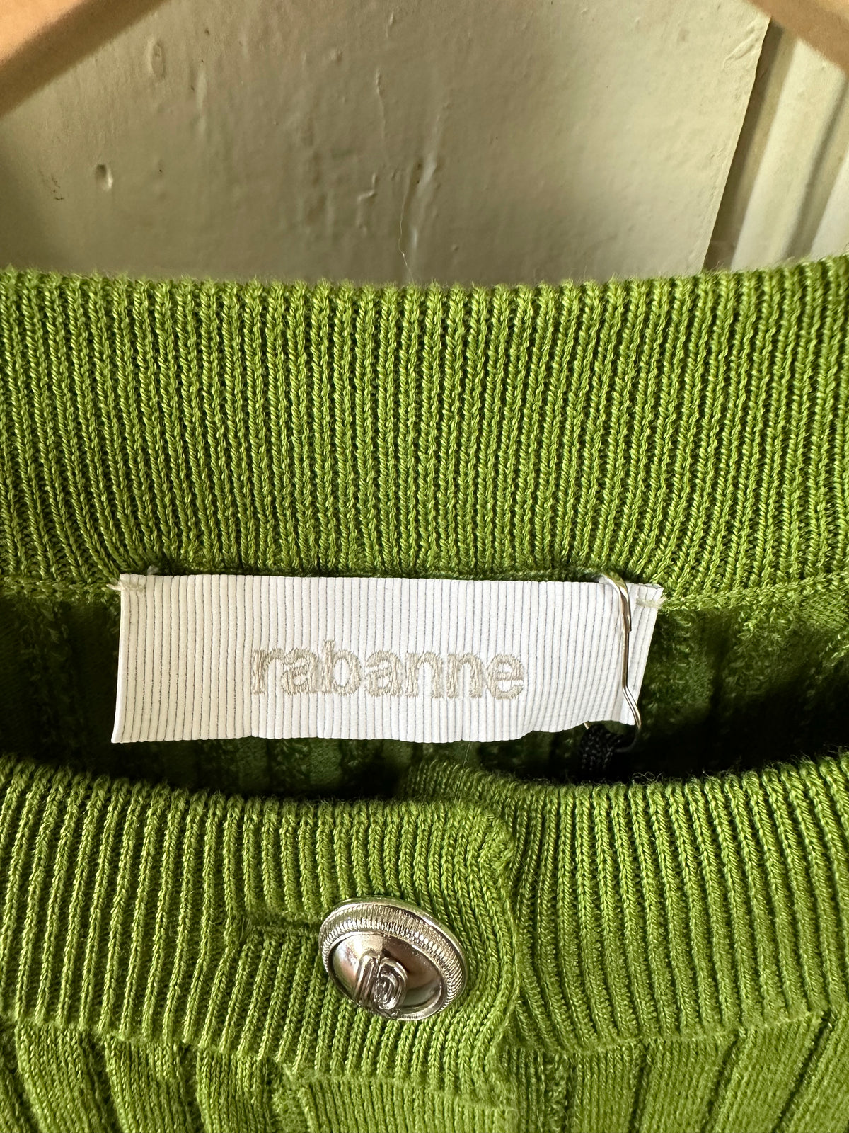 Prix unitaire parCardigan Paco Rabanne en 100% coton, maille côtelée vert olive, boutons bijoux argentés griffés, forme courte. Neuf avec étiquettes d'origine.Taille 36 portée ici sur un mannequin T36. Longueur 45cm.