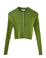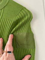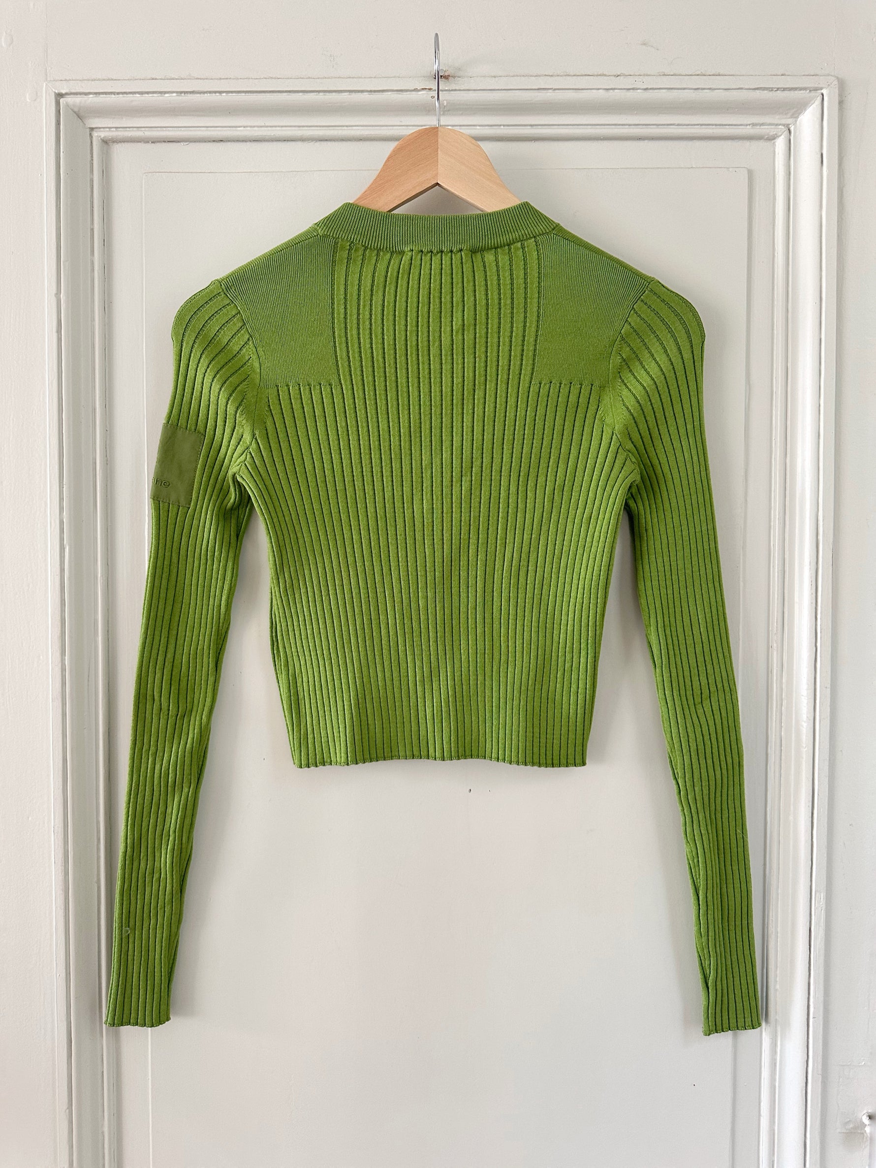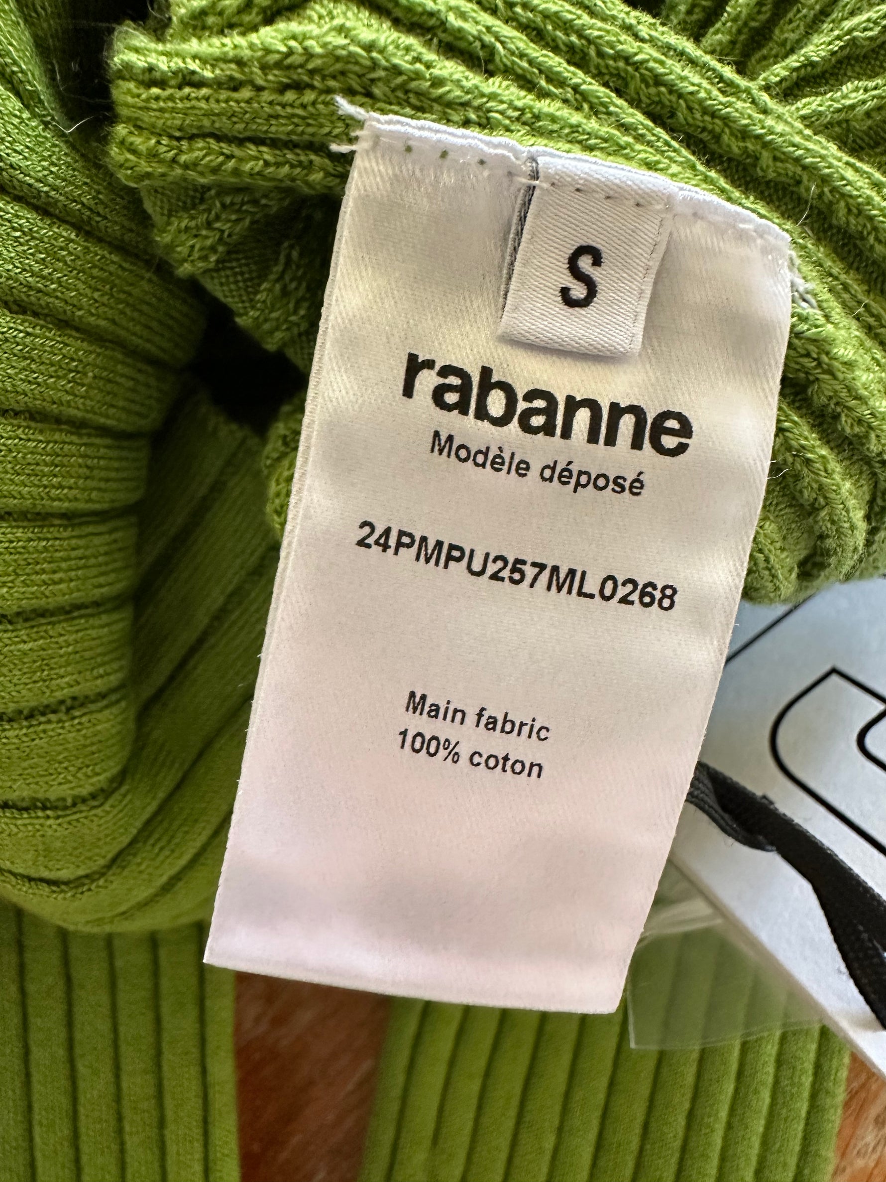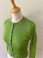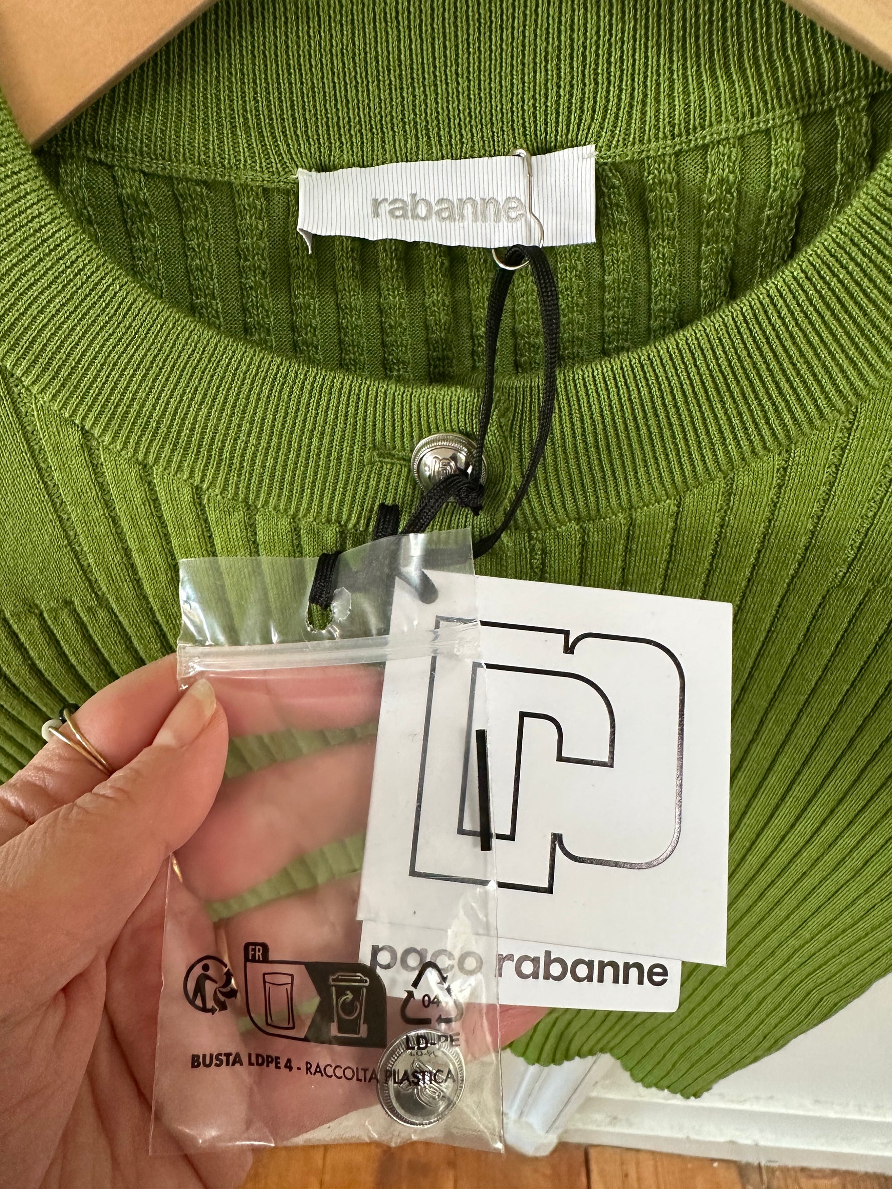 Prix unitaire parCardigan Paco Rabanne en 100% coton, maille côtelée vert olive, boutons bijoux argentés griffés, forme courte. Neuf avec étiquettes d'origine.Taille 36 portée ici sur un mannequin T36. Longueur 45cm.