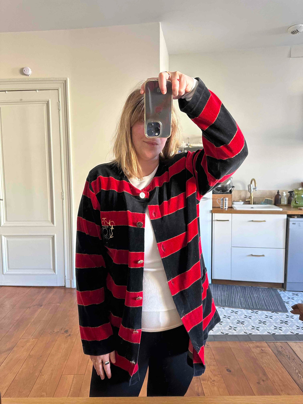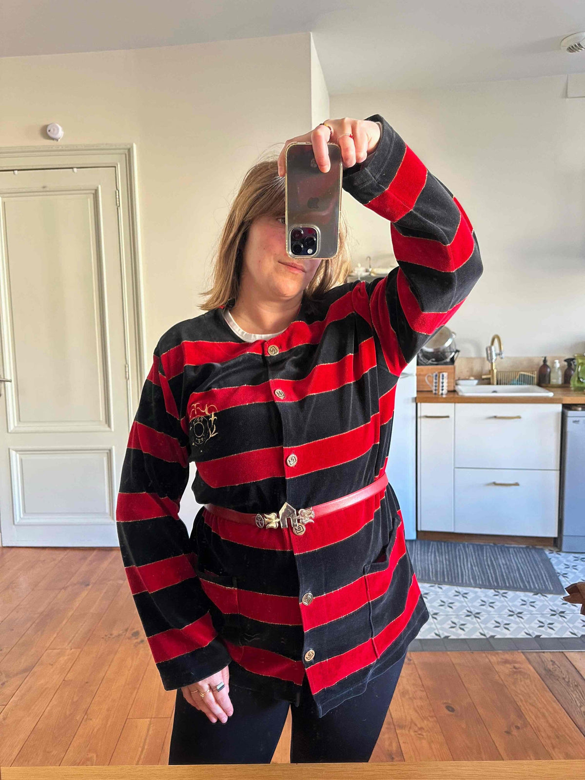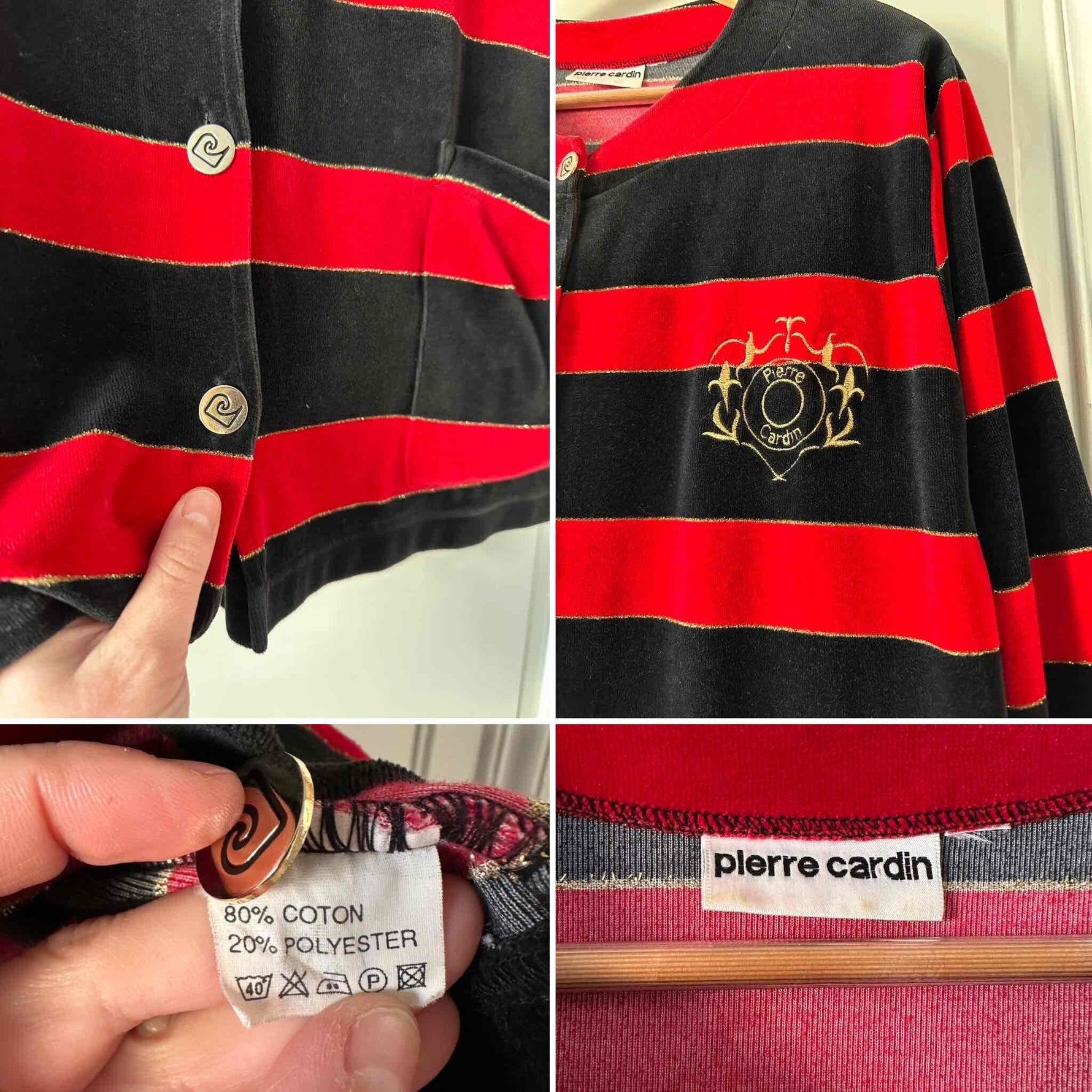 Cardigan marinière Pierre Cardin, en velours jersey noir rayures rouges et lurex doré, boutons gravés de la griffe dorés, fabriqué en France, convient aux tailles 38/40/42 porté ici sur une personne T40.
