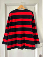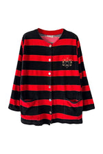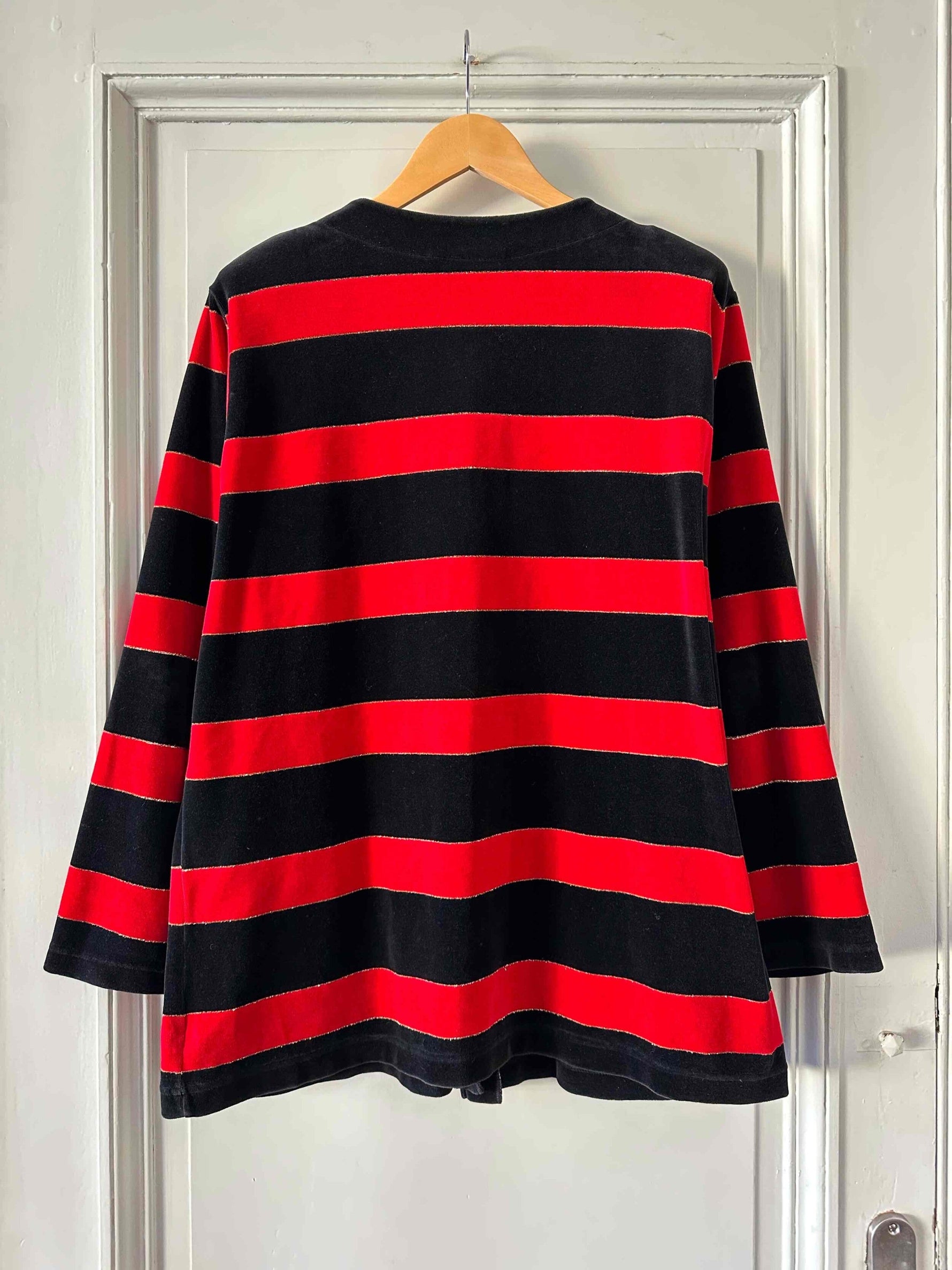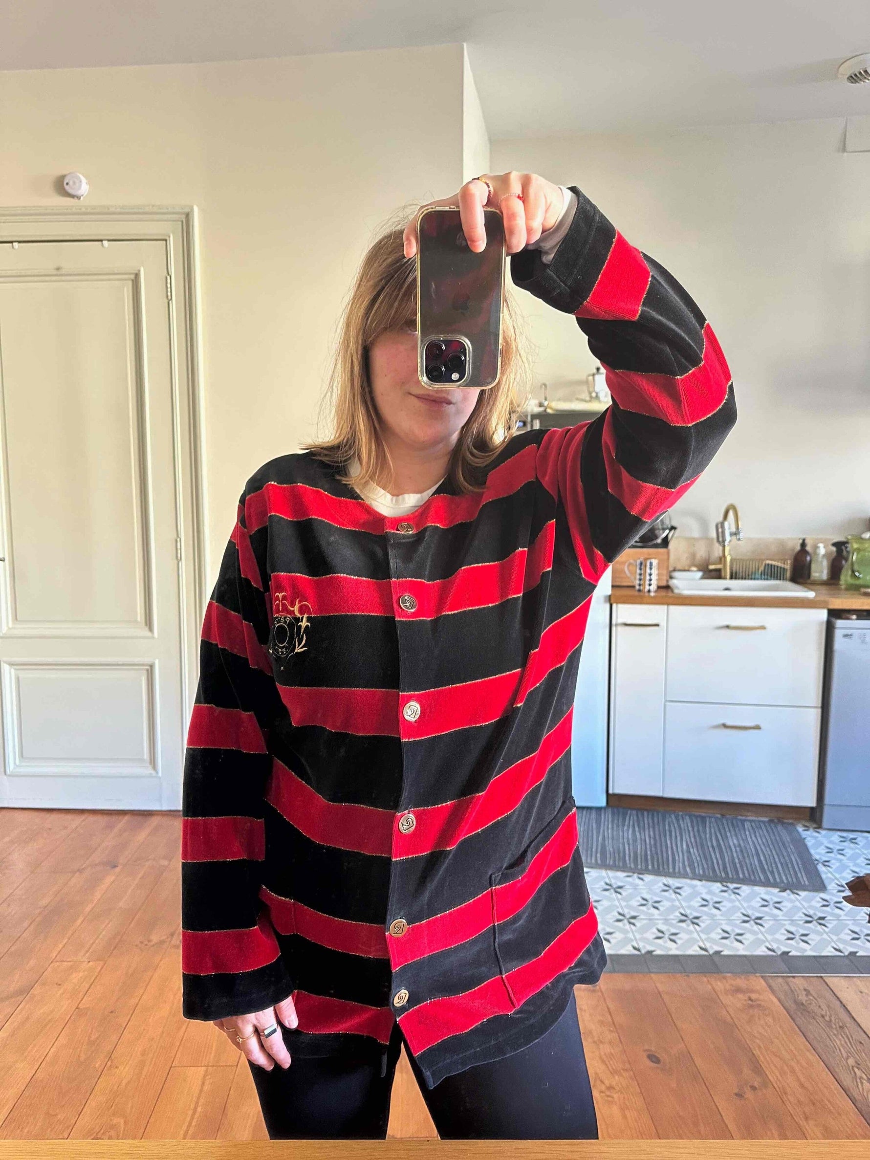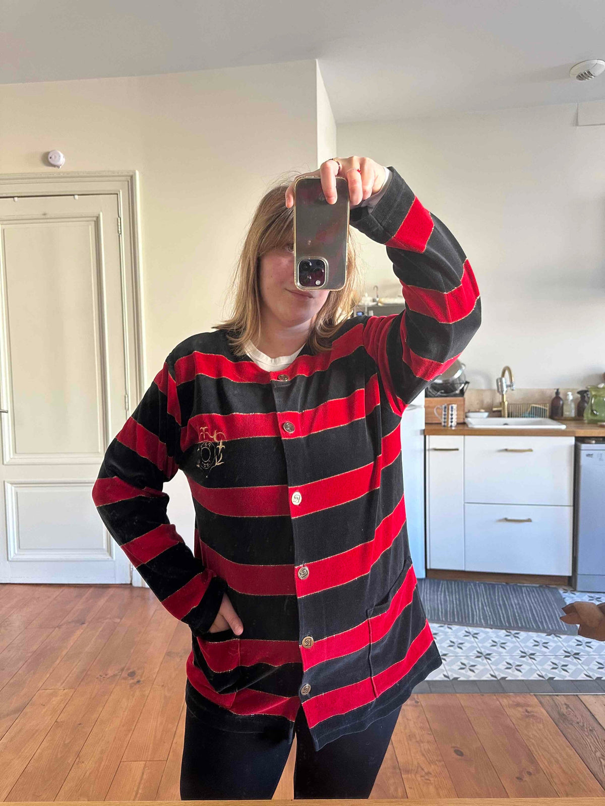 Cardigan marinière Pierre Cardin, en velours jersey noir rayures rouges et lurex doré, boutons gravés de la griffe dorés, fabriqué en France, convient aux tailles 38/40/42 porté ici sur une personne T40.