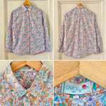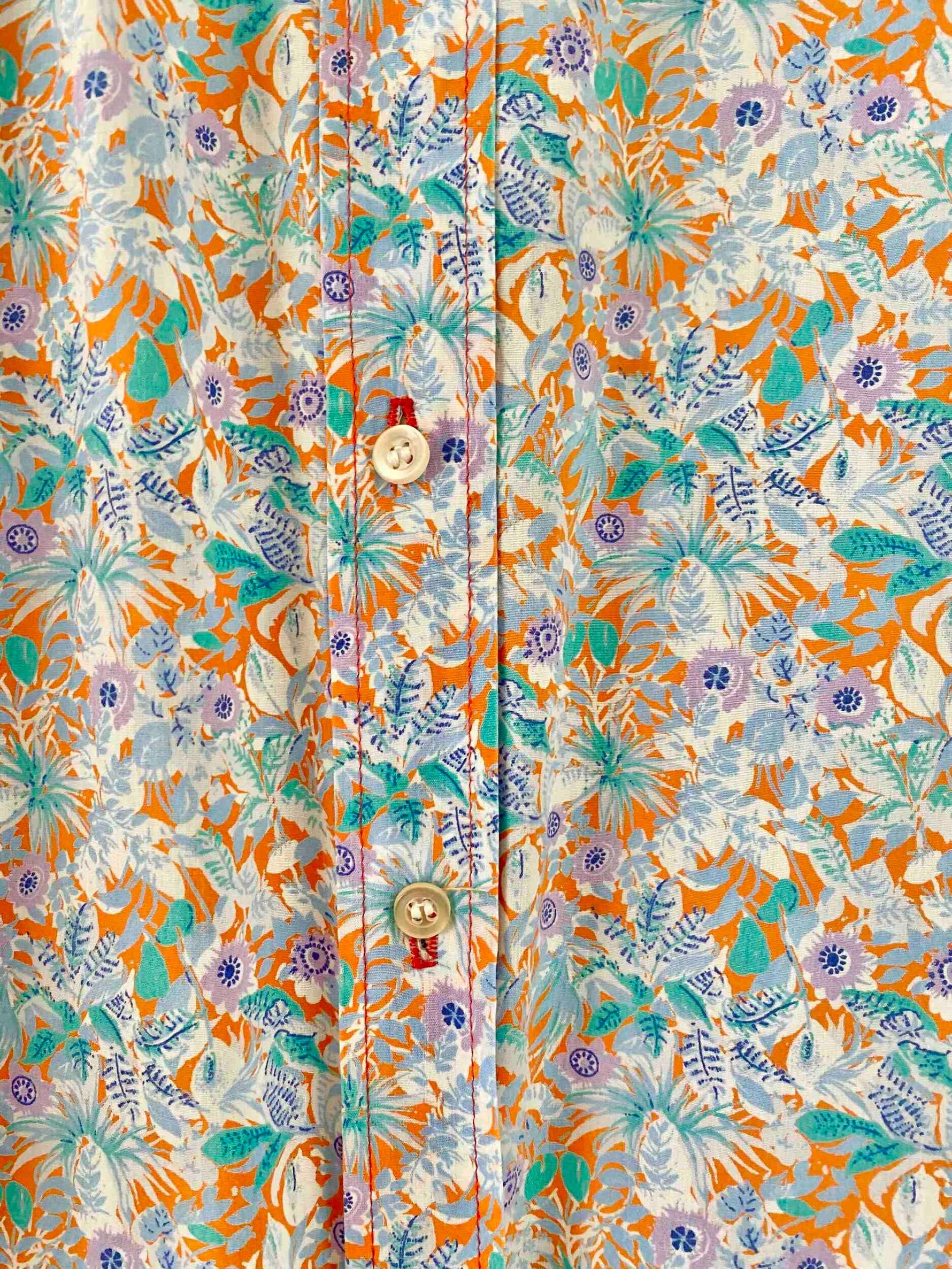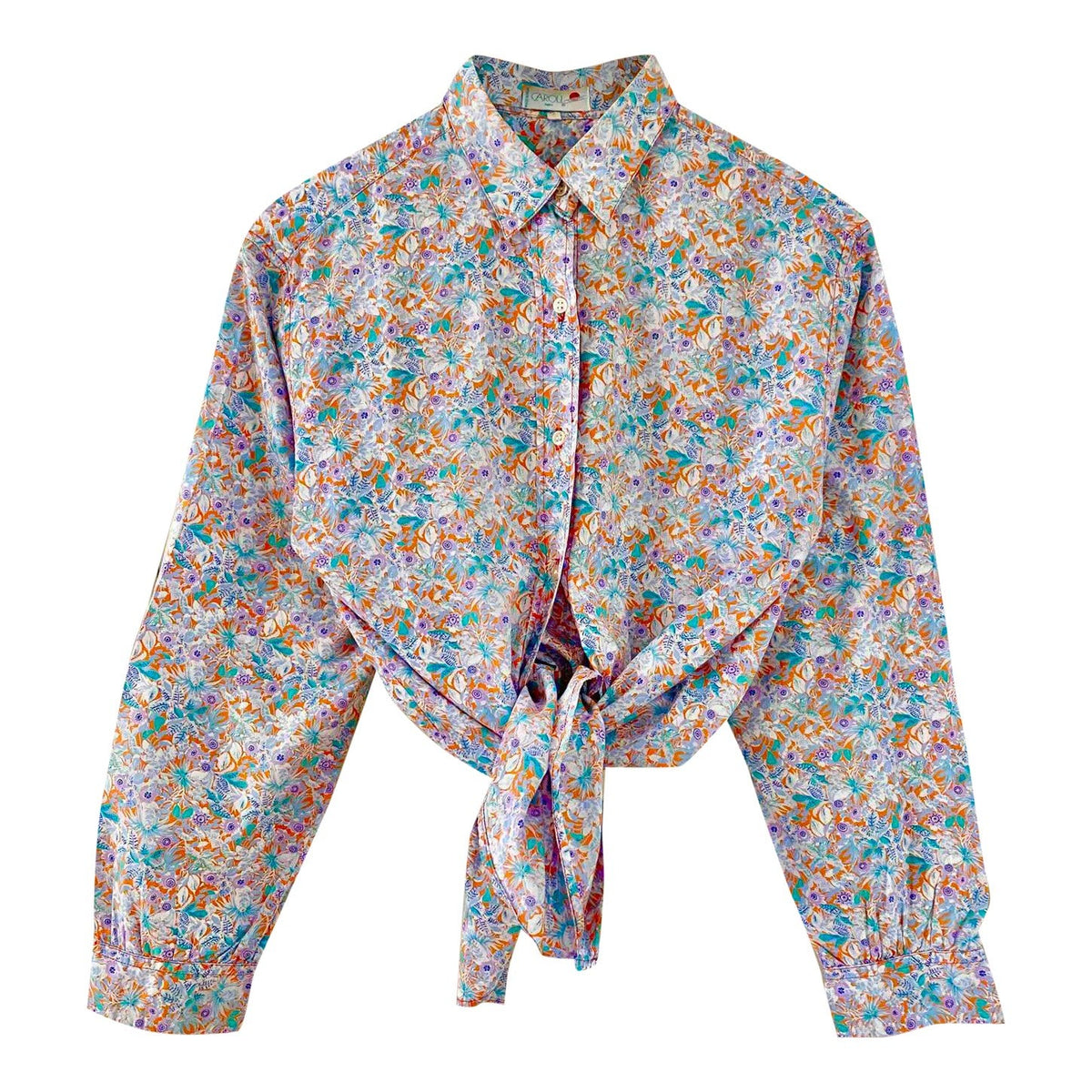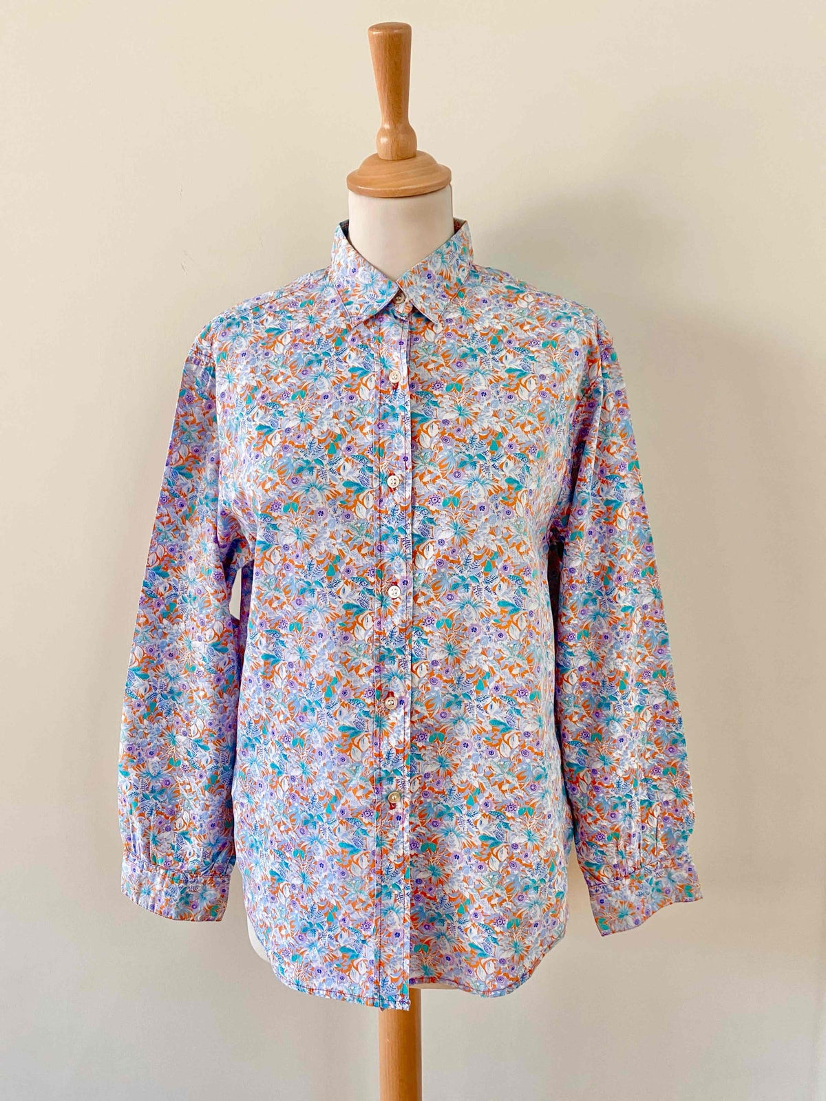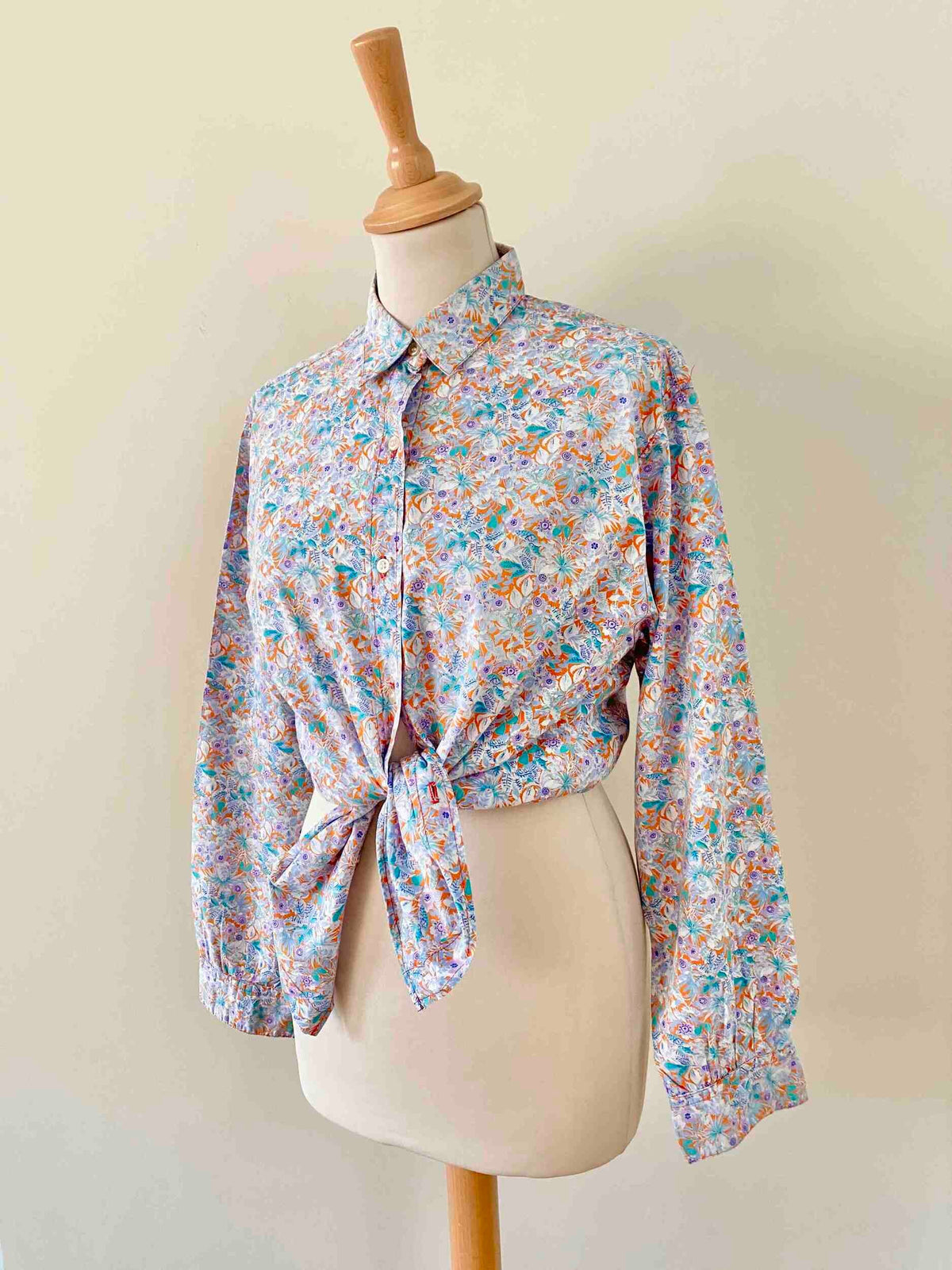 Prix unitaire parChemisier liberty en coton imprimé fleurs orange, lilas, pastel et bleues, Caroll années 80’s, fabriquée en France.